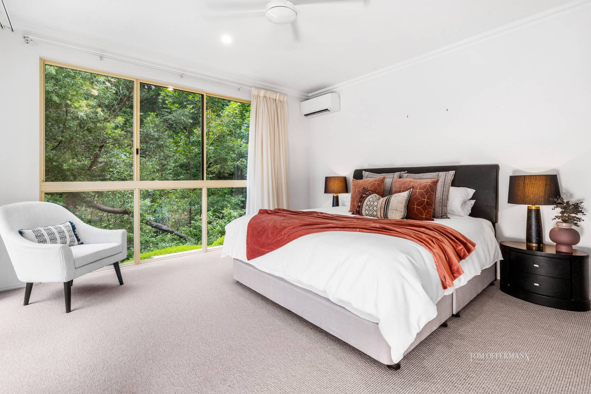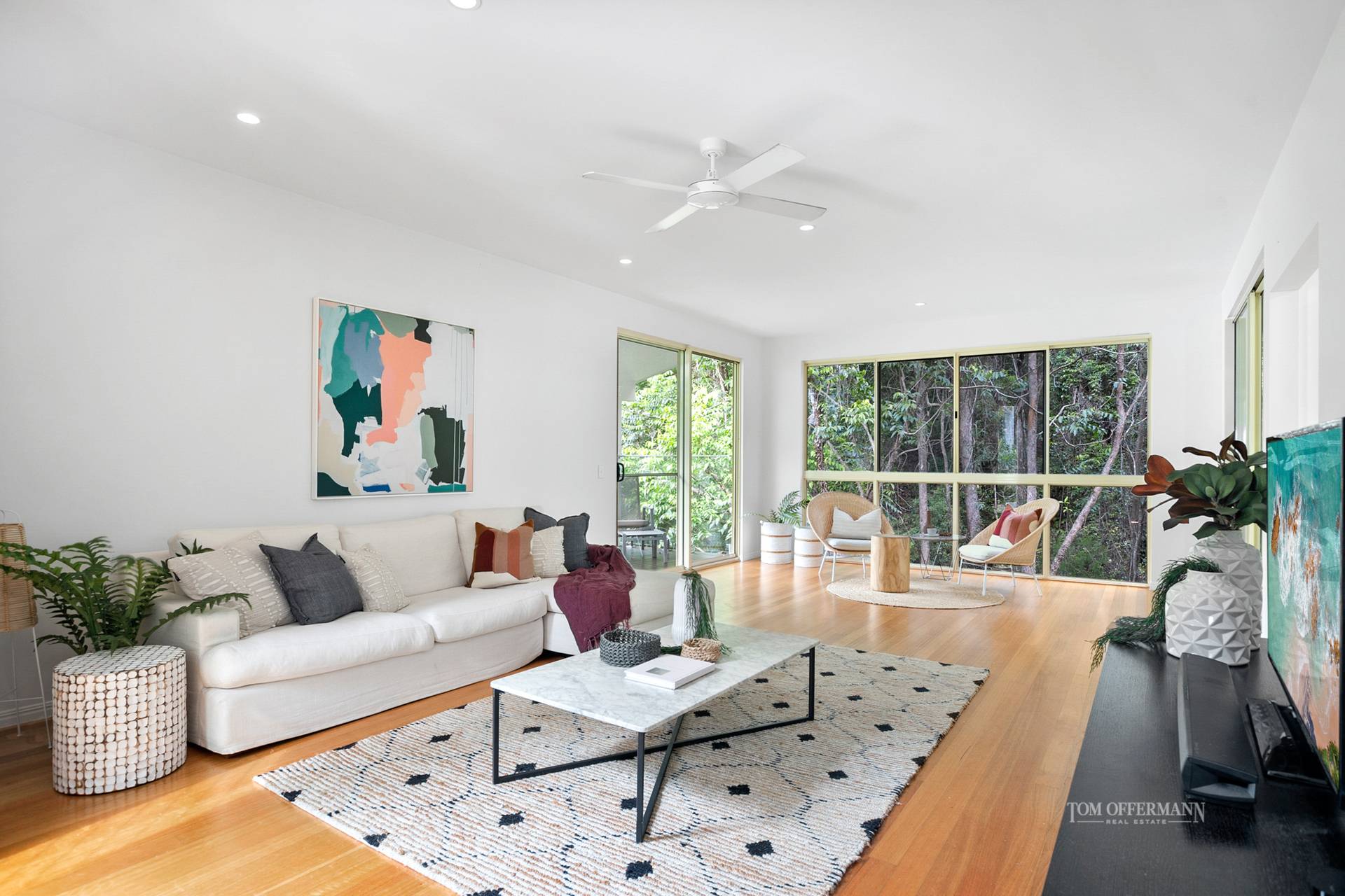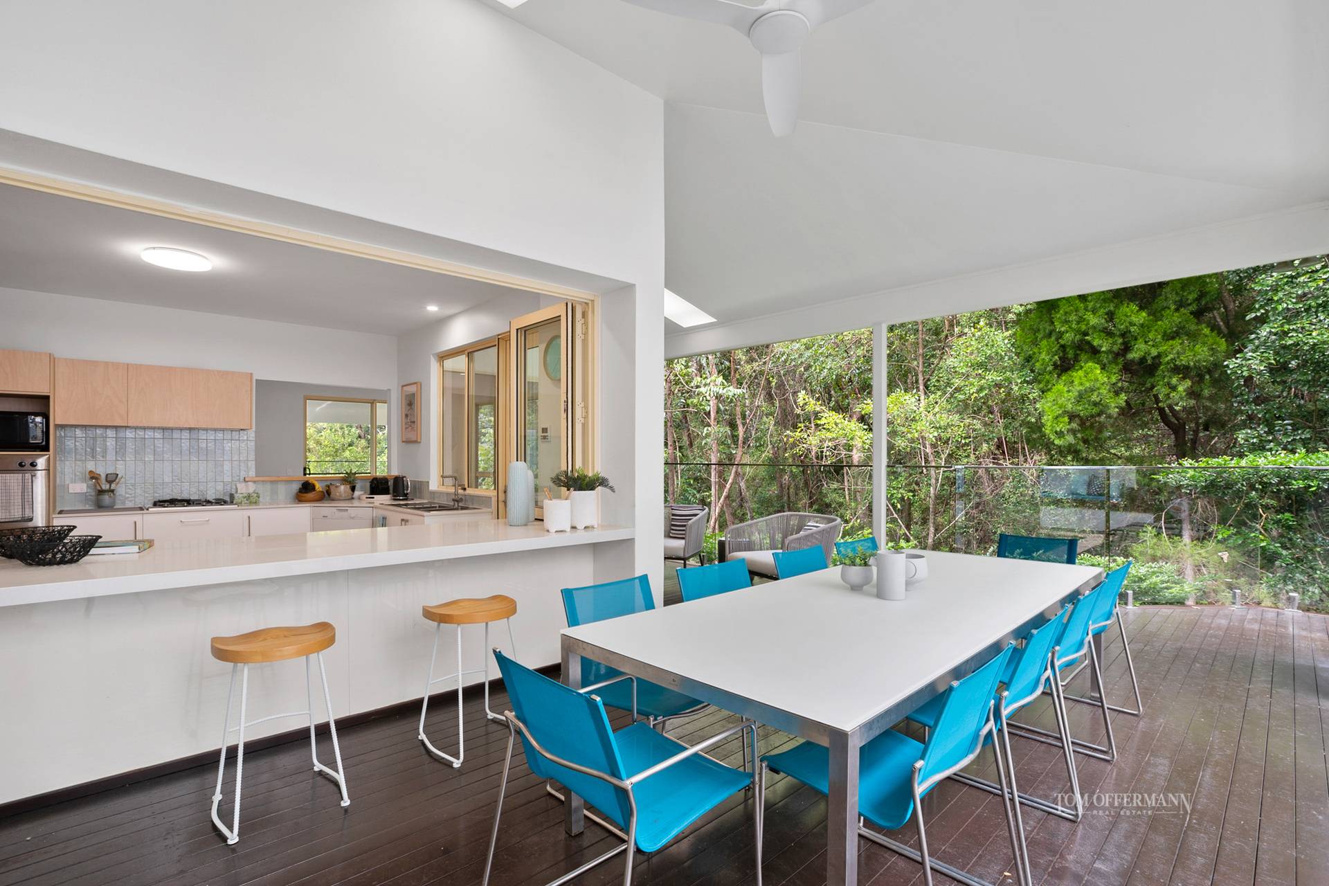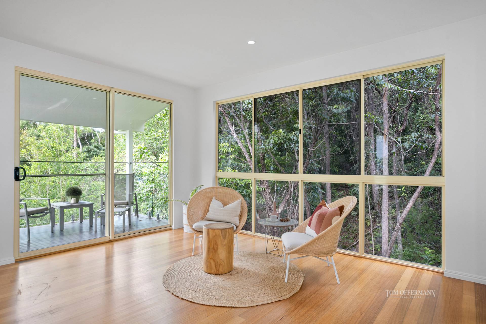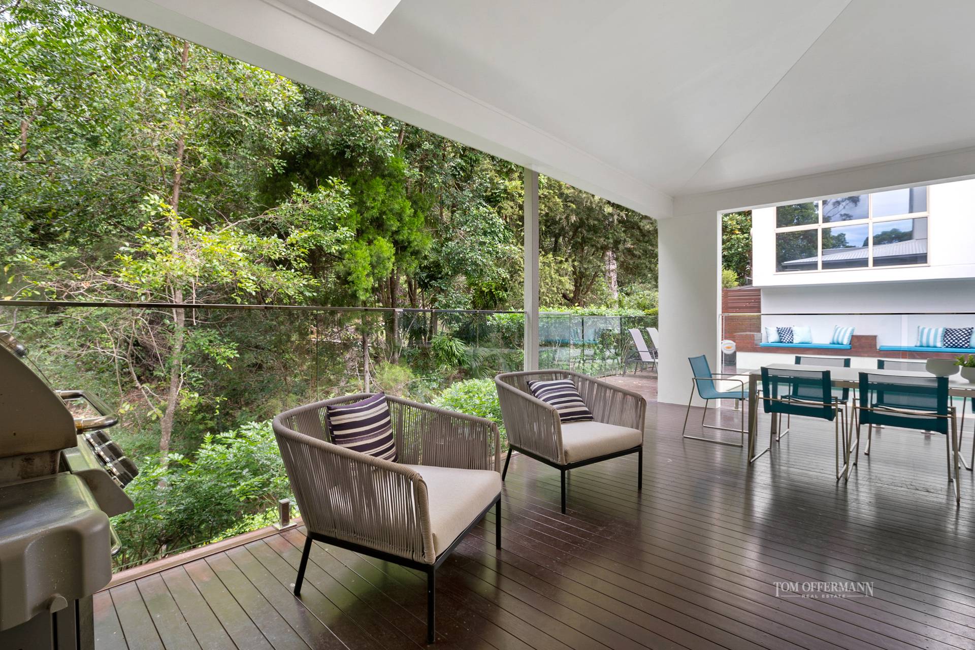 Over-generous, open plan living and dining spaces in the north and easterly wings, are connected to the terraces via numerous 'disappearing' glass sliders which coalesce naturally with outdoors. A few steps down to a pathway lead to the rainforest where tall eucalypts attract koalas, and peace reigns, except for native birds trilling and the creek trickling over rocks.