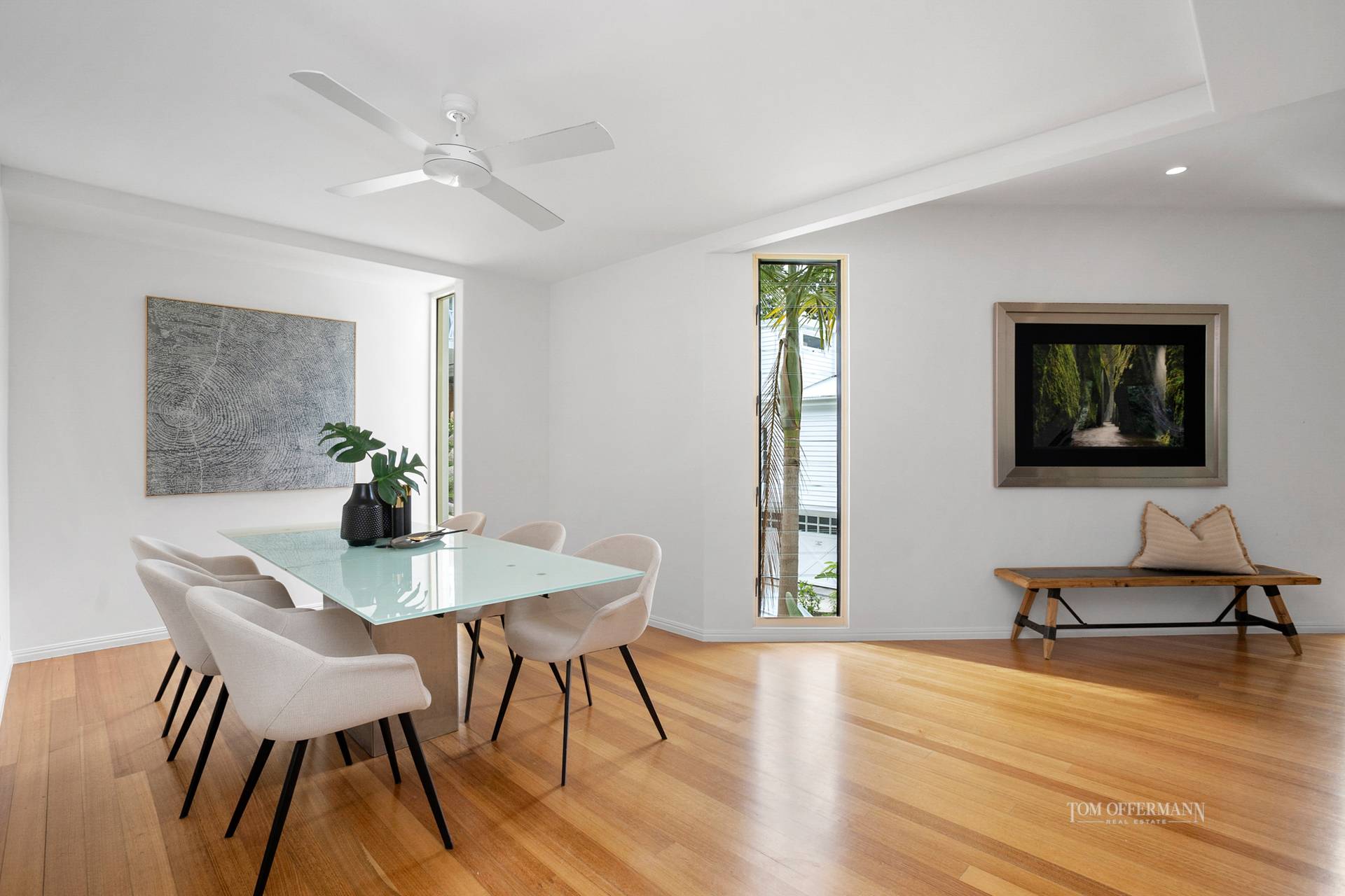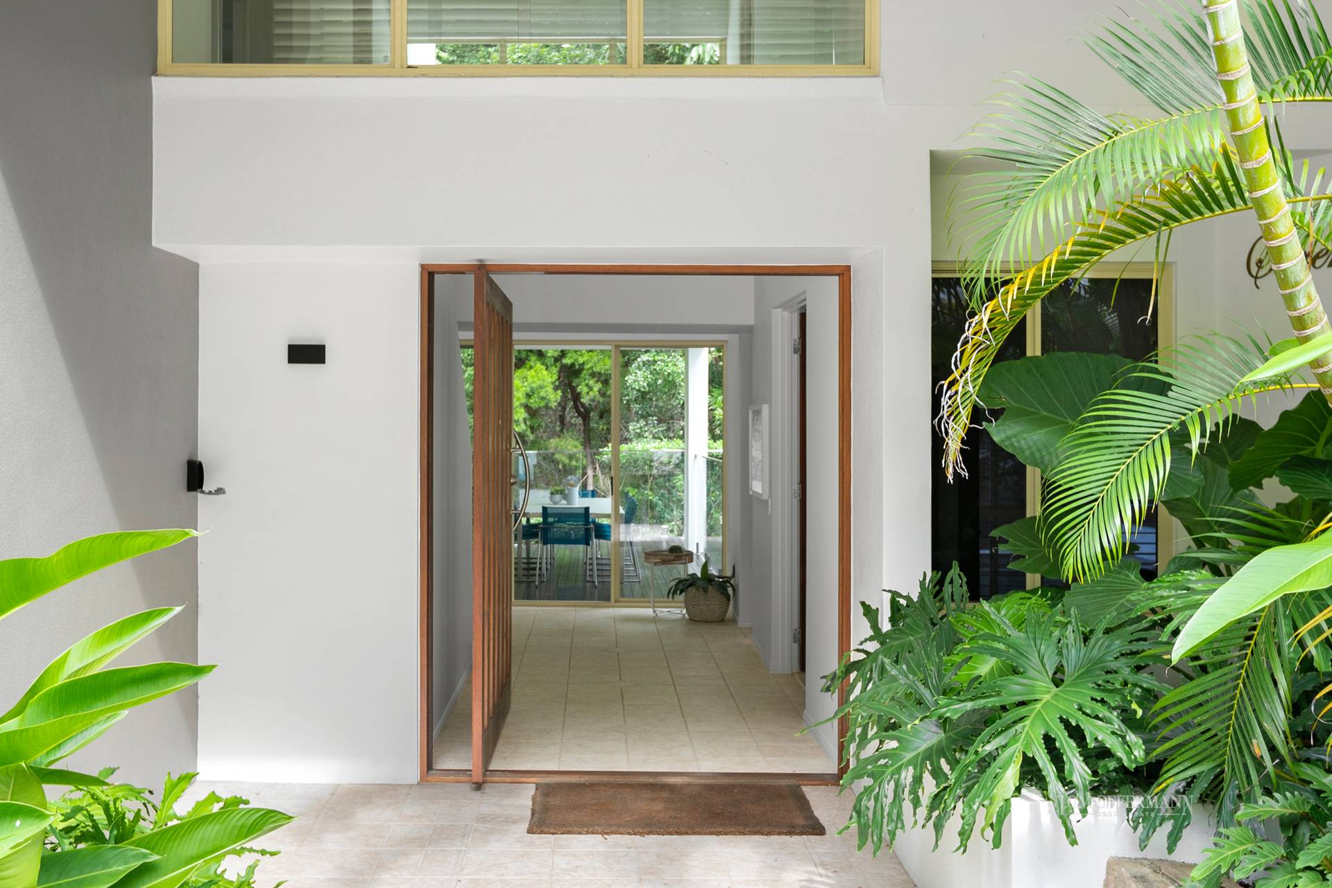 From the driveway, beautiful frangipanis, heliconia, bromeliads and golden cane palms at the front entrance, are an appropriate nod to the sub-tropics. Open the impressive glass and timber framed door into the pared-back lobby, note the quality build, contemporary aesthetic, warm soft palate and expansive double height windows attracting light through the void and shadow dancing across the honey-hued Tassie oak floors.