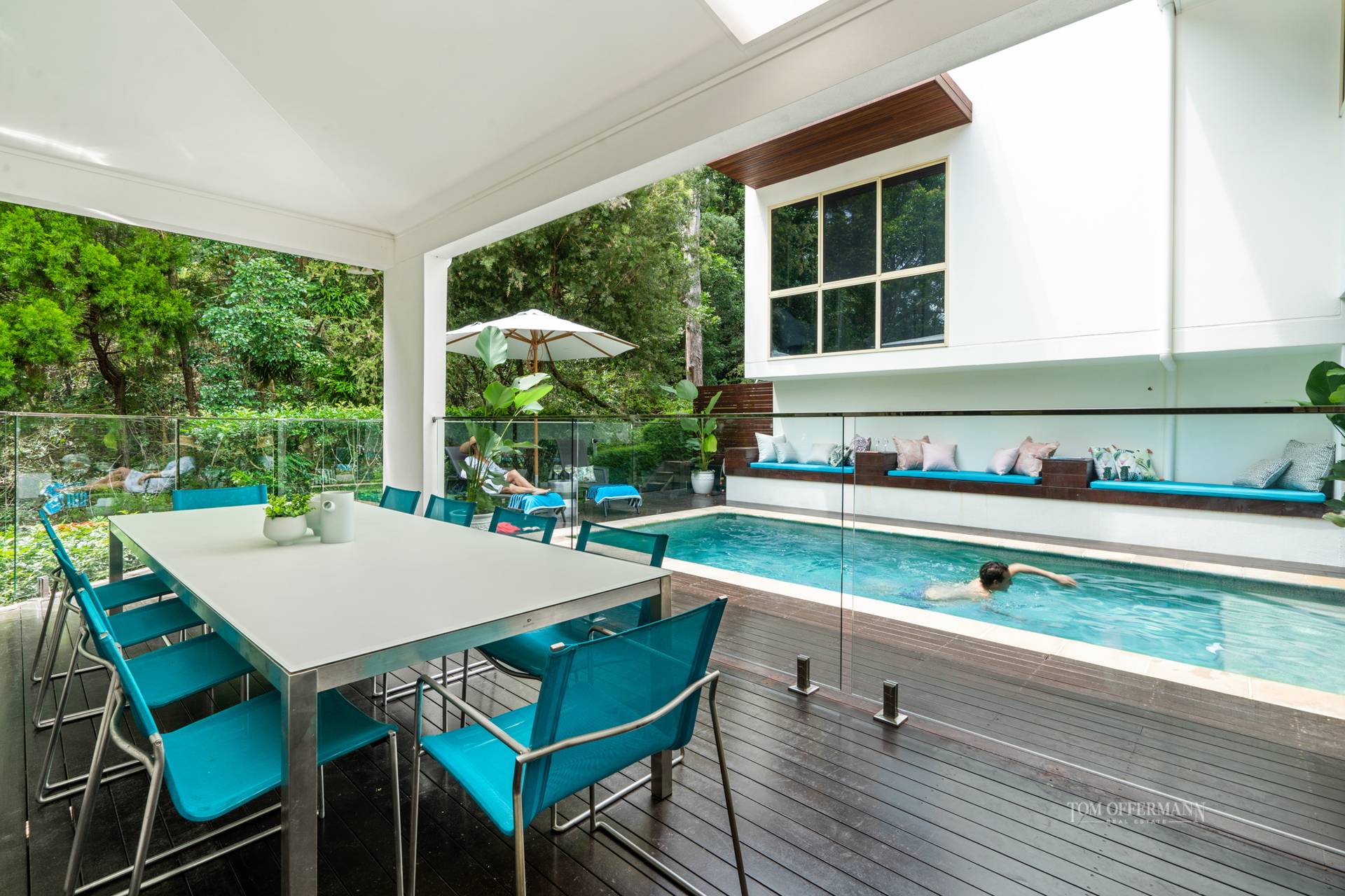 Look ahead and instantly picture the good life alfresco. A dazzling pool with custom timber sun lounges, surrounded in its entirety by expansive undercover terraces, and complemented by a lush green backdrop, takes complete centre stage. It suggests serious year-round summery vibes and a menu of easy-going days and nights of entertaining and family fun.