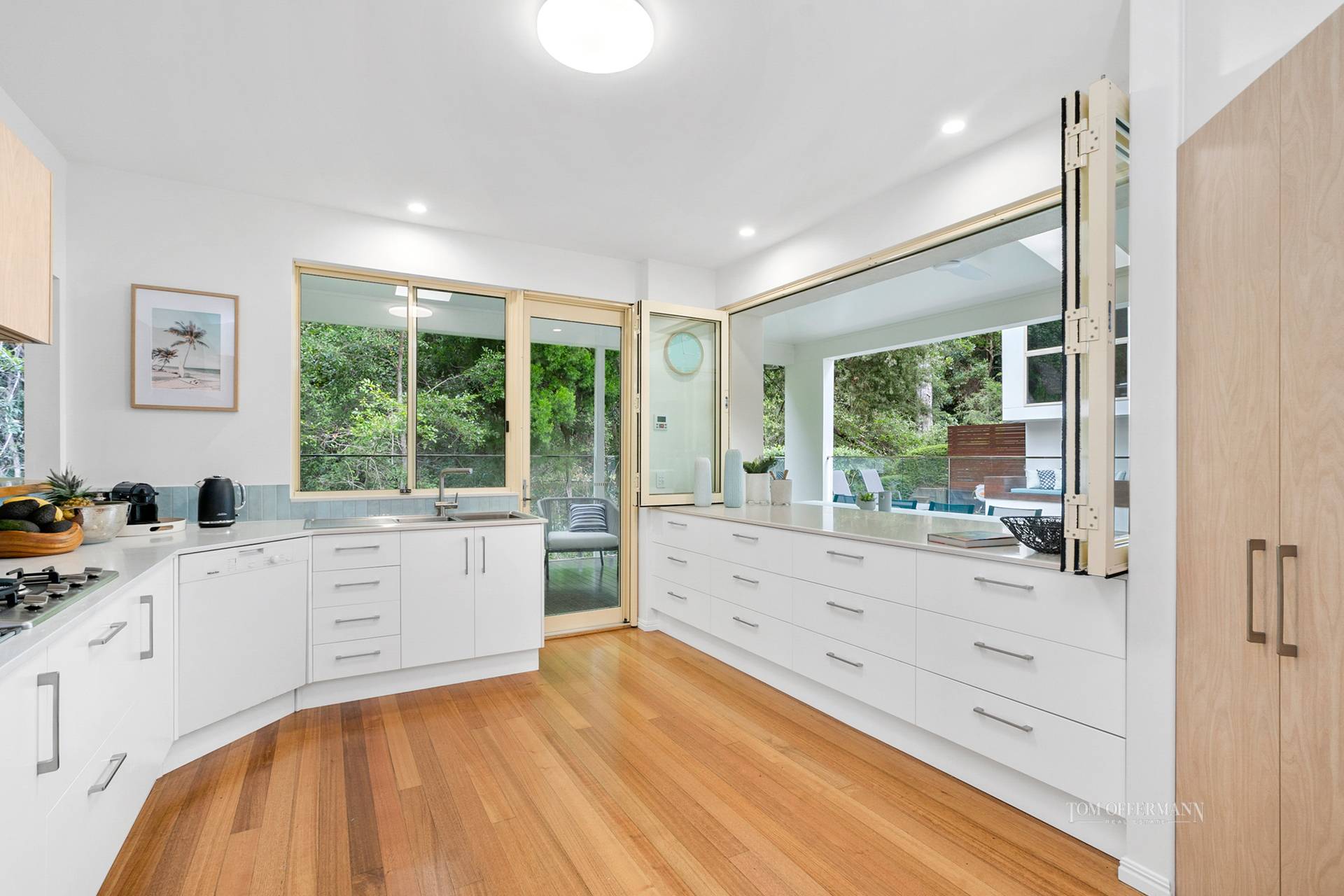 - Kitchen: C-shaped w creamy stone bench tops/2pac cabinetry incl pantry; serveries to living area + undercover alfresco terrace poolside; Westinghouse fridge; Miele dishwasher & 4 x burner gas hob