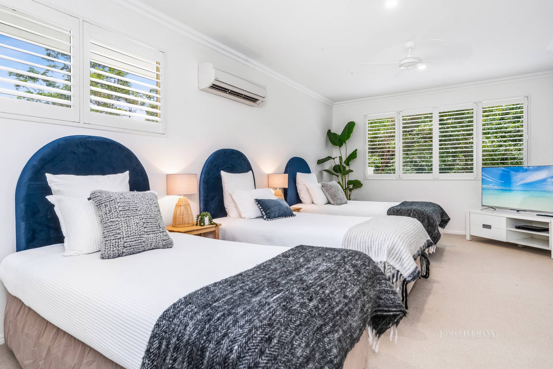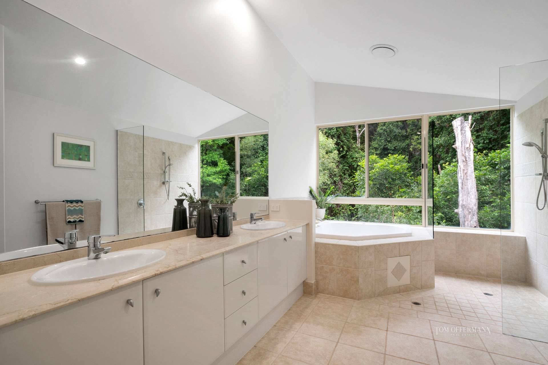 - About: Tasmanian oak floors; carpeted bedrooms: 2 king master suites on different levels w identical fit-out of walk-in robe; dressing room, ensuite w corner spa & dble vanity, walk-in shower + views over pool & national park; 3rd bedroom w 3 king singles, built-in robe, ensuite & adjacent store; 4th bedroom downstairs w 2 king singles, walk-in robe and bathroom next door; aircon/fans; high ceilings, plantation shutters & glass bricks; dble internal access from garage; laundry w washing machine, dryer & linen store; garage w storage