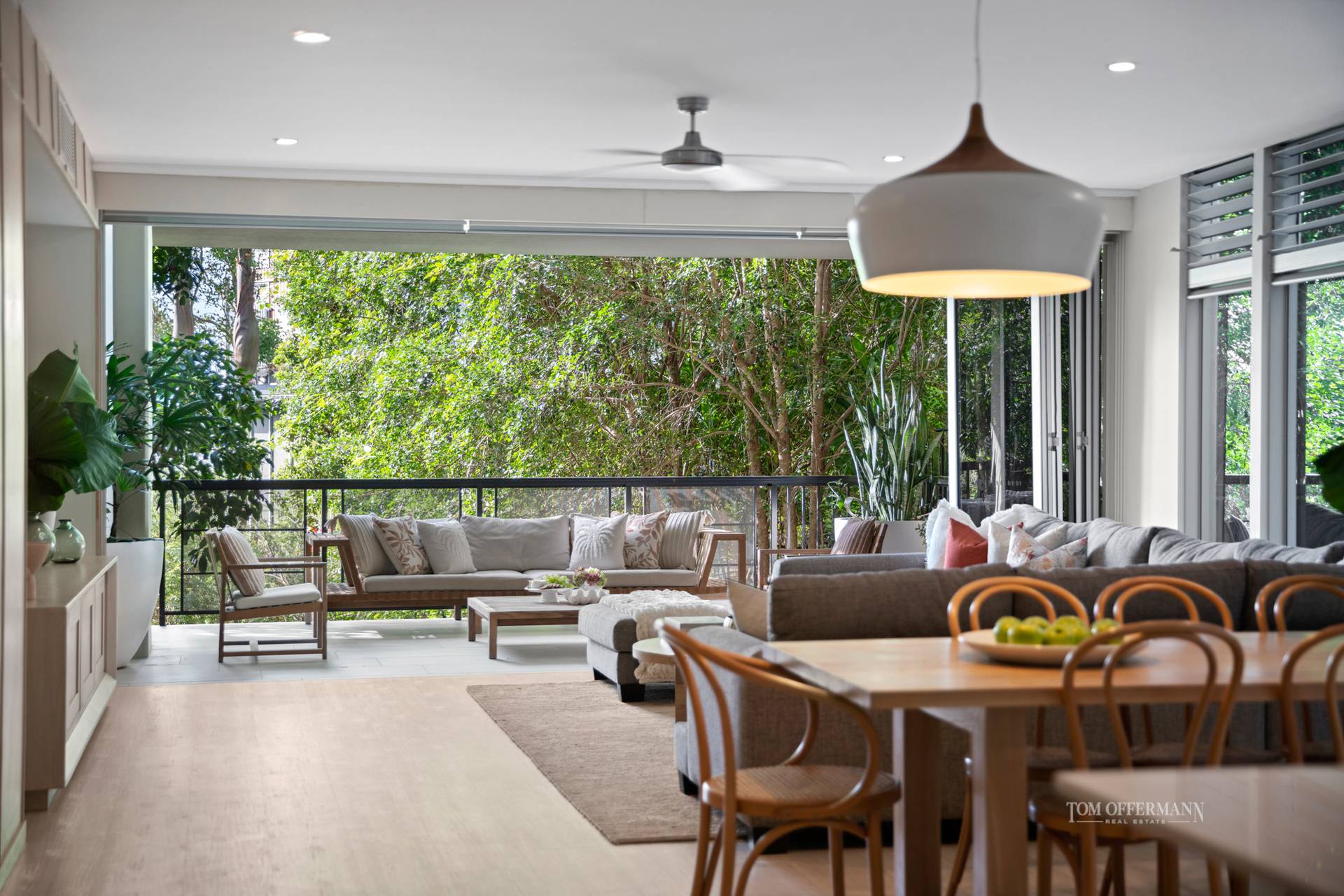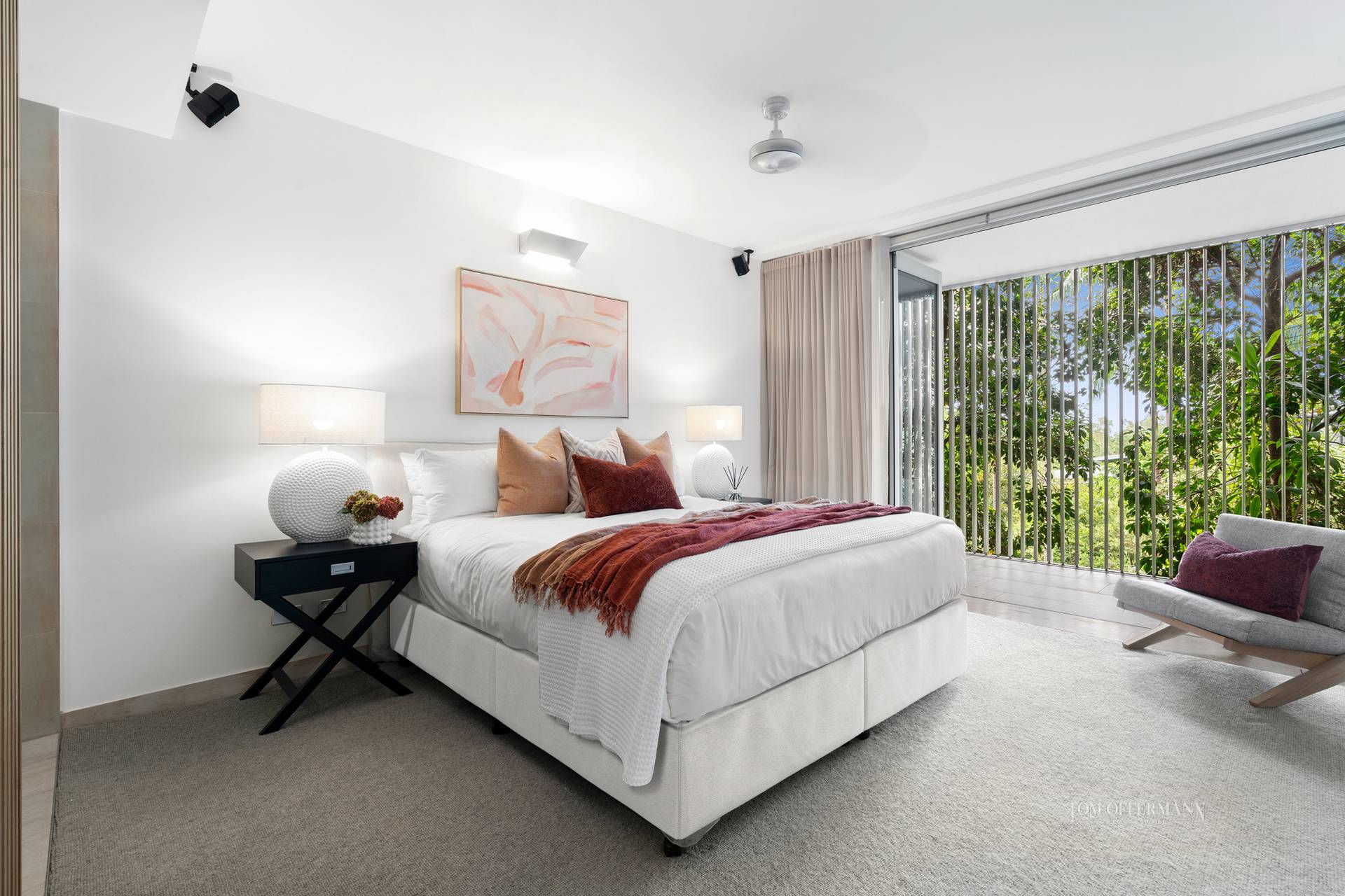 Perched seemingly in a canopy of rainforest trees, on the high side of the hill, yet on the ground level, it has vast undercover terraces reminiscent of the Mediterranean, which entirely wrap two sides. To the north are uninterrupted verdant vistas and on the east side, the good life alfresco is fringed by nature, albeit a garden wall tinged with greenery common to the adjoining national park.