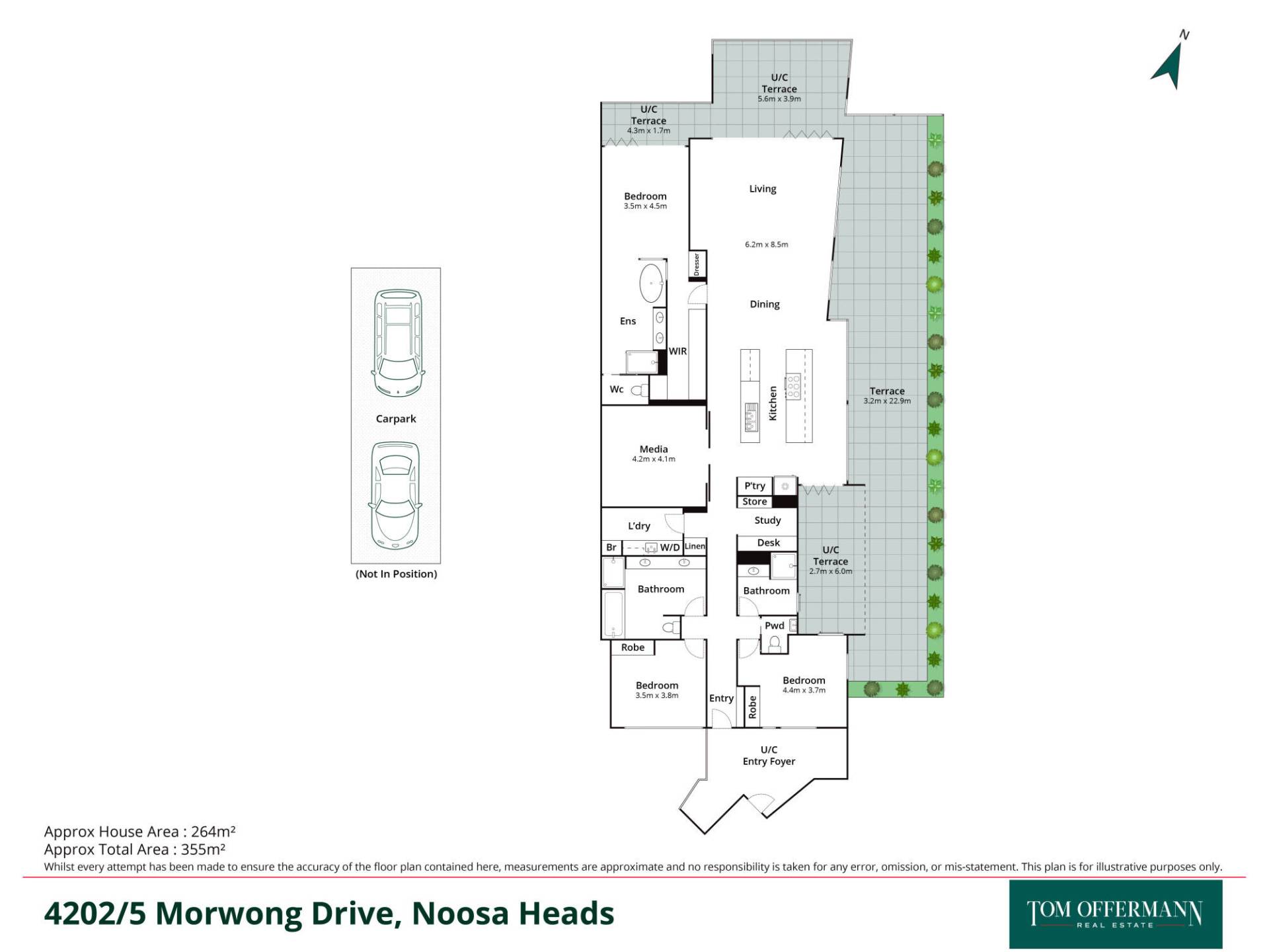 - Terraces: wrap 2 sides; 3.4m x 1.7m off master suite; 5.9m x 3.9m off living; 2.7m x 6m off kitchen & bedroom; total east side incl living 3.2m x 22.9m