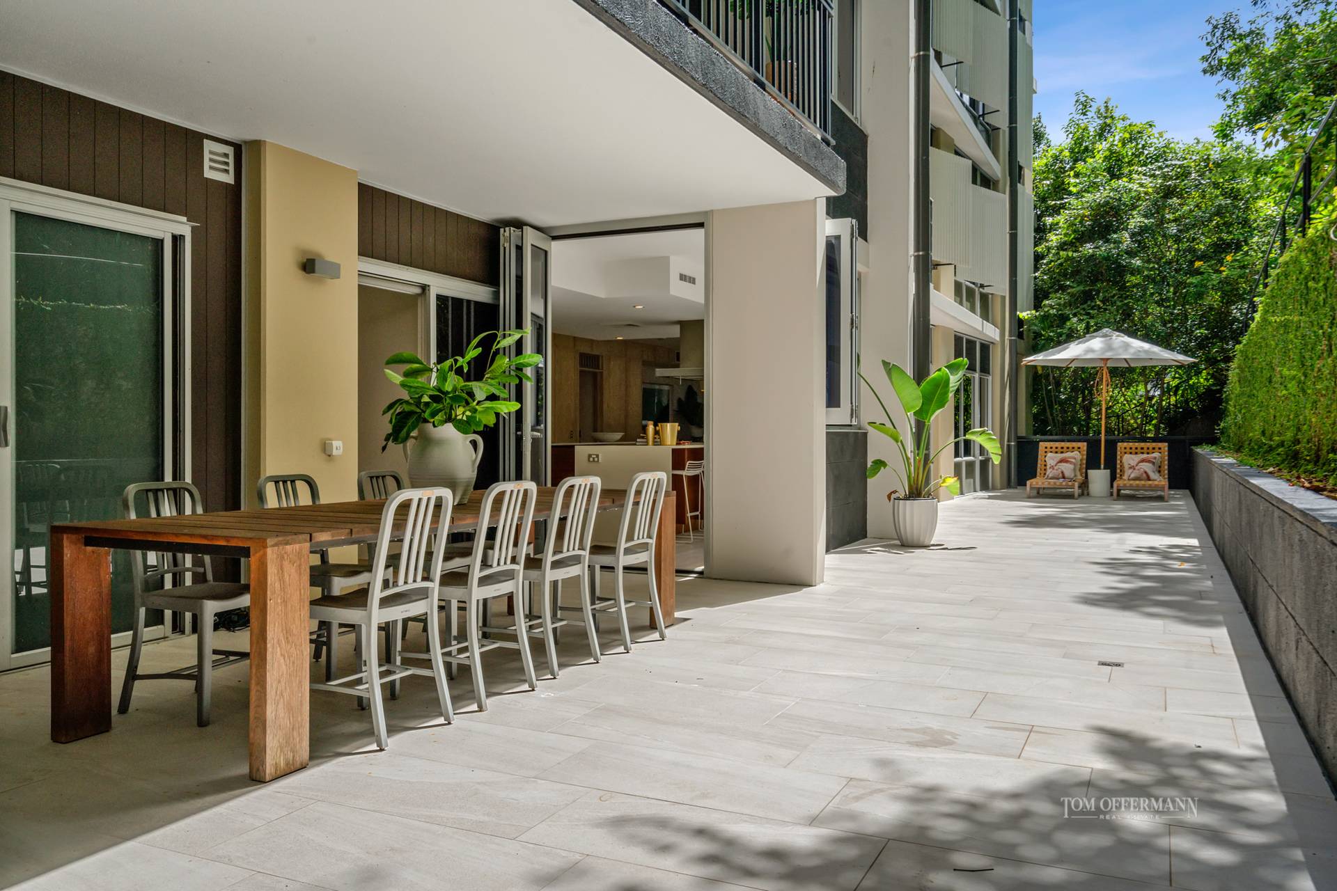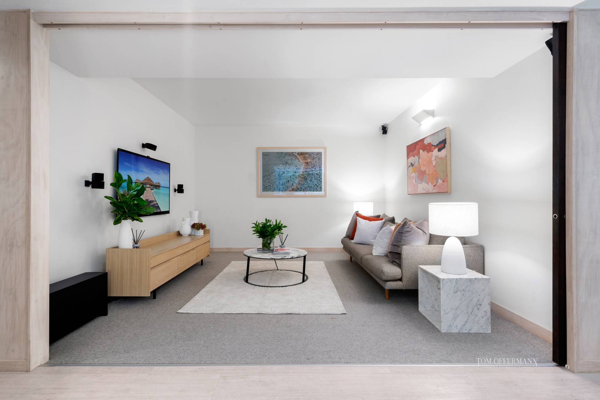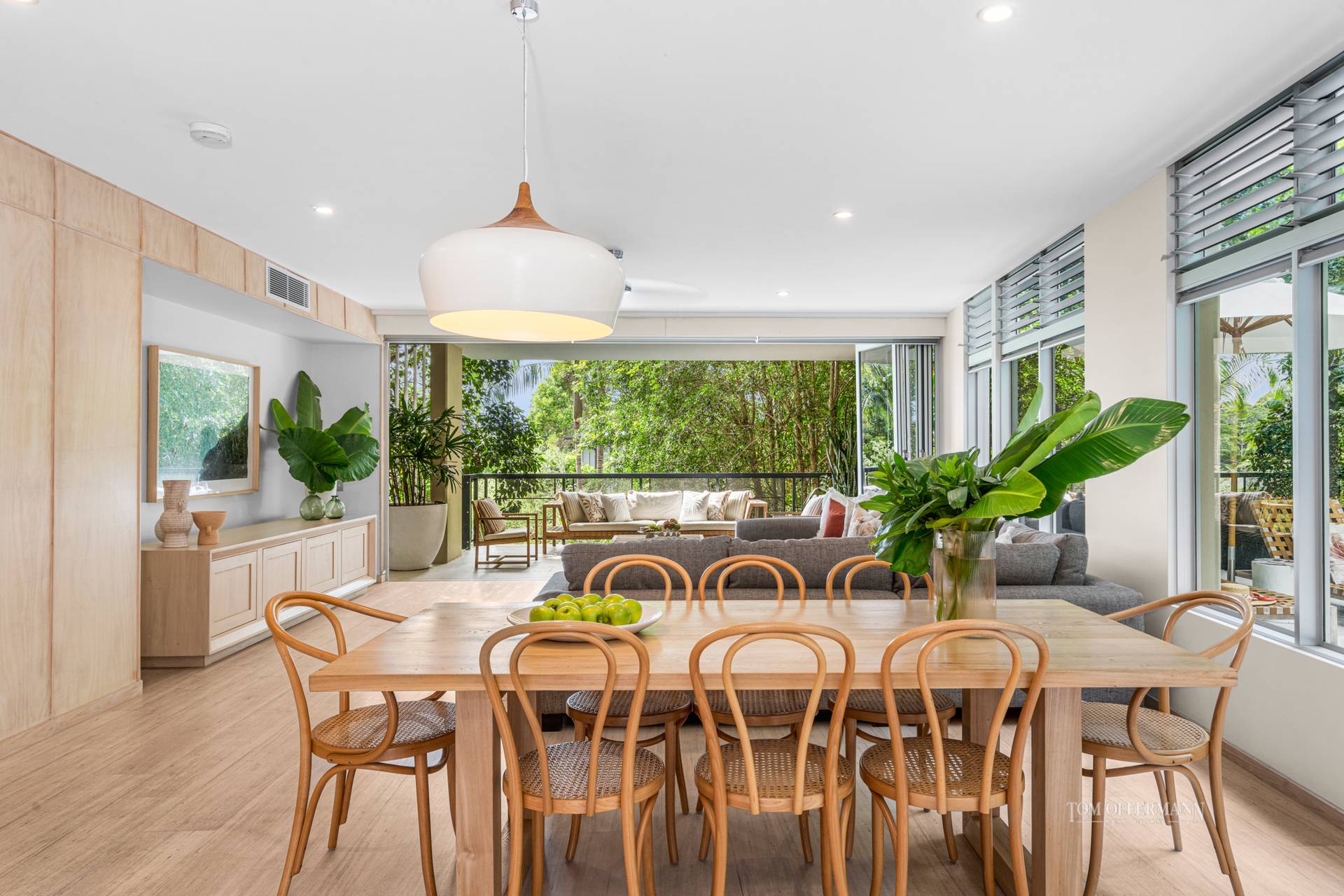 Note how free-flowing spaces throughout keep on giving, and how off the vast living areas with a big sumptuous modular sofa, custom cabinetry and timber dining table for ten, is a media room. Admire the banks of louvres and glass panes from the ceiling almost to the floor, and how sliding doors push back, disappear and coalesce with the private terraces, which are designed to take advantage of the all-year temperate climate.