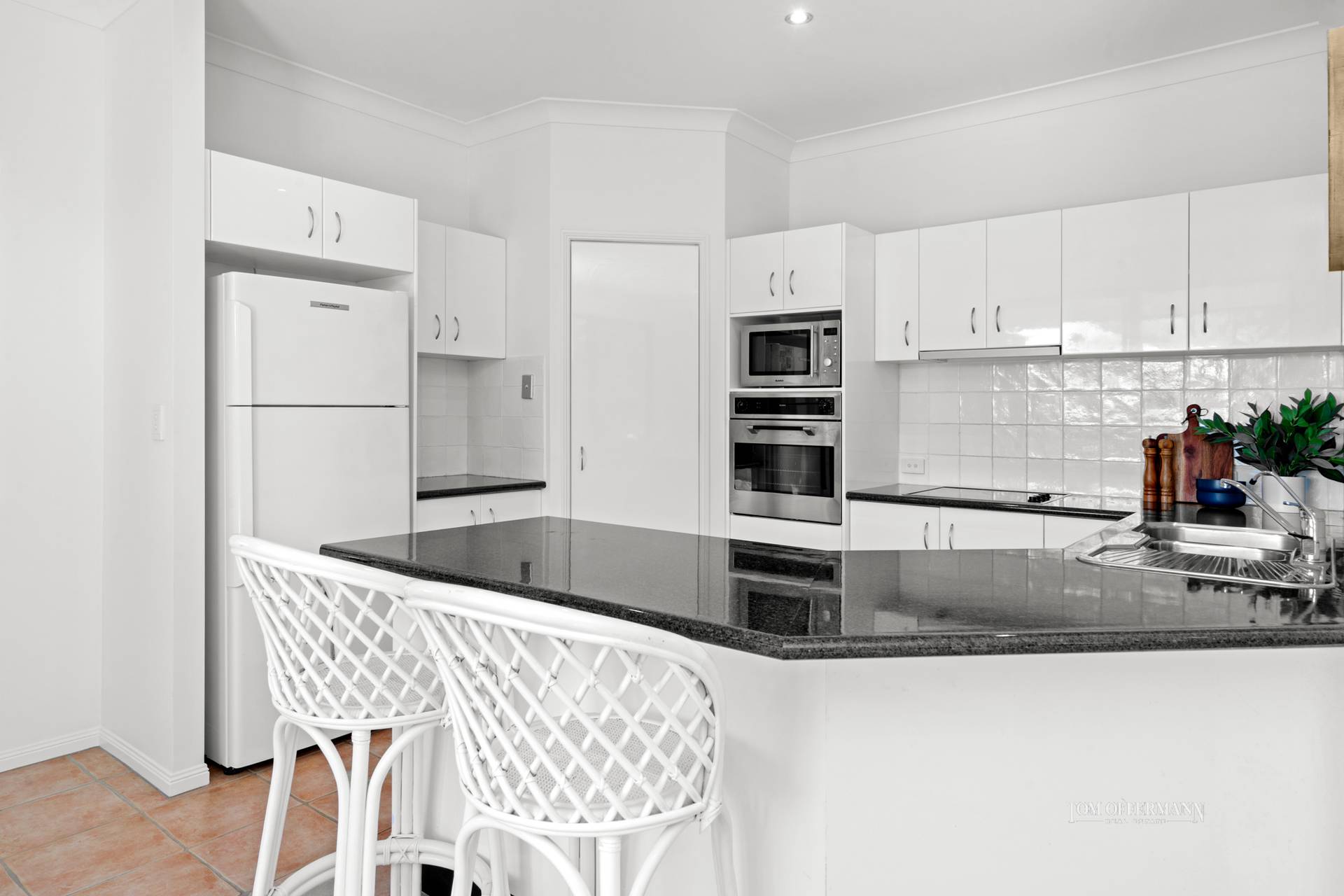 - Kitchen/Laundry: C-shaped 2-pac white cabinetry w long black topped benchtops/breakfast bar; coffee corner; walk-in pantry; white tile