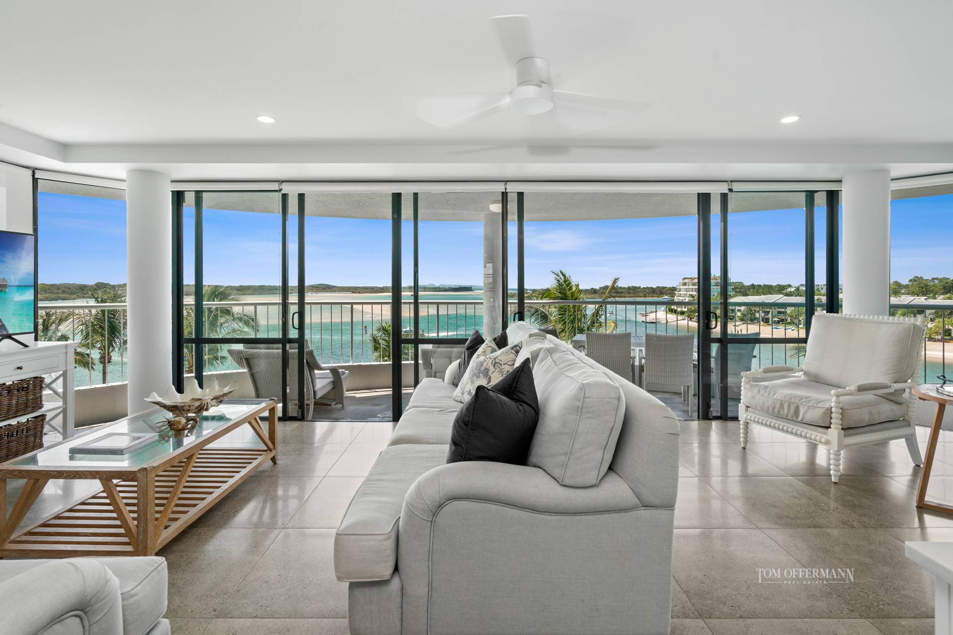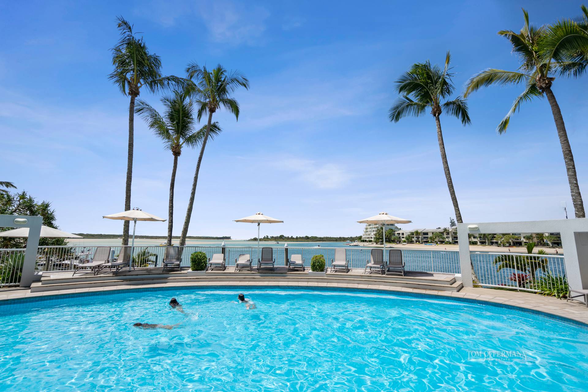 Below, the white-sand beach, impressive oval-shaped pool, spa and sun terrace, two pontoon jetties and mooring bollards, sounds like heaven for those wanting to become boaties for a day, retirees obsessed with fishing or kids just wanting to build sandcastles and swim in the shallows.