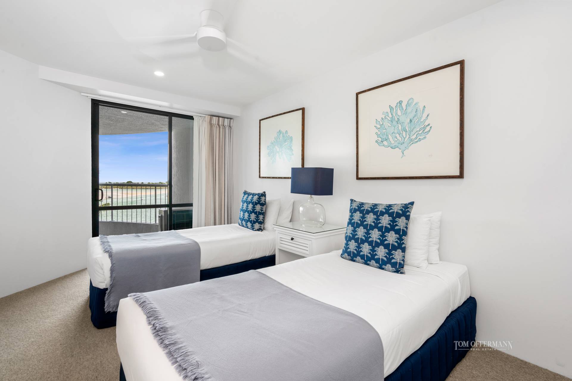 Delightful fresh white bedrooms with pops of blue, palm artworks, wispy sheers, and carpet, echo the overall aesthetic plus have access to the terrace. The master has a TV, curvaceous-walled walk-in robe and an ensuite with terrazzo tiled floor and white tiled walls. The twin bedroom on the eastside has built-in robes and an ensuite with bath/shower.