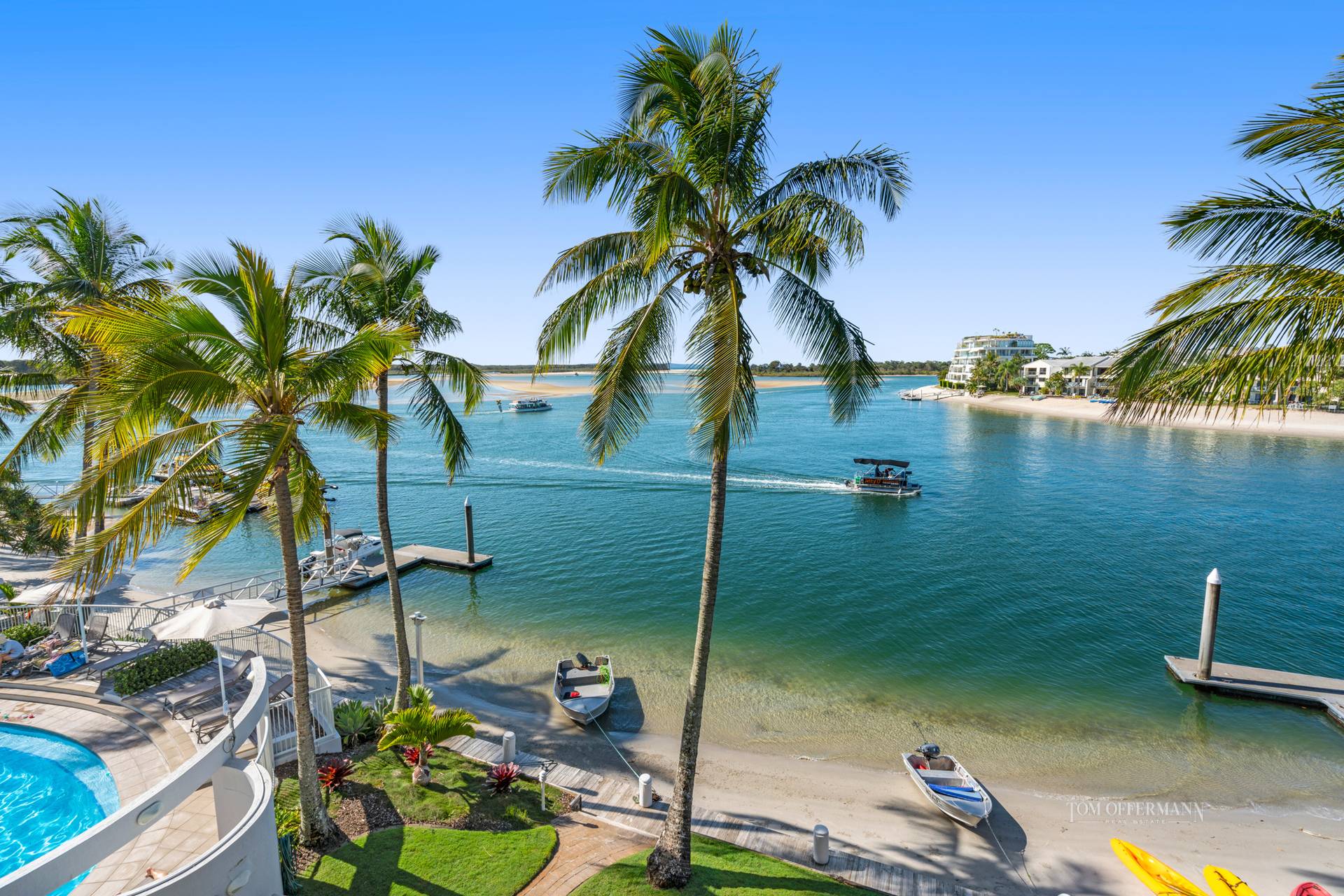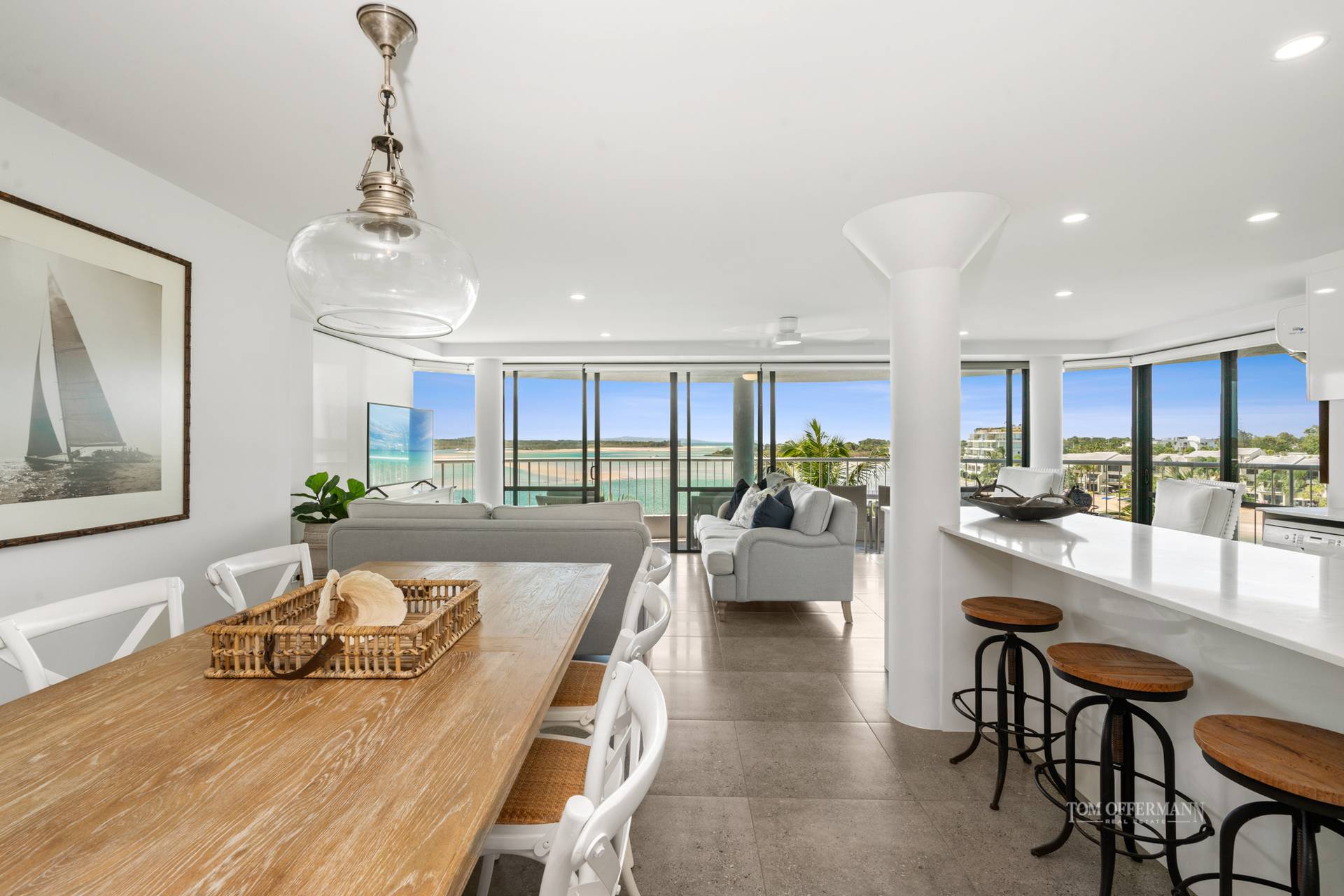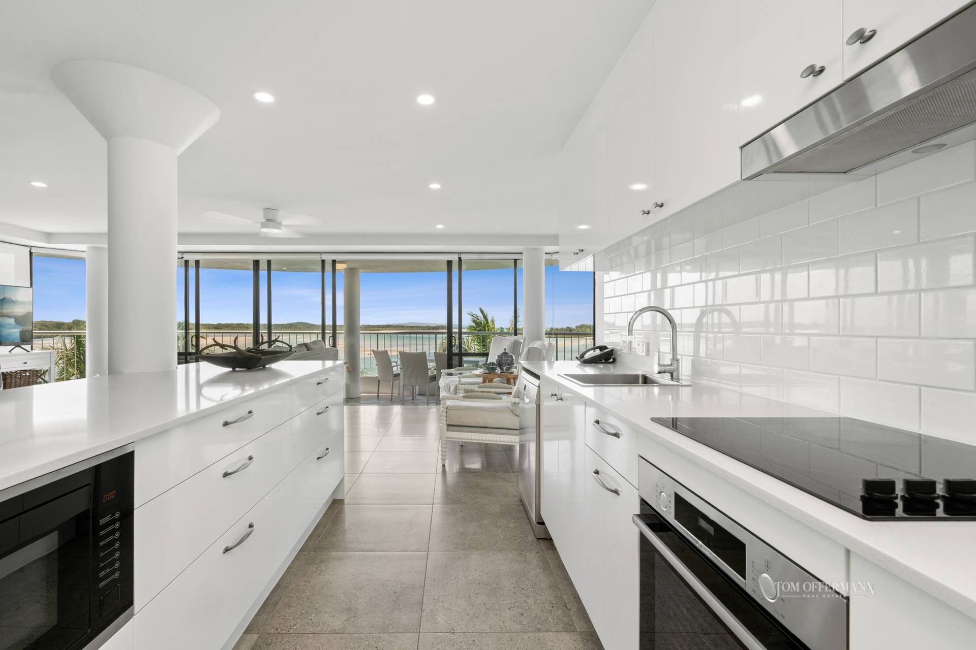 Blessed with a breathtaking position embracing a waterfront dotted with swaying coconut palms, 180° simply dazzling views of bobbing boats on the Noosa River, and pelicans gliding above, is a stunning yet simple Palm Beach-inspired apartment.