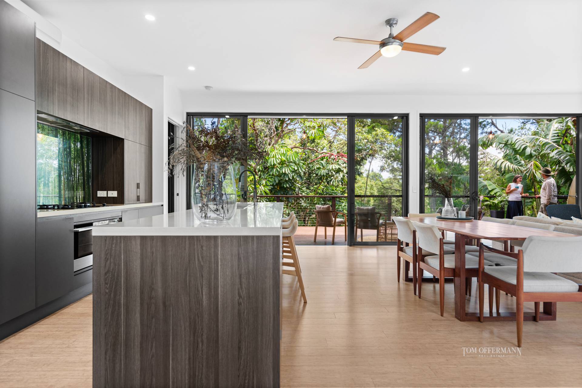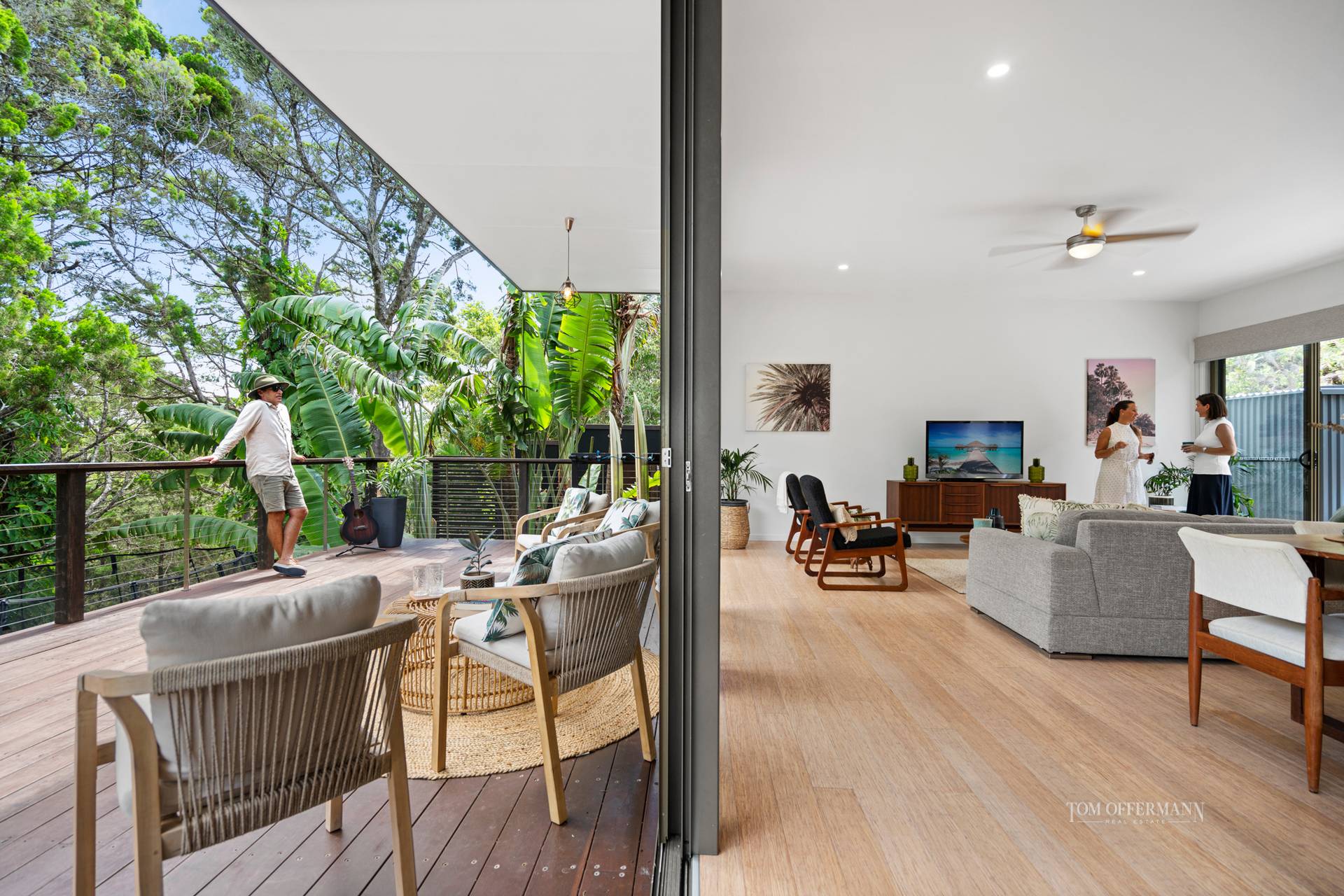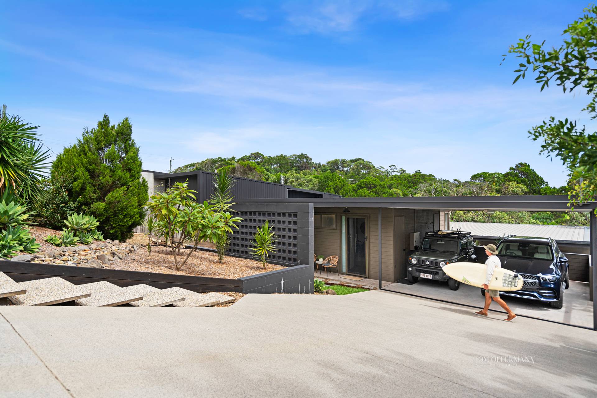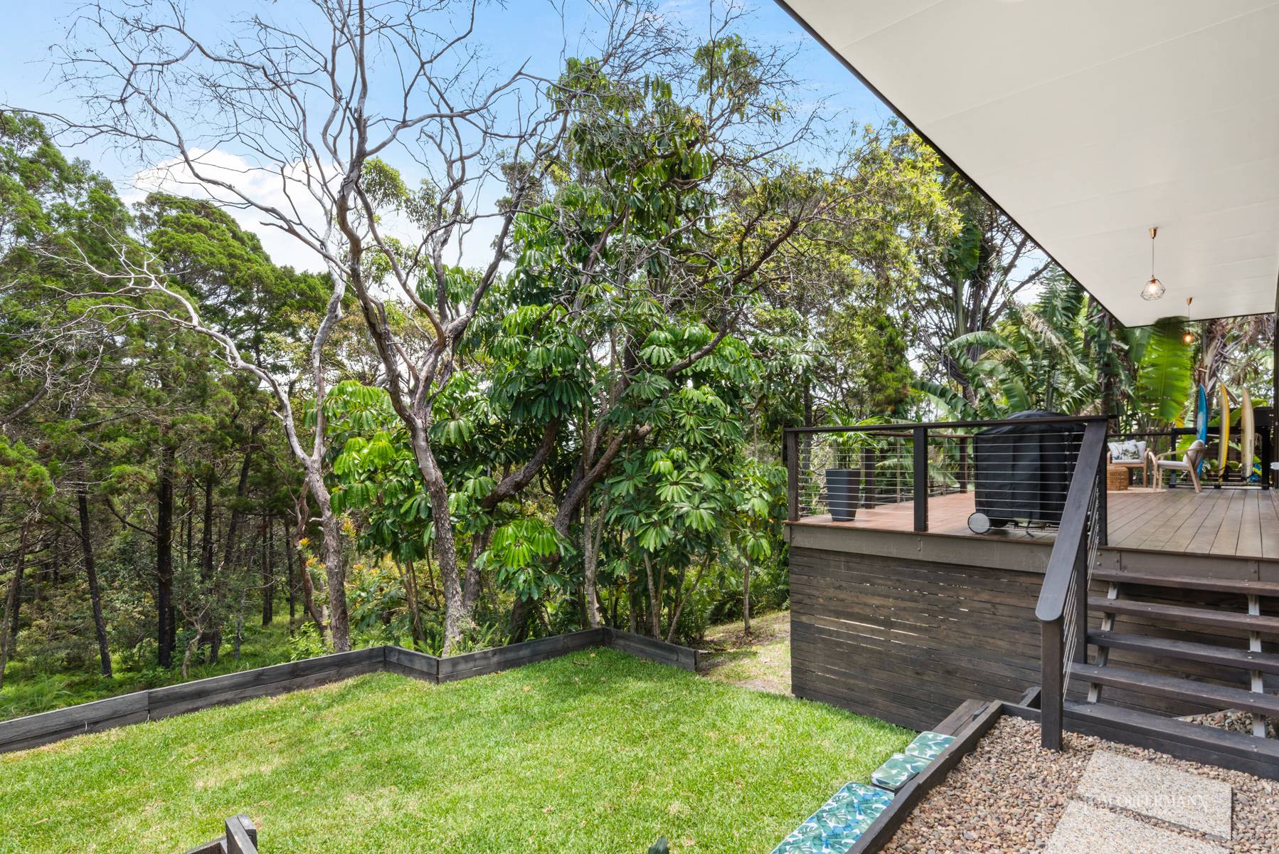 Living on nature's doorstep this eco resort style feel architecturally designed home sits elevated and nestled adjacent to a Nature Reserve. This mid century inspired home is only 9 years old.