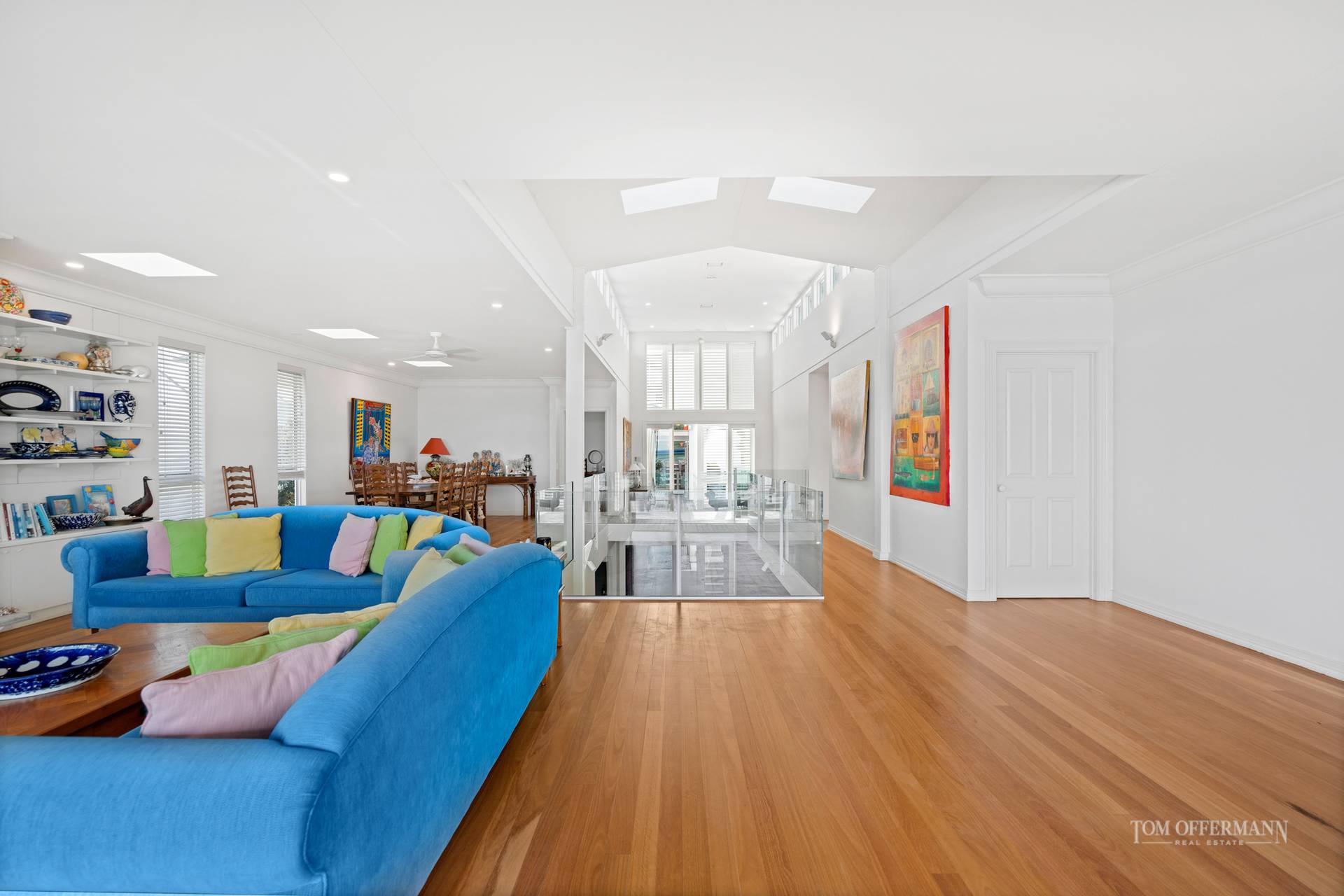 Designed by the inimitable Stephen Kidd, it is all about tranquil spaces and stellar style, reminiscent of a seaside art gallery. Natural light via the upper windows and skylights of the clerestory-ceilinged central atrium, saturate the shiny honey-hued blackbutt flooring, on the two levels.