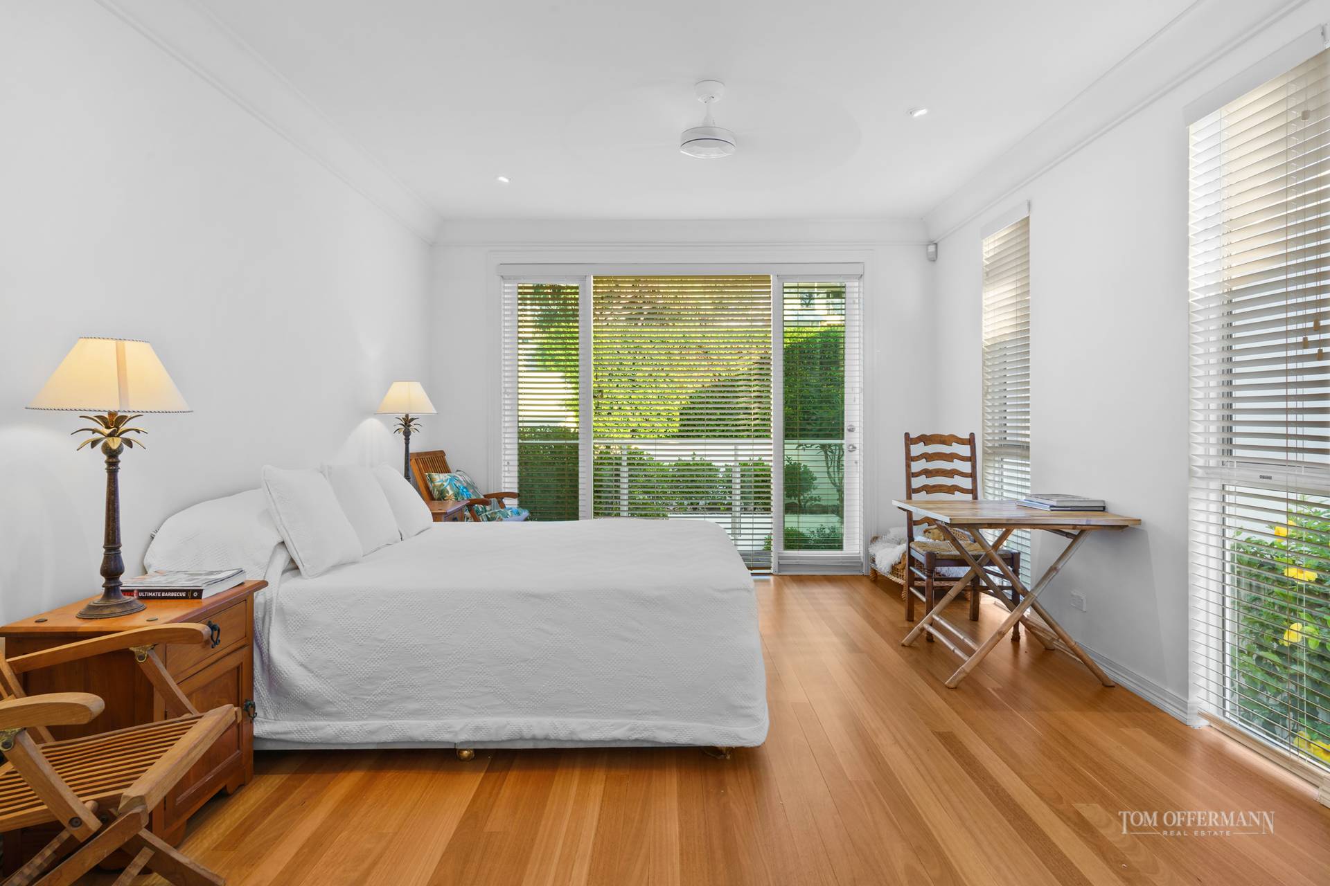 Also, on this level in the north wing, is the capacious master suite with a balcony, walk-in dressing room and ensuite with dual access also an indoor/outdoor shower. A guest bedroom is currently used as an office/art space, and a U-shaped kitchen has granite bench tops and the latest Bosch appliances.