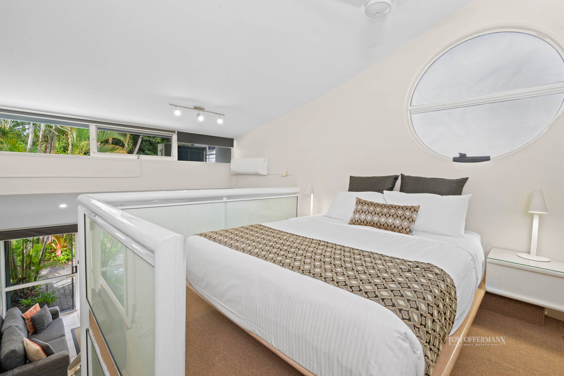 The mezzanine-style, fully self-contained north facing apartment is a private haven. It is near a gate to the pool and at the end of the short row. The open-plan interior, with a monochromatic palette of muted grey's and light stone hued floor tiles, is drenched with natural light thanks to a large porthole-style window on the East-side.