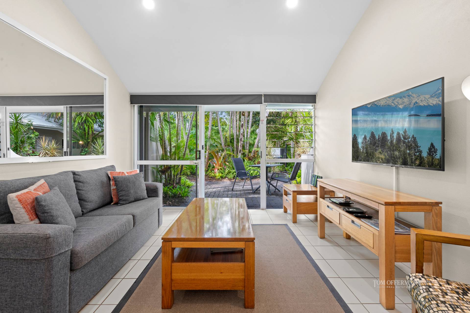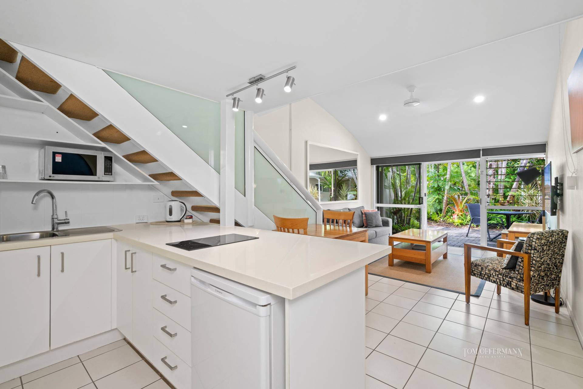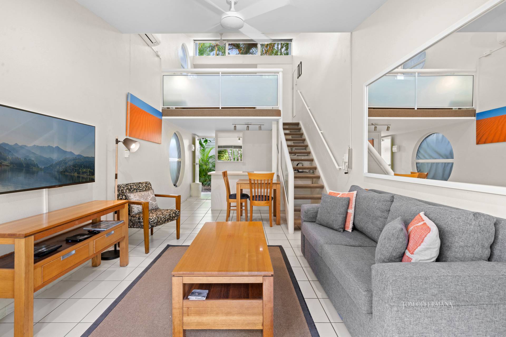 - About: end apartment/one neighbour; large porthole-style windows on 2 levels; fully self-contained w east-facing private furnished terrace near gate to pool; light stone hued tiled flooring; charcoal lounge/sofa bed + armchair; smart TV; airconditioning/fans/auto blinds; louvres/sliders to terrace; mezzanine king bedroom w half wall to garden view; built-in robe + sep luggage shelf; tiled bathroom w walk-in shower, vanity & toilet