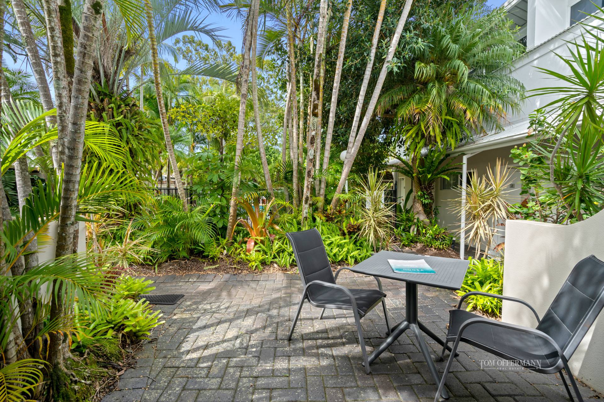 The charcoal-coloured couch can be made into a sofa bed, louvres and sliders flow almost seamlessly to the east-facing undercover terrace, which is shrouded by a palm-fringed and sub-tropical garden, making it ideal for breakfast alfresco after an early morning swim.