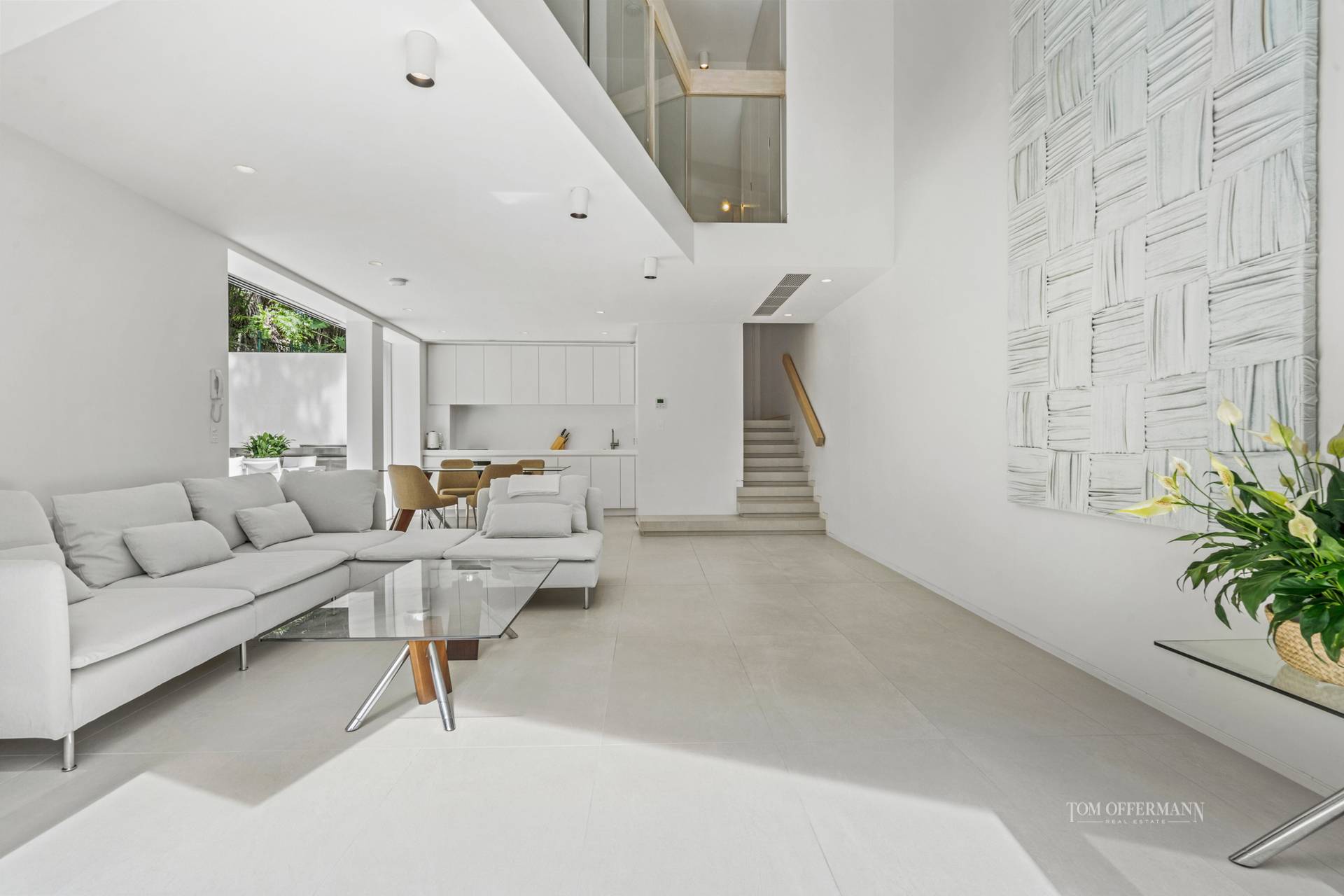 The open-spaced dining and living area with cathedral height ceiling and pale stone-hued Italian porcelain tiles, is designed to maximise light at every turn. Luxury modular furniture in natural hues, light timber and glass-topped table with upholstered chairs in macchiato-toned fabricare matched by a statement art piece.