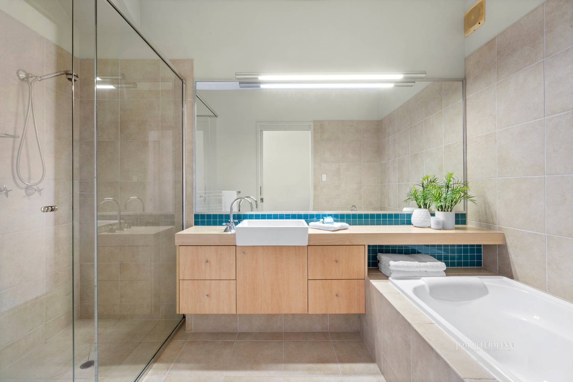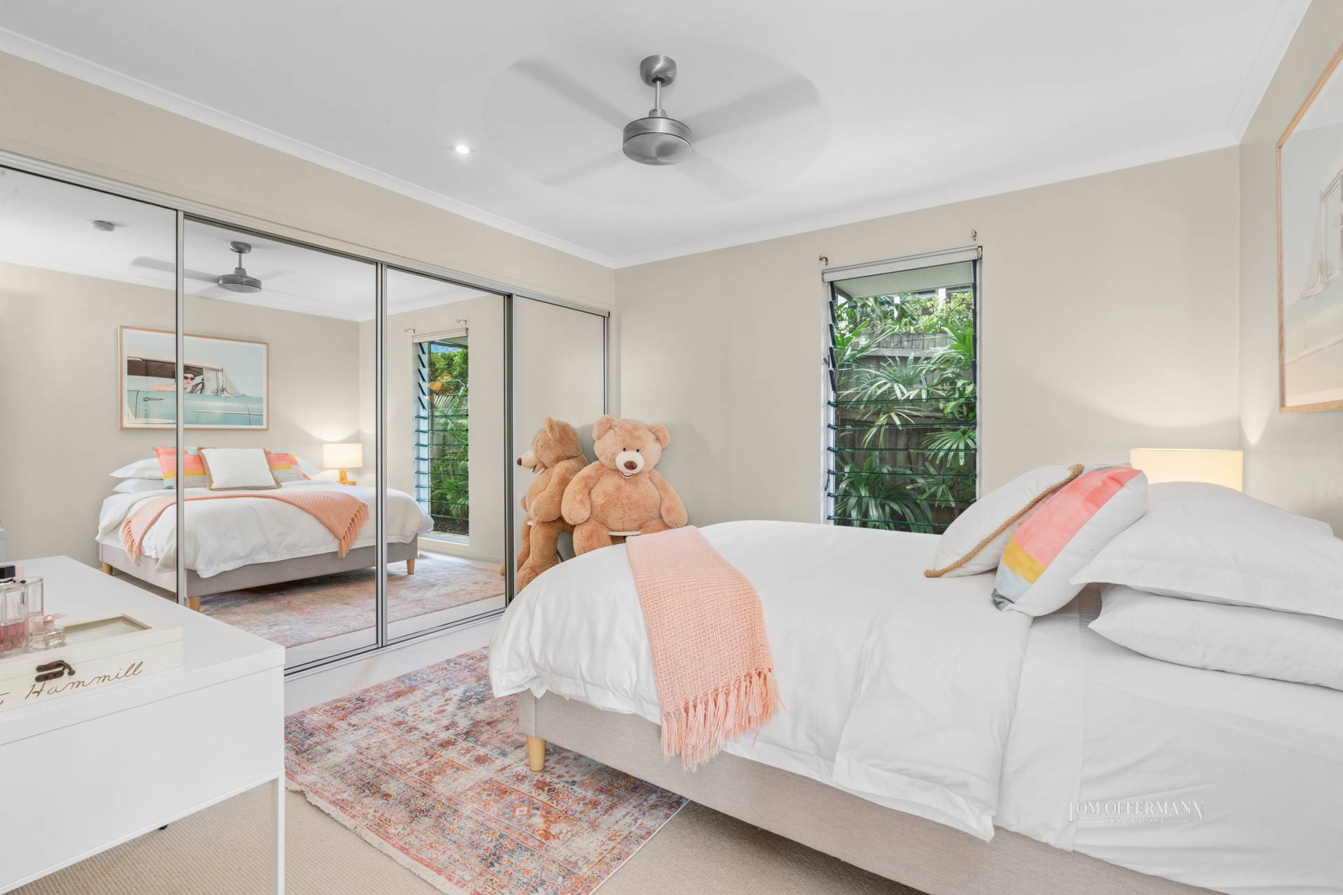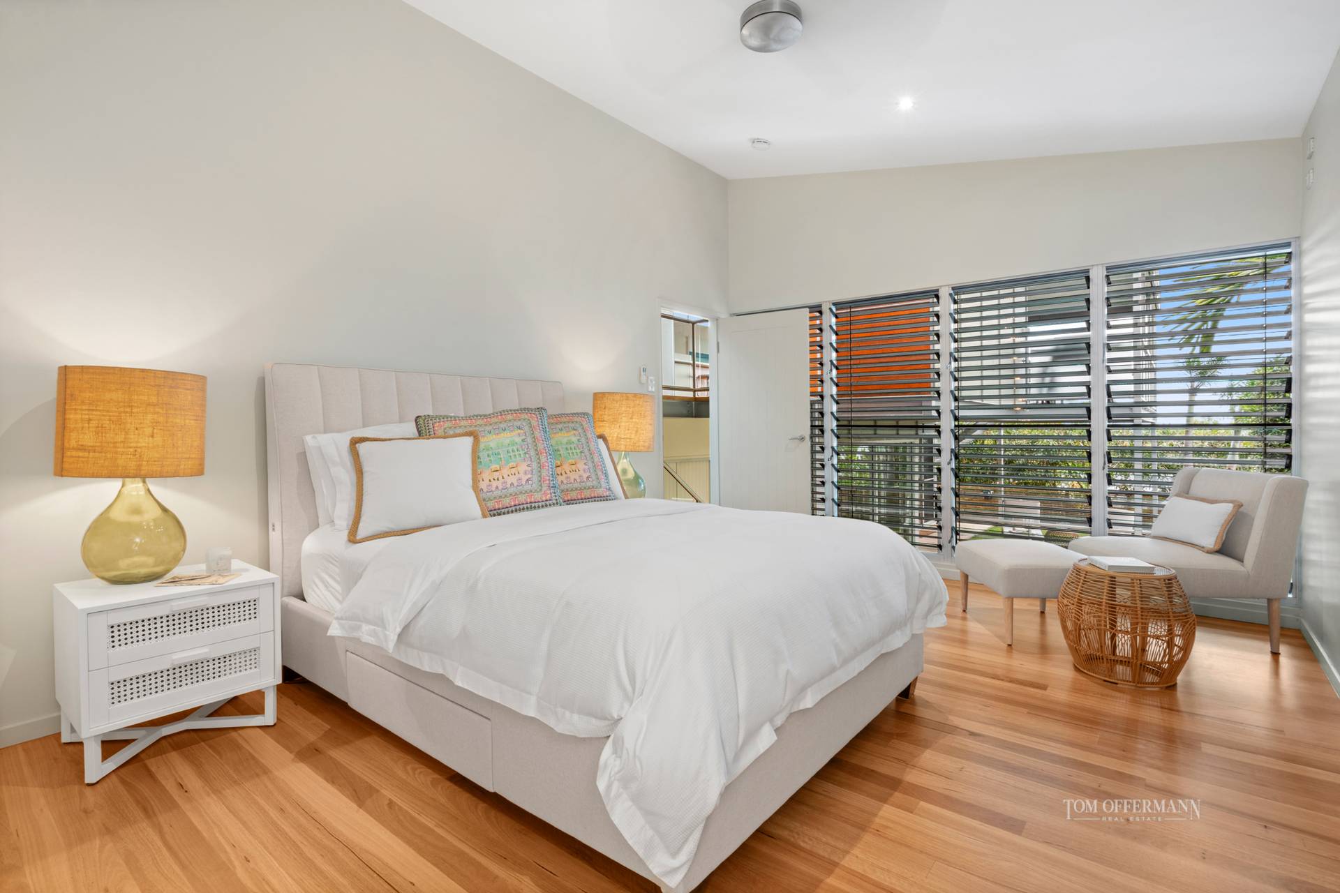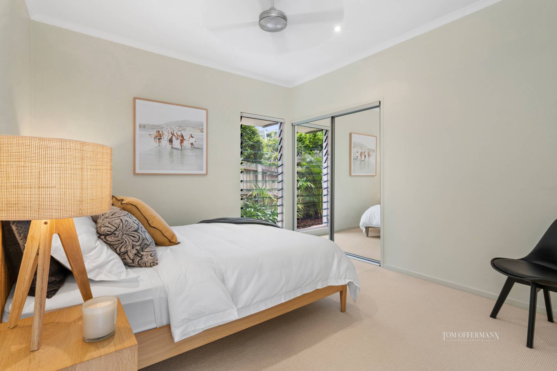 The mezzanine is a serious bliss zone. From the king master retreat with walk-in robe, large ensuite and spa bath, open the blinds of the picture window in the morning, see reflections of palms on the pool or vistas beyond words anytime, and sigh.
