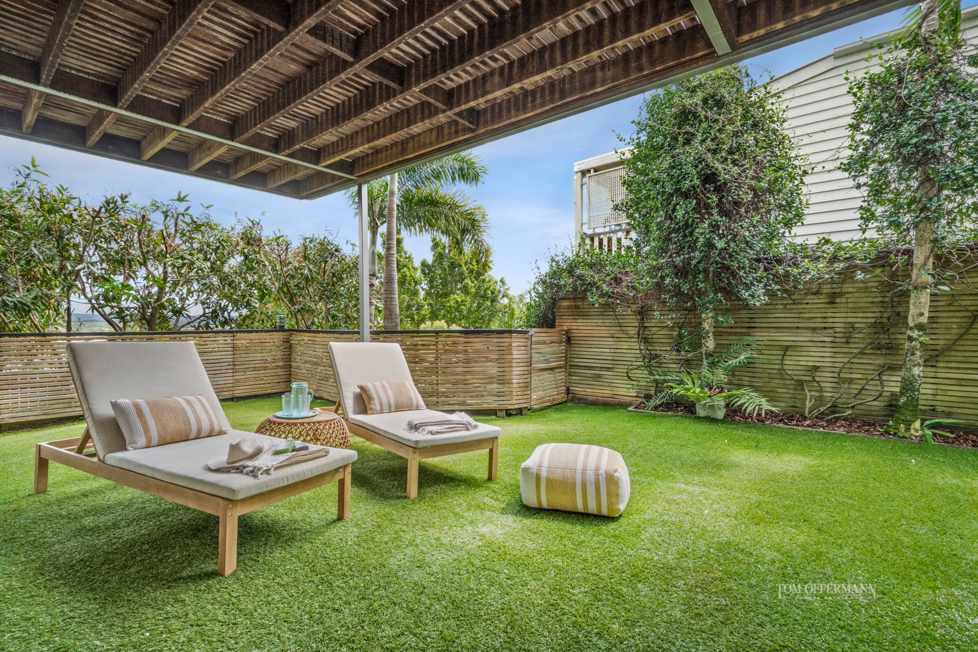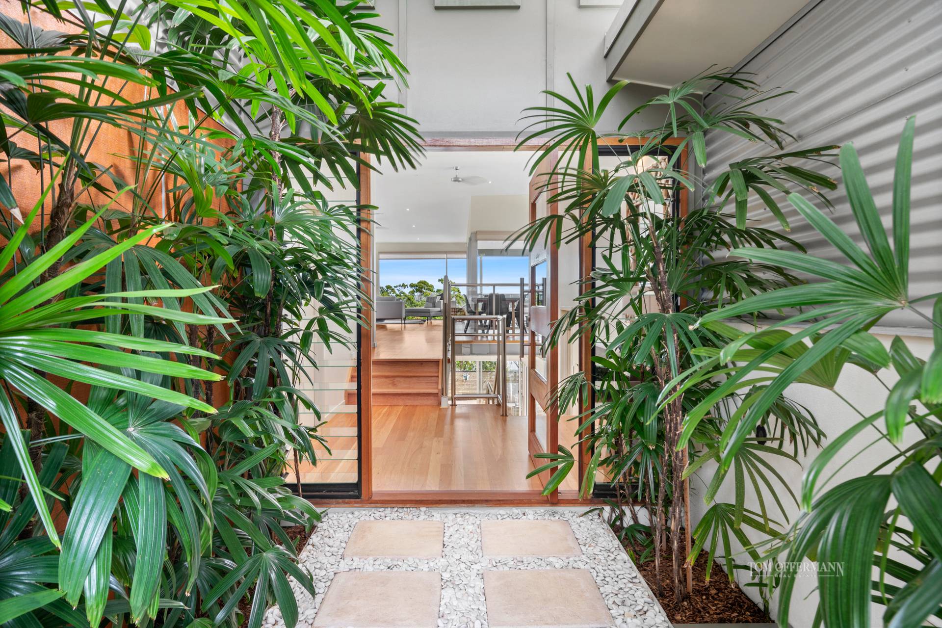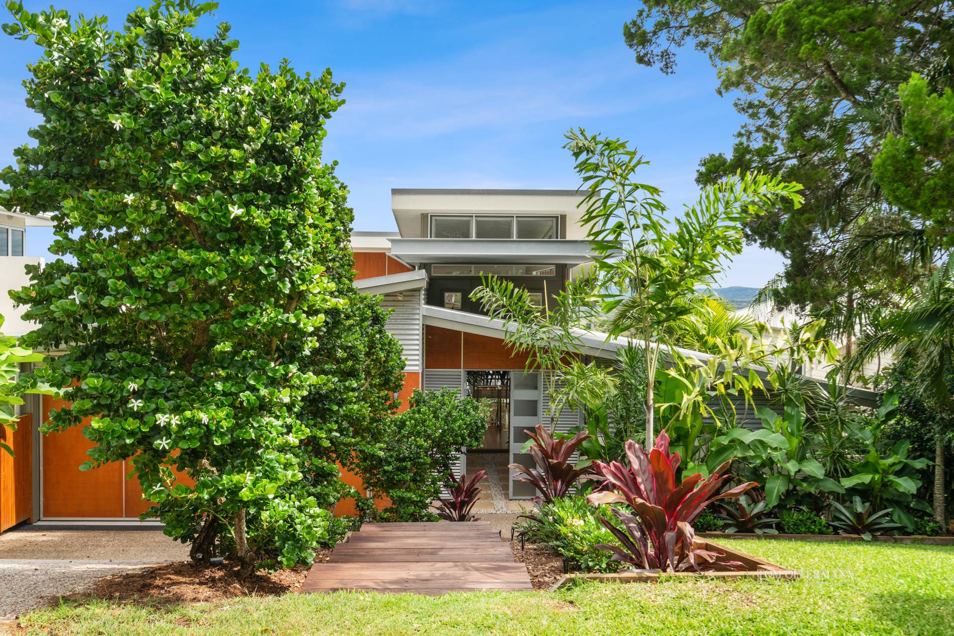 • Exterior: undercover terraces 4m x 8m off living w auto Vental tilting blind; materials incl zincalum corrugation & timber garage door; front garden w merbau pavers & white pebbles, hedges, Heliconias, gold cane palms & water feature at entrance w glass & timber double pivot door; rear garden w maintenance free grass + bank of Lillypillys; jasmine alongside walkway