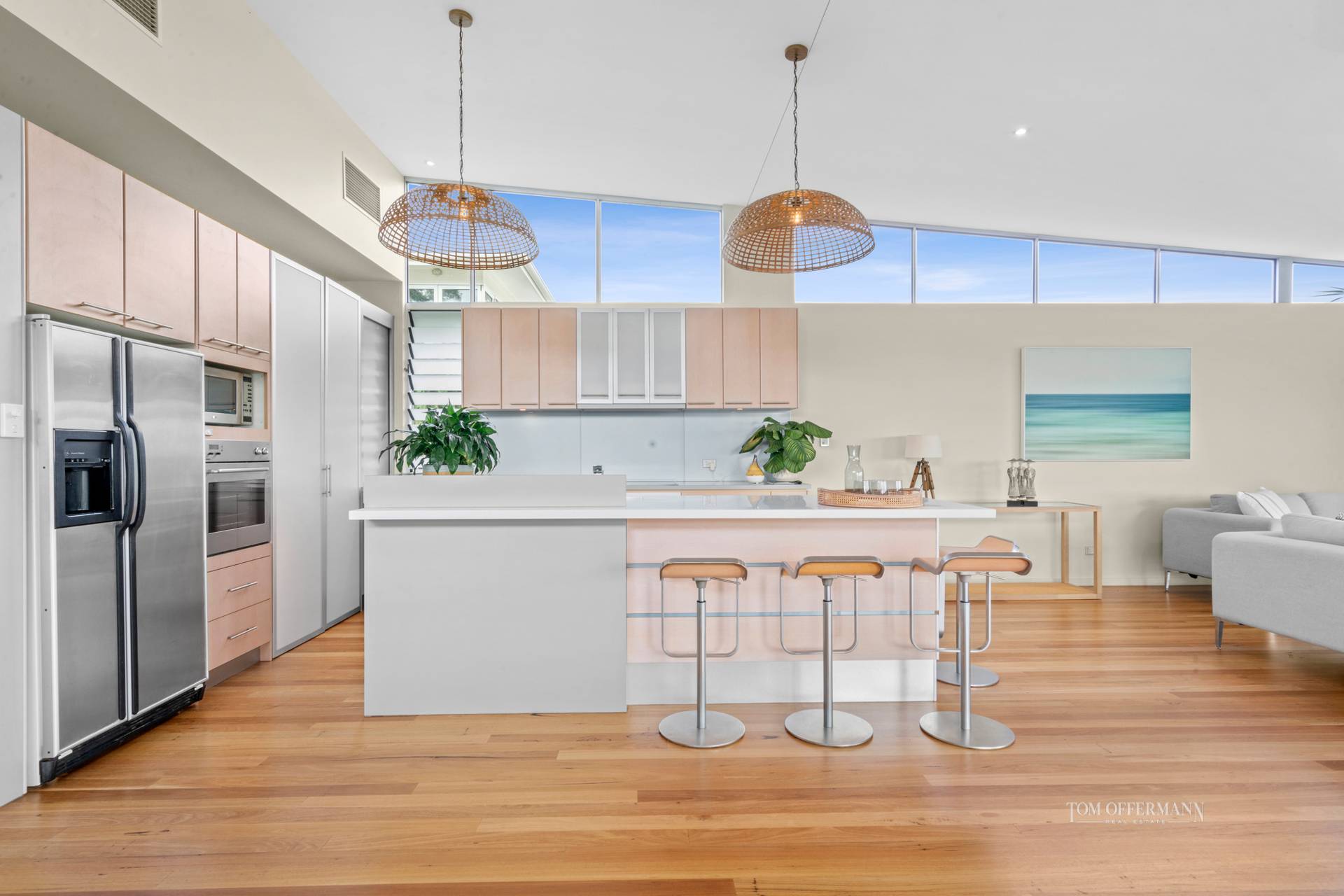 Inside exuberant lines, oversize spaces with oh-so high ceilings attract natural light which shadow dances over the endless polished blackbutt flooring, evoking indefatigable energy.