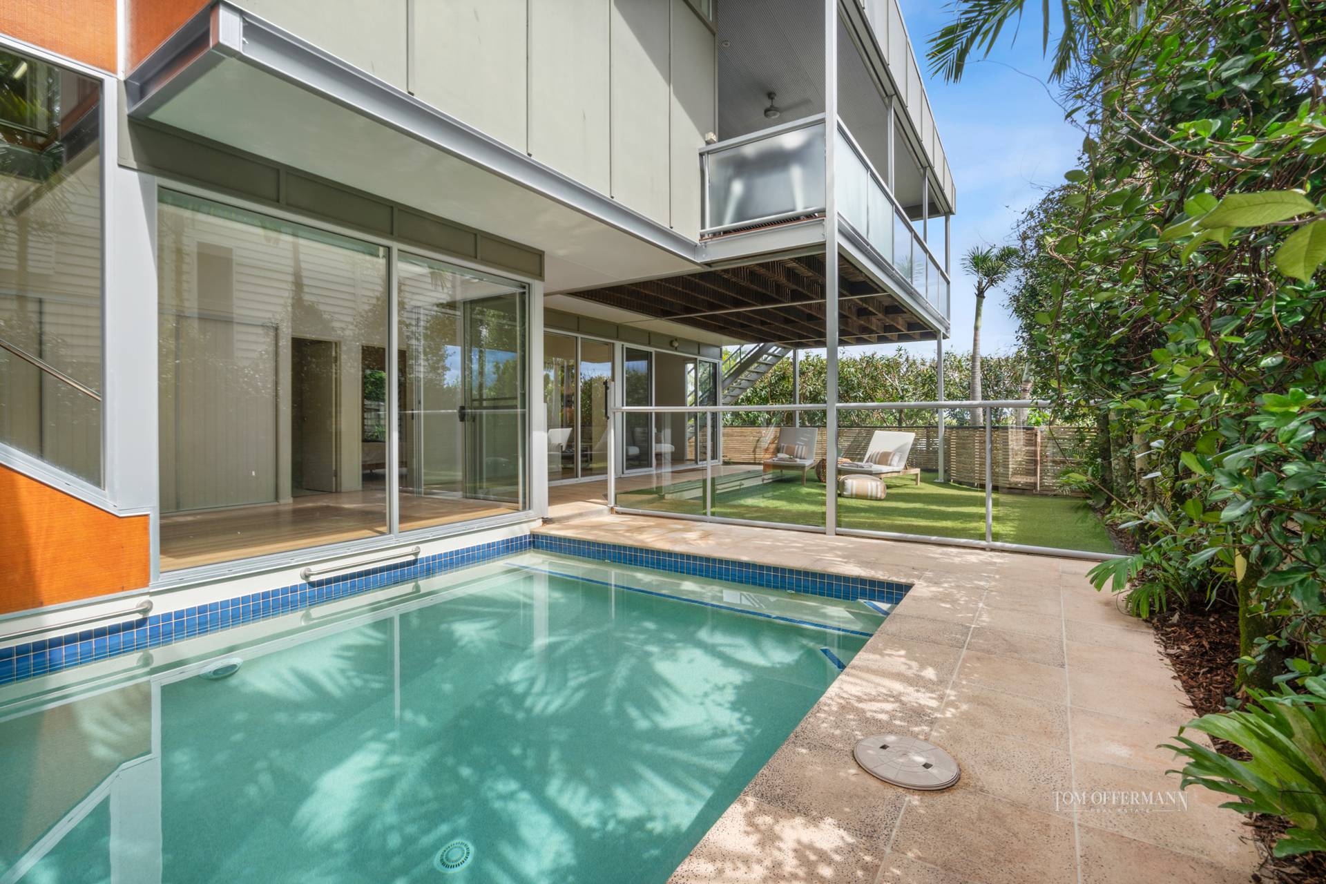 • About: 5m ceiling height; floor-to-ceiling picture window; marine ply & glass balustrading; polished blackbutt flooring; lower-level extension of indoors out to pool, undercover courtyard & garden; mezzanine master retreat w picture window & louvres to pool + views, massive spa bath, ensuite w aqua tiled vanity, separate toilet & walk-in robe; lower level 2 generous carpeted bedrooms w built-in robes, 3rd currently a living room, all access pool & share bathroom w bathtub; garage w epoxy flooring, work bench & storage; lower level store 8.1m x 2.9m + 2 others; laundry w outdoor drying area; fans/aircon; security