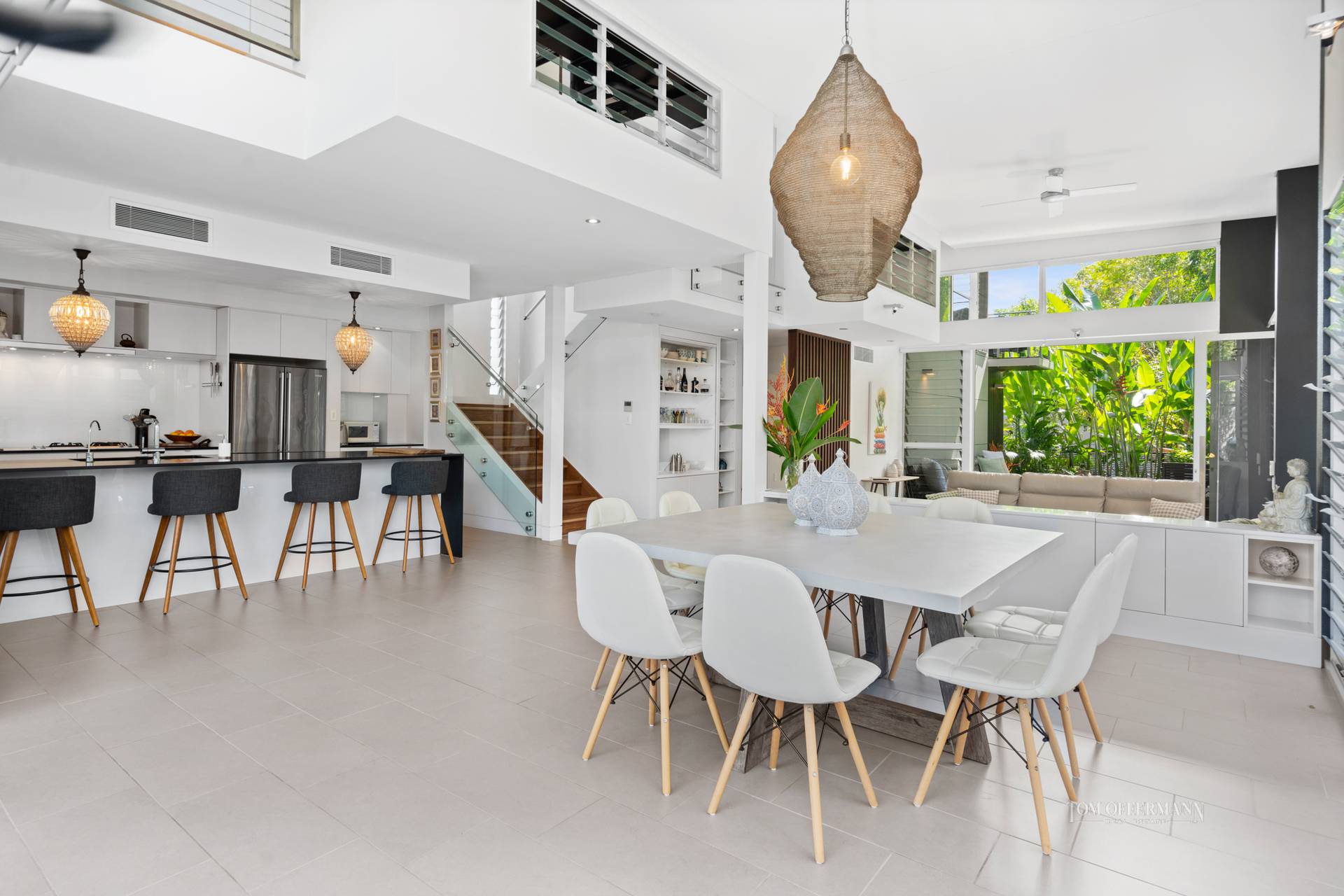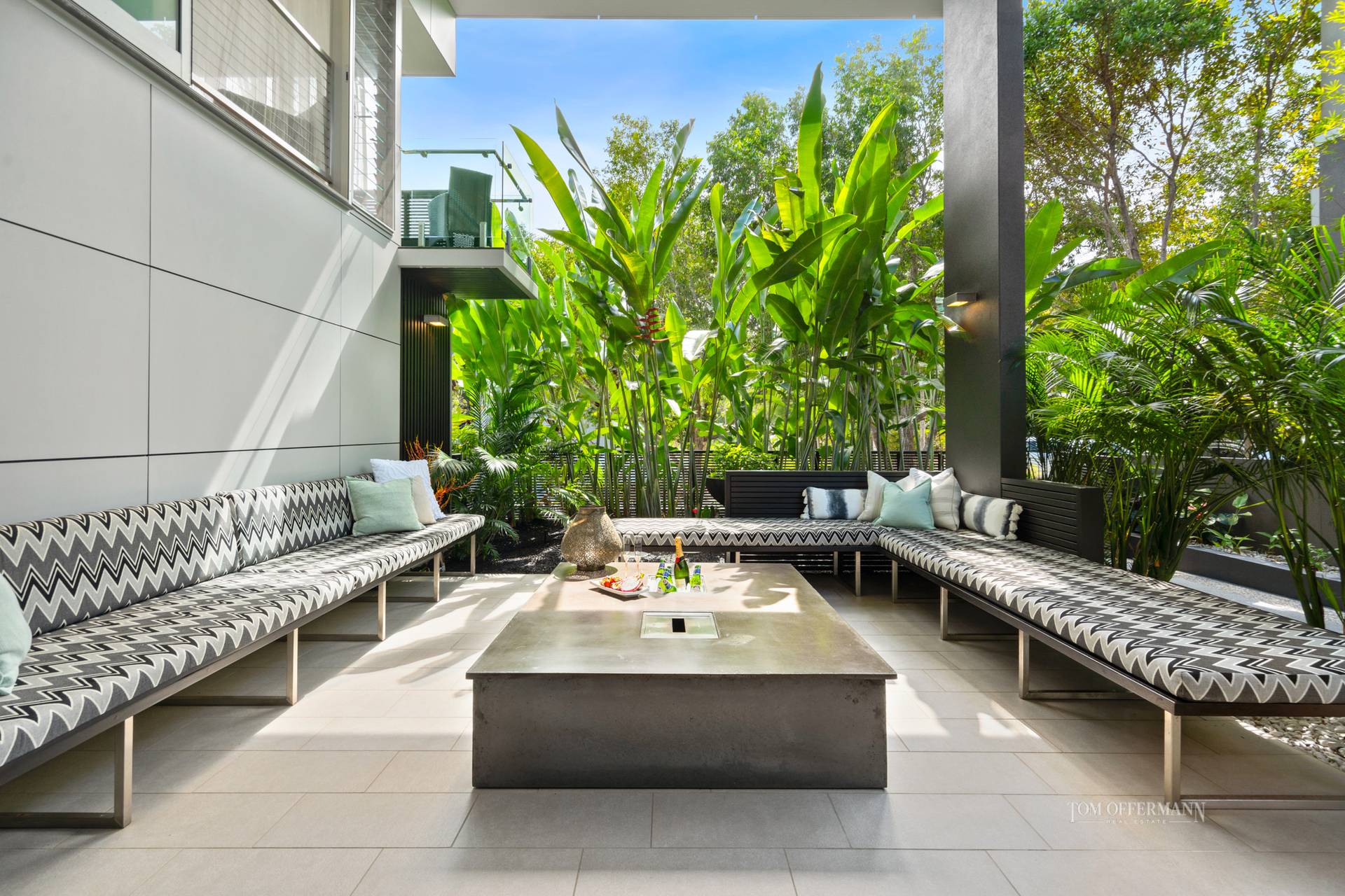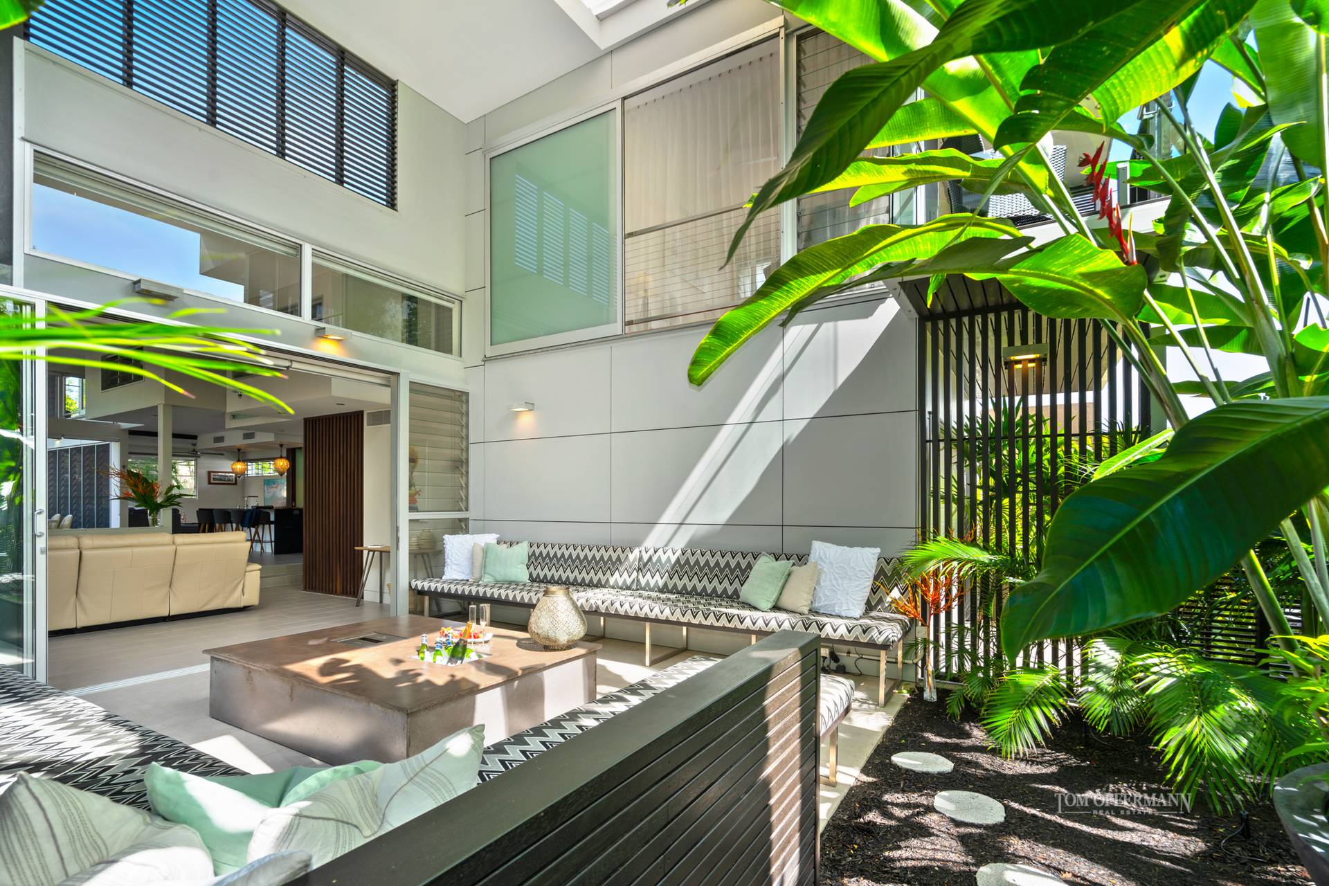 It is impossible not to be distracted by an alfresco entertaining area on the north side, a backdrop of tall colourful heliconias, comfortable bench seating and a super-sized custom cast concrete centrepiece with an eco-oil firepit and inlaid beverage chill. Thoughts of wonderful parties come to mind.