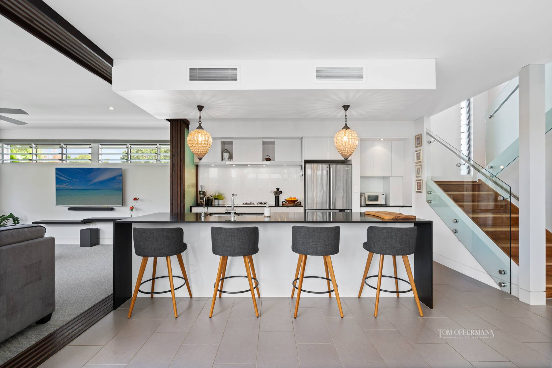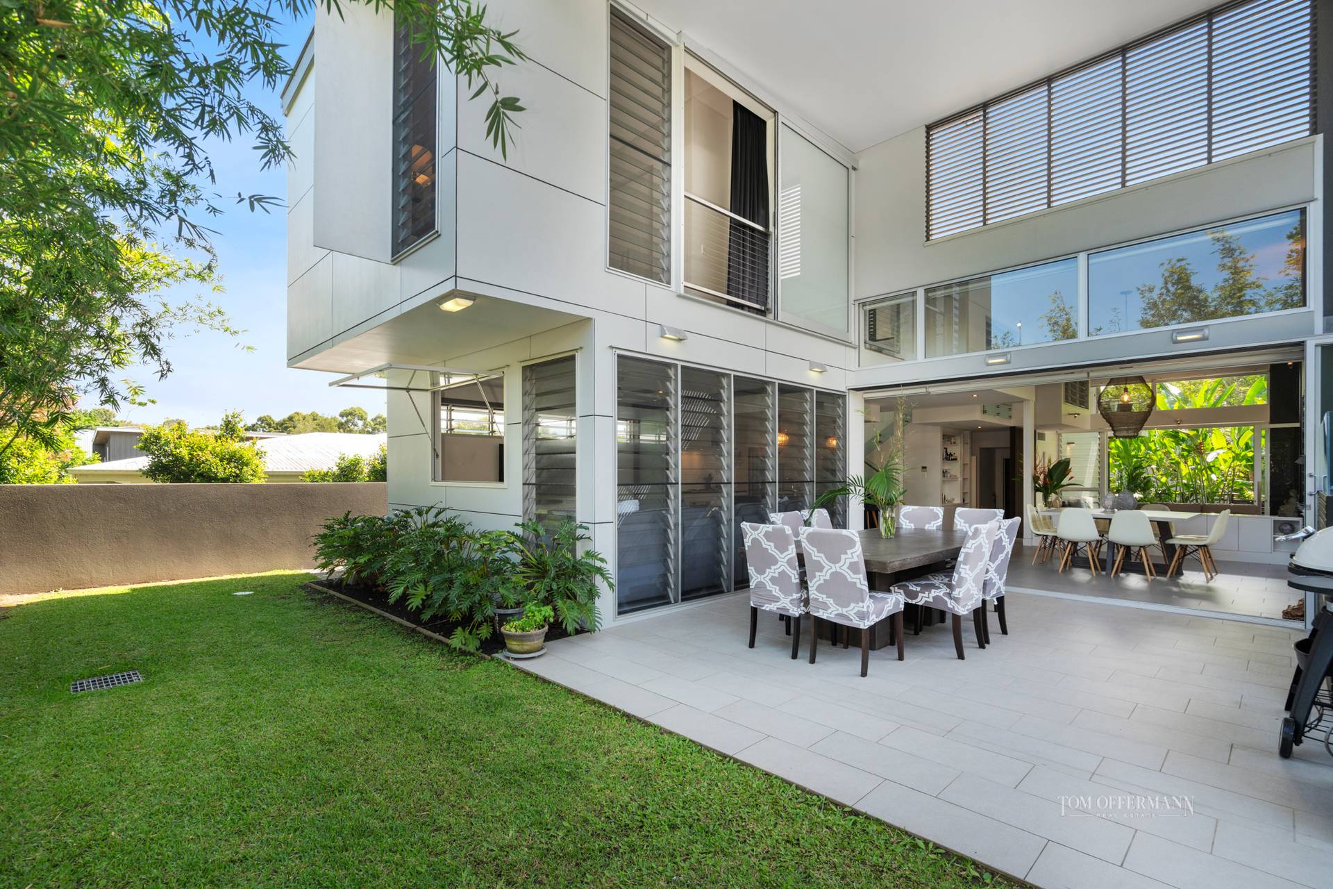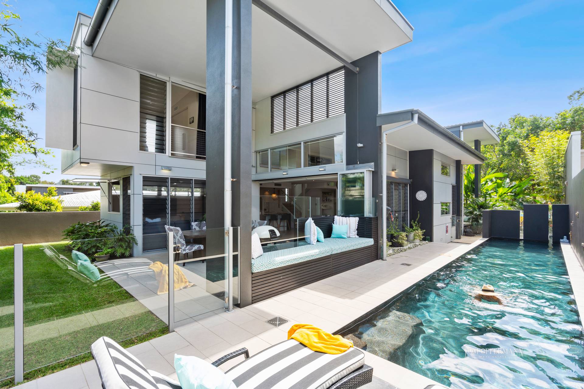 It is impossible not to be distracted by an alfresco entertaining area on the north side, a backdrop of tall colourful heliconias, comfortable bench seating and a super-sized custom cast concrete centrepiece with an eco-oil firepit and inlaid beverage chill. Thoughts of wonderful parties come to mind.