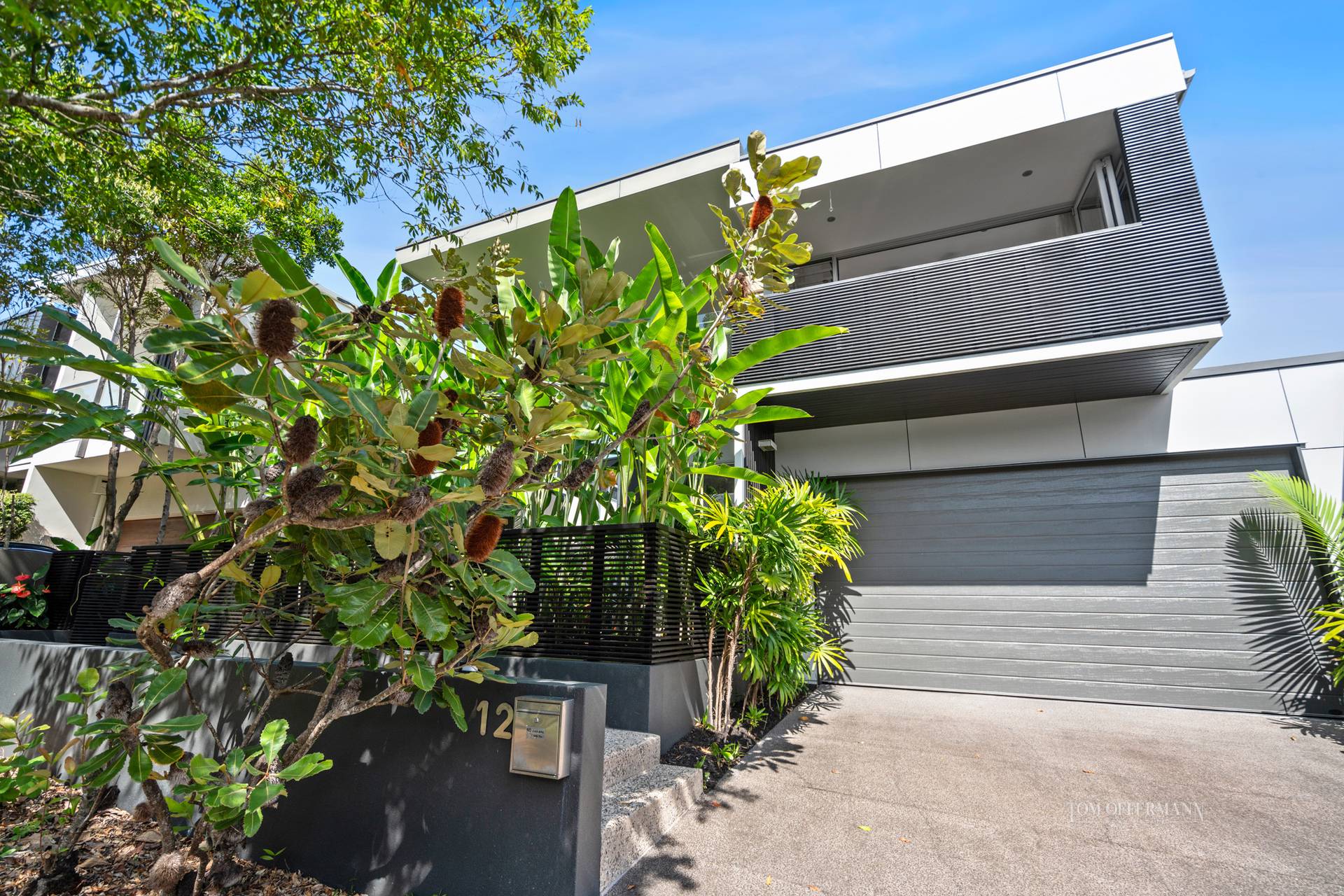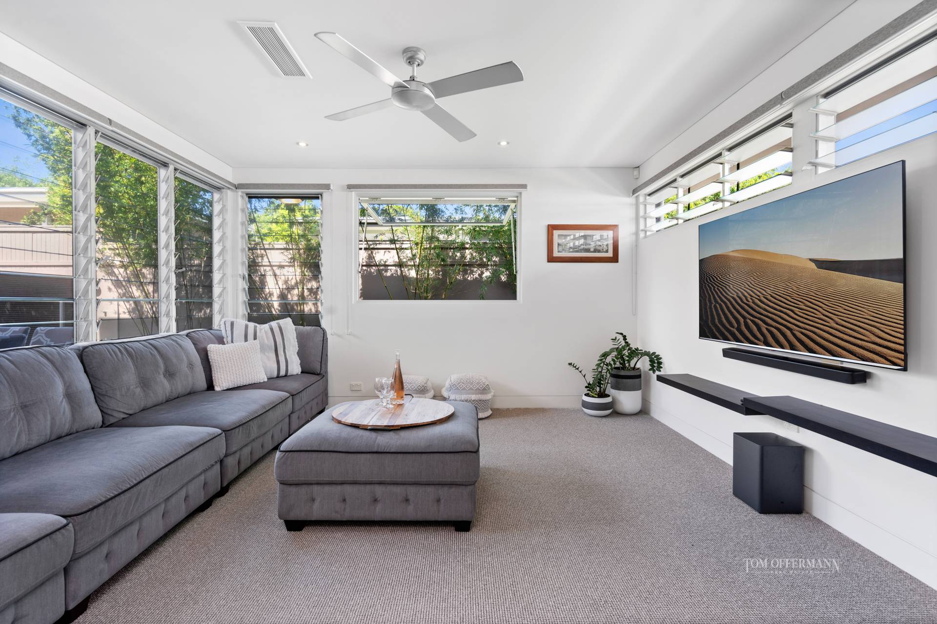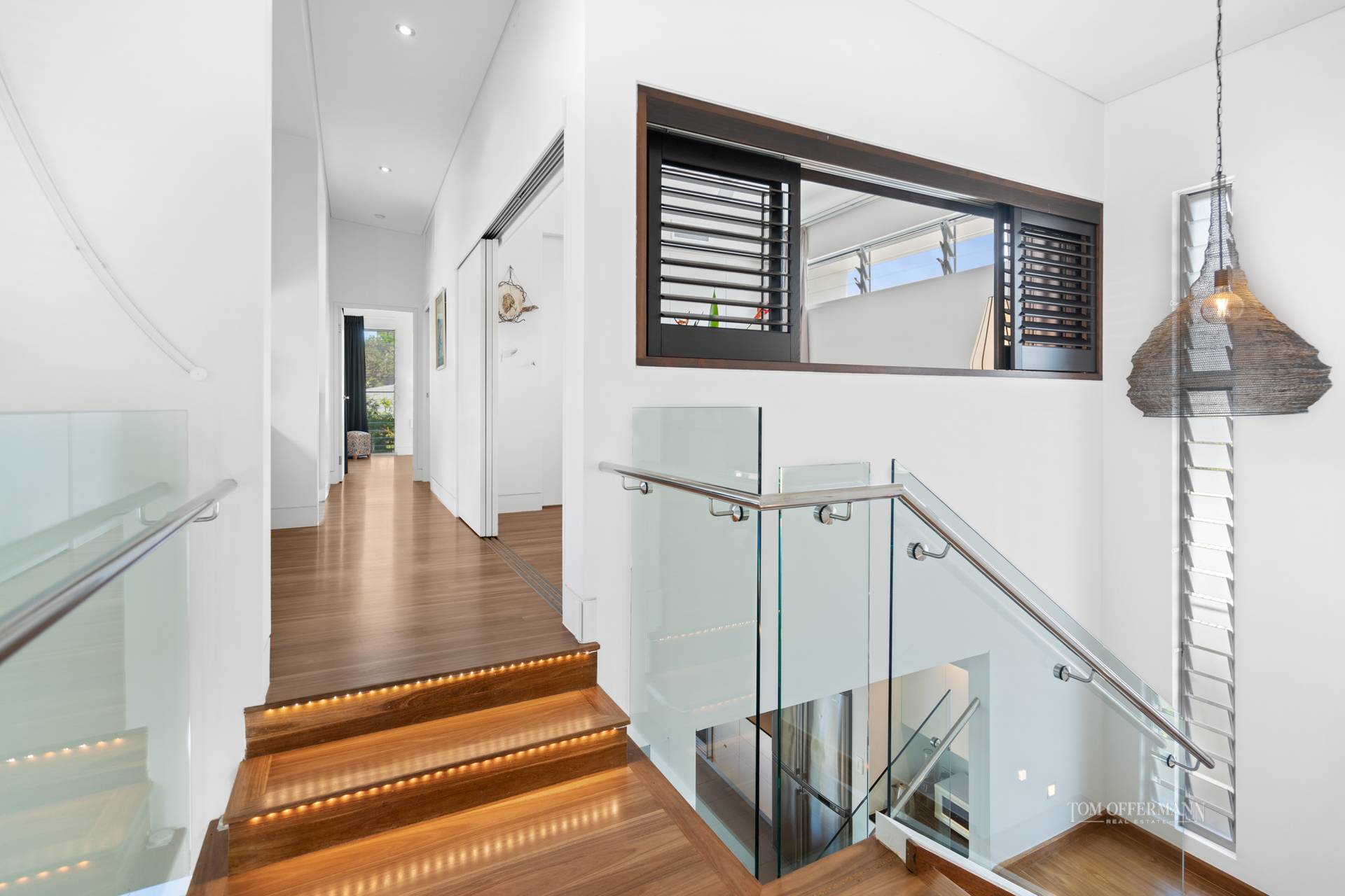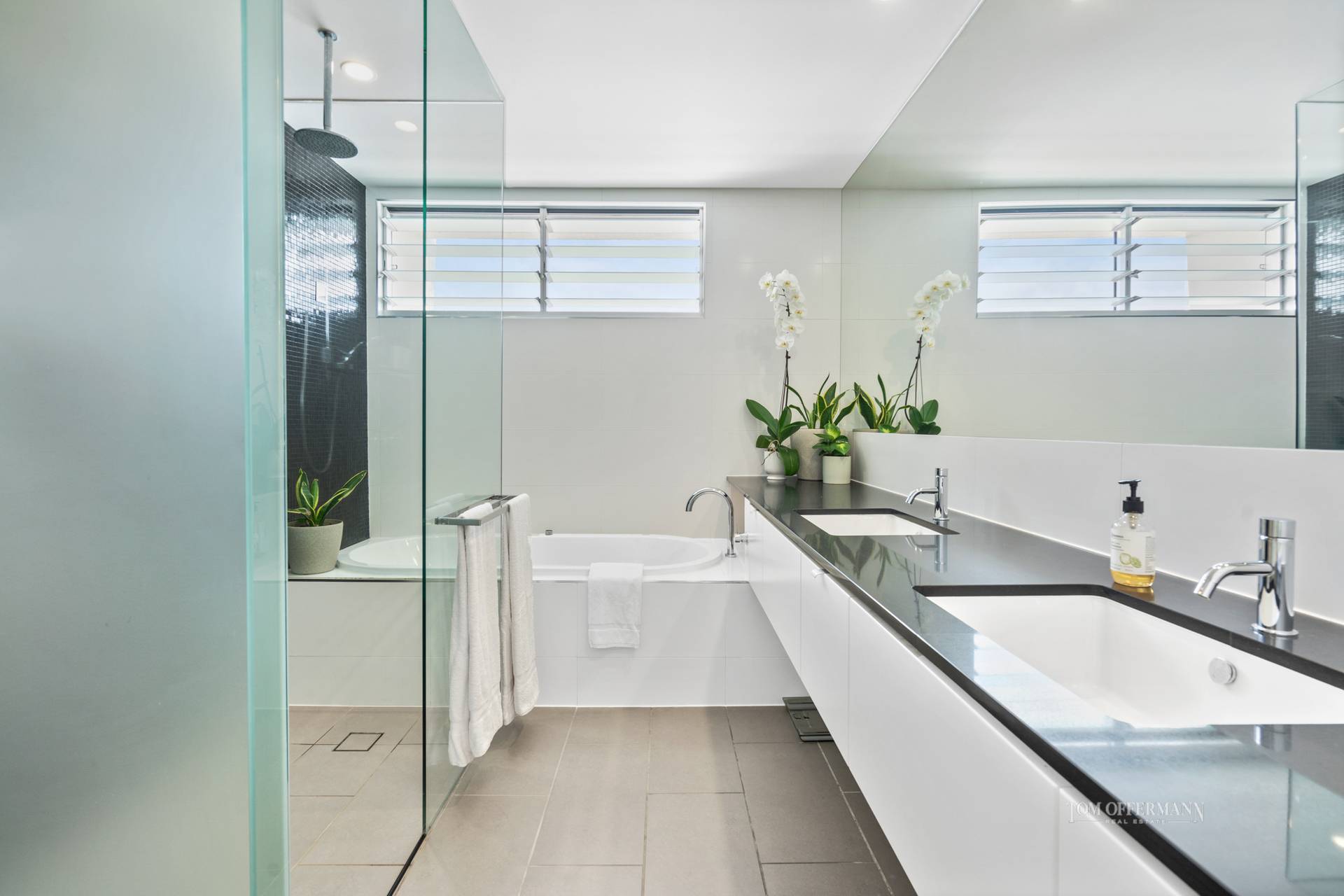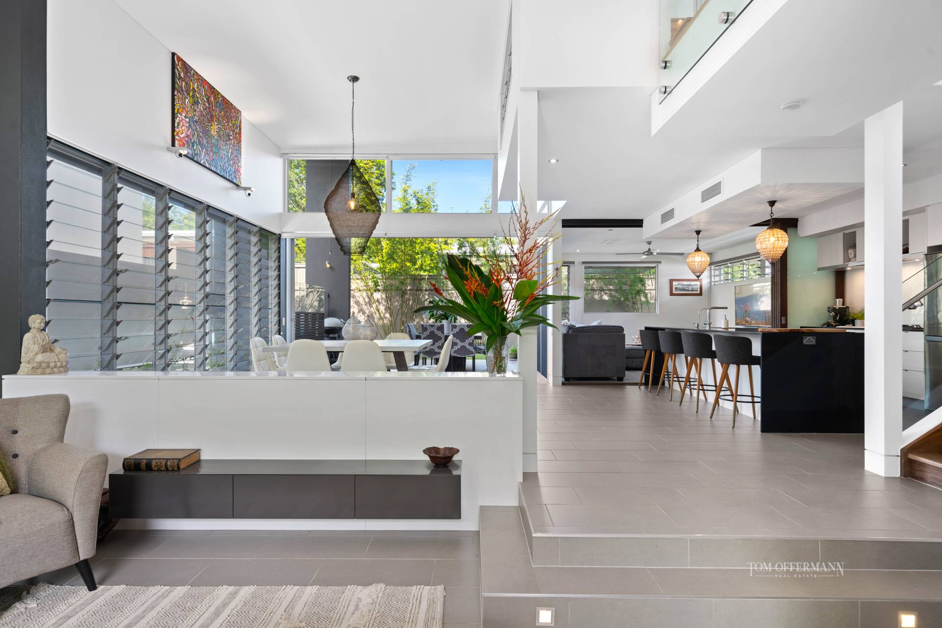 - About: banks of louvres & glass panes floor-to-ceiling; custom stainless steel & glass front door pivots 180 degrees; leisure space w TV retractable w hideaway storage; designer mesh pendants; ducted air-conditioning/fans; C-bus lighting; custom cast concrete dining table + coffee table w eco-oil firepit and drink chill; polished blackbutt flooring upstairs; master suite w walk-in robe, ensuite w spa, wispy sheers & sliders to north facing terrace; 2 queen-size bedrooms w built-in robes; 2 study alcoves; family-size bathroom; laundry w chute; garage w epoxy flooring; downstairs powder room