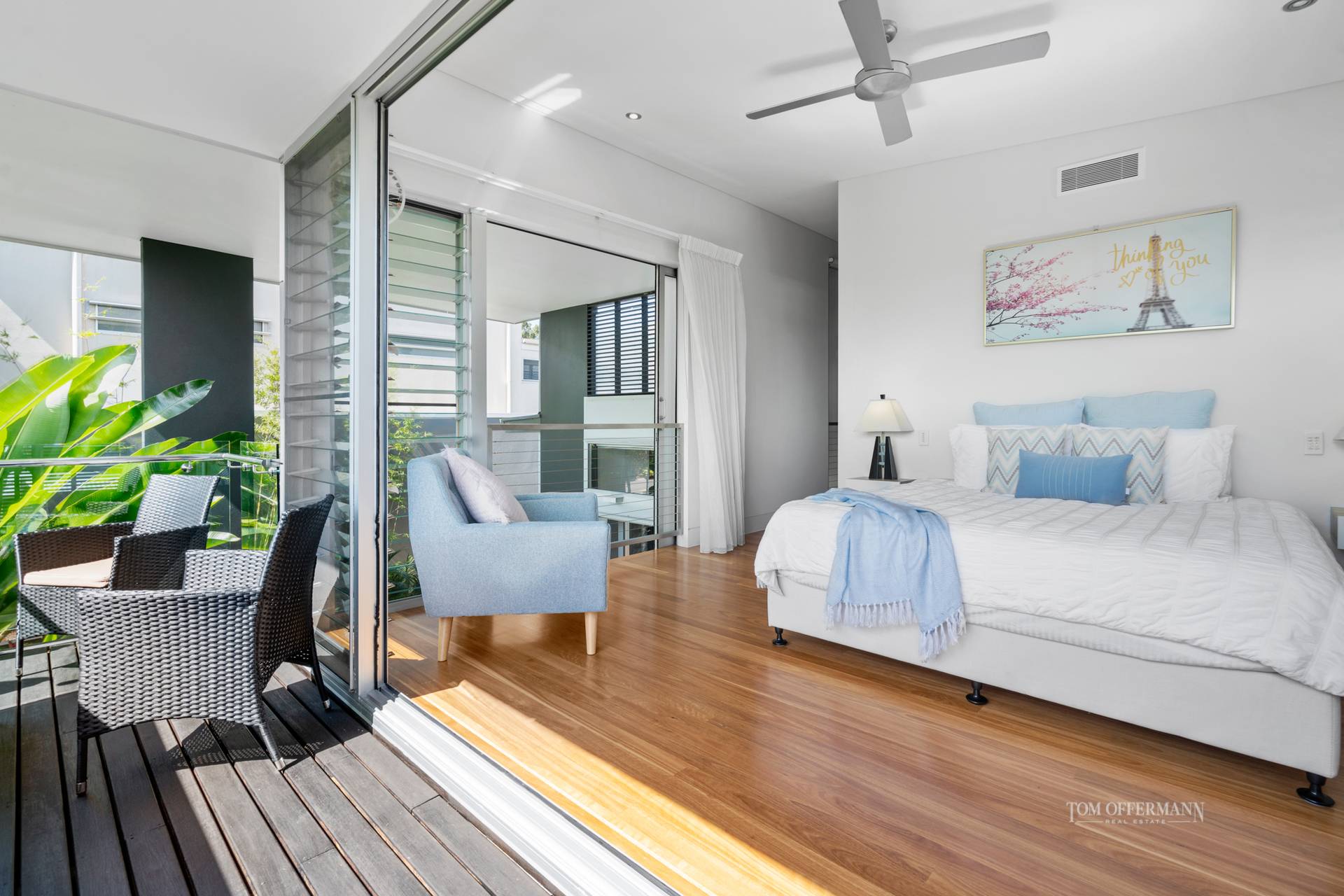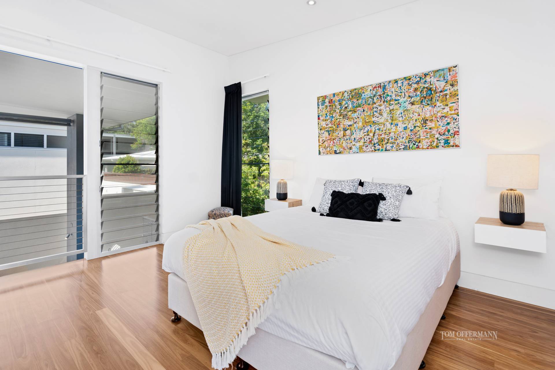Upstairs, the mezzanine level has beautiful blackbutt floors. The sumptuous master suite evokes a feeling of calm and being amongst the treetops. It has a walk-in robe, ensuite with spa bath, wispy sheers and sliders opening to the north-facing terrace.