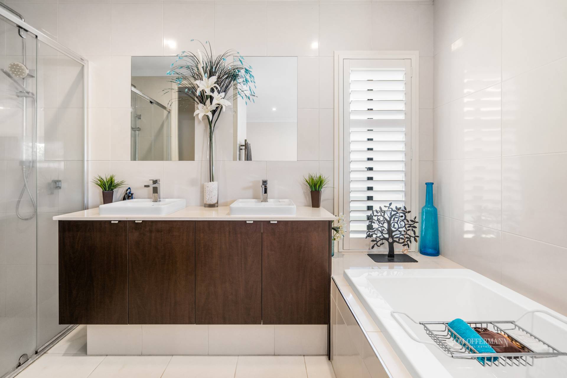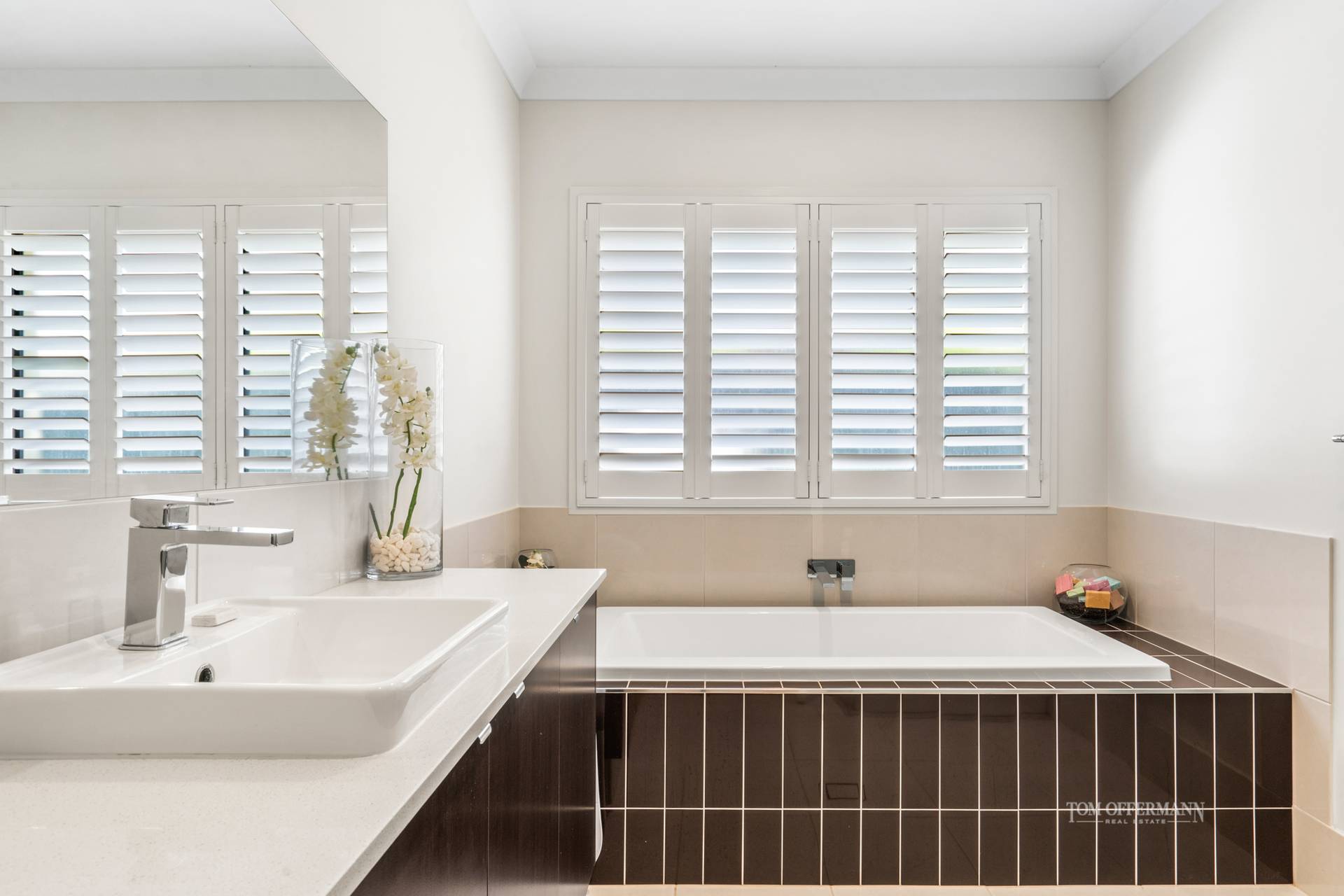 - About: design/high quality; high ceilings/2.7m high doors; honey-toned timber look flooring throughout; ducted aircon/fans; plantation shutters most rooms/roller blinds; wide pivot timber & glass front door; master bedroom suite with study/office nook, walk-in robe, white/natural tiles in open bathroom with deep bathtub, dble vanity, walk-in shower/dble shower heads & sep toilet; separate wing with hang-out/multi-purpose space, 4 queen-size bedrooms with built-in robes, one with ensuite, family-size bathroom with bathtub