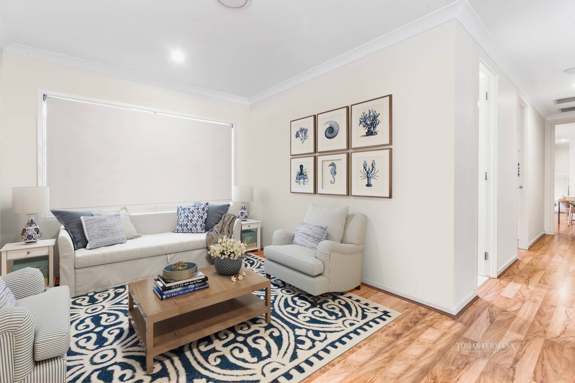Open the striking timber and glass-panelled pivot door, look beyond the entrance way, and be instantly impressed. Note the coastal natural-toned palette and honey-hued flooring throughout, and how spaces from the media room to the over-size open-plan living and dining areas with lofty ceilings, are drenched with natural light.