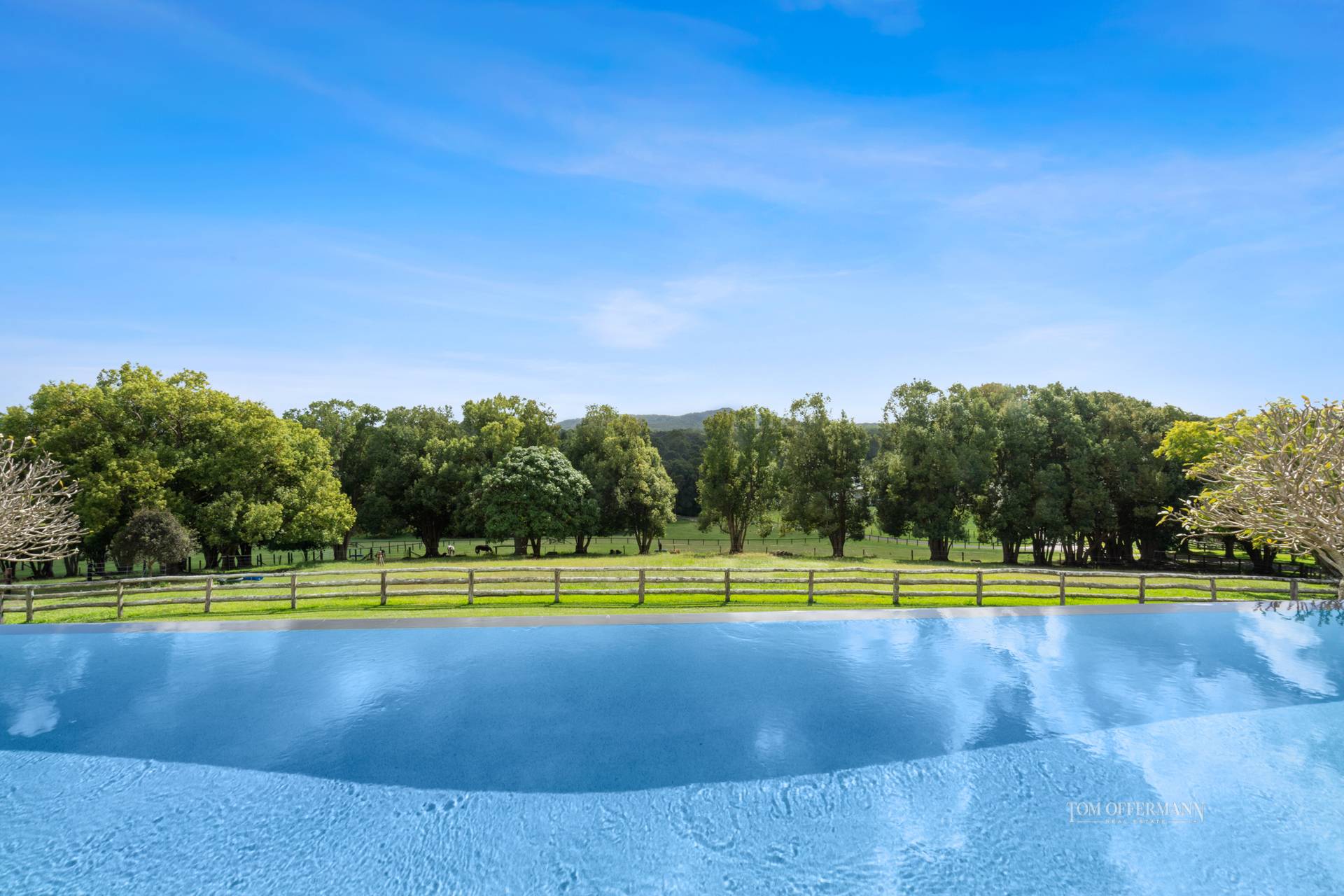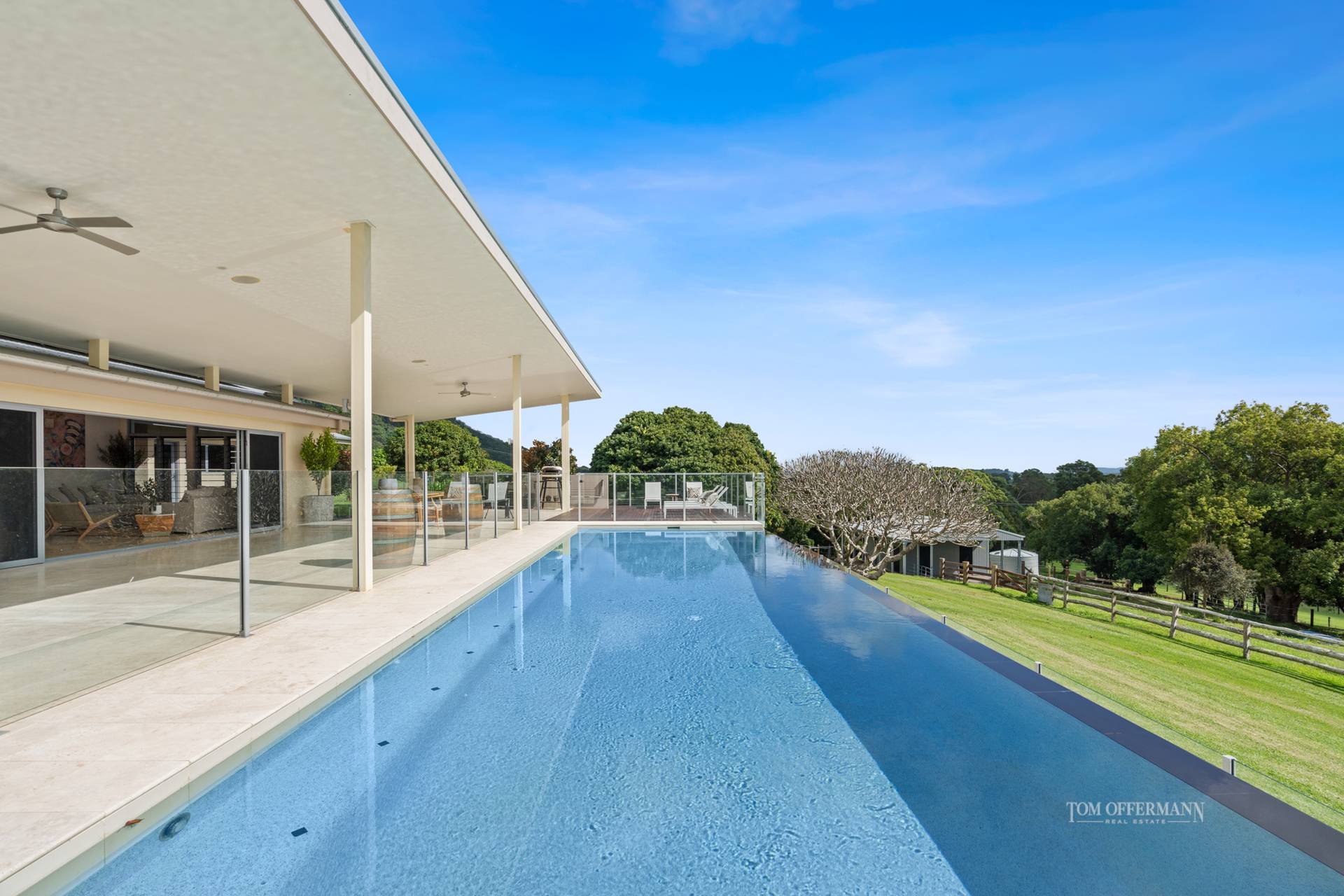 Stealing the limelight is undoubtedly the north-facing infinity pool with glass-like surface. Its foreground positioning totally connects and enhances the spectacular location, as it looks from this brooding eyrie where one can survey the surrounding park-like expansive spread. It's certainly fashioned with visionary eyes including those with an equine/livestock business perspective and of course country spirit.