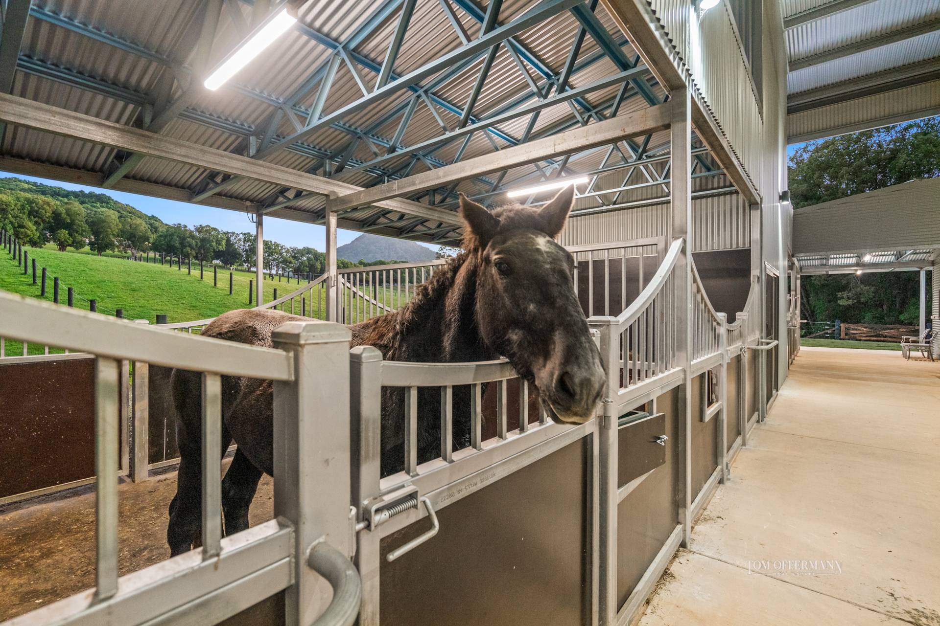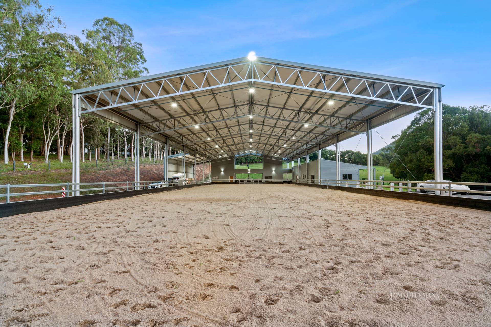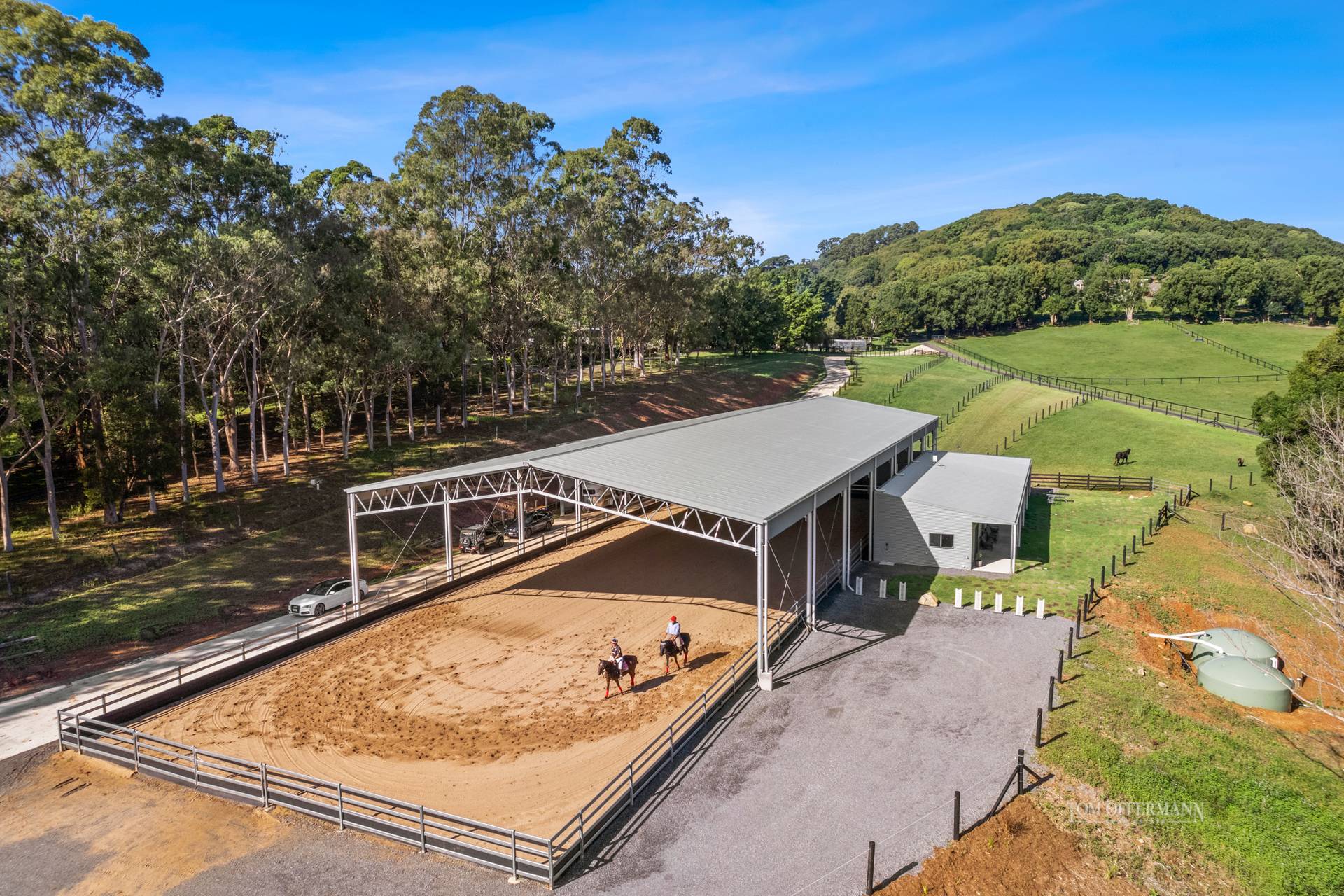 - Equestrian Eventing Arena, registered as Noosa Country Equestrian: brand new including dedicated 450m concrete sealed driveway for trucks, horse floats, land cruisers etc; building size 1284m2; extended roof height of 8 metres, 4-bay shed stables & walk-in/walkout paddocks, Olympic competition sized 60m x 22m covered & fenced arena complex with LED lighting; complex with 4 stables, all with rubber matting, tack room, feed room, two wash down bays, viewing areas, covered parking and drive through access; 2 self-contained one-bedroom apartments (135m2), each with large water tank + separate property access & parking