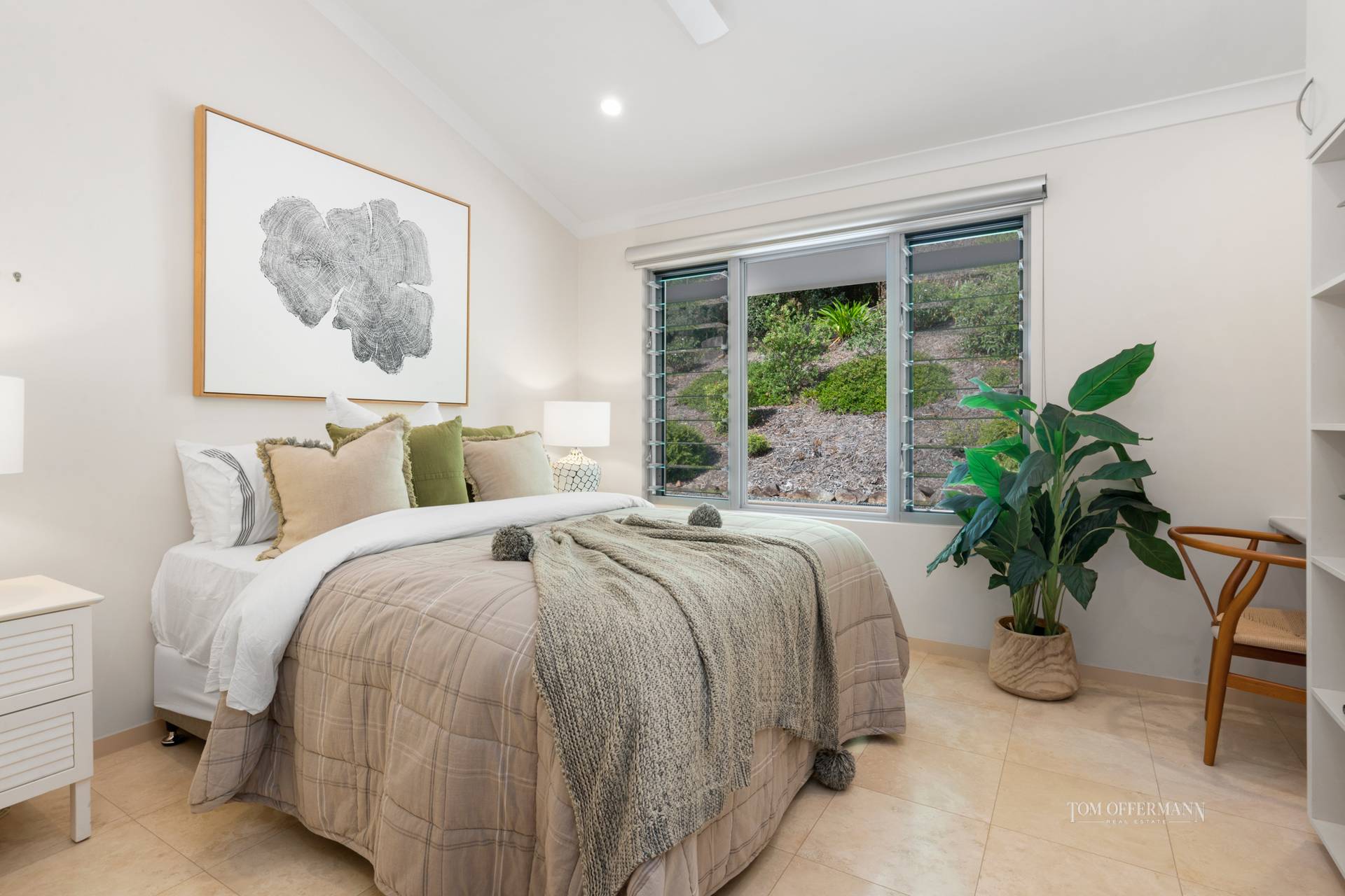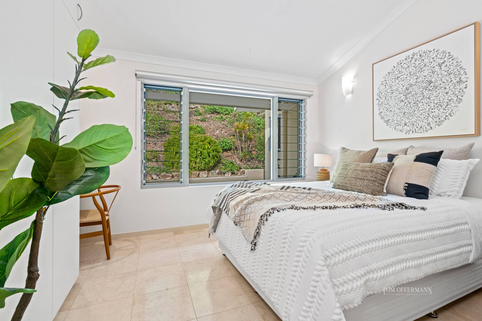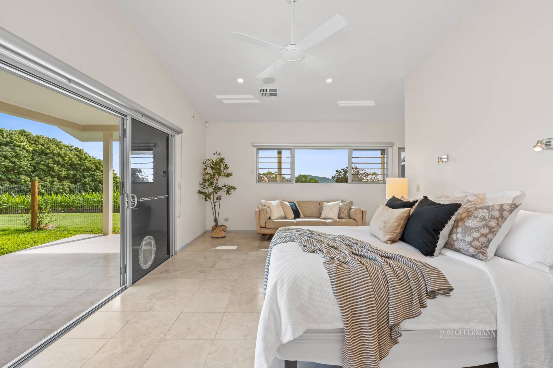 Dreamtime and the west wing king master suite is luxe, private and has breathtaking views from bed and the terrace. It has a walk-in robe and a showpiece ensuite, which like the other two bathrooms has travertine on the floor and up to the ceiling, also a lengthy double vanity and walk-in shower plus spa bath. There are four additional large bedrooms. One has an ensuite and walk-in robe, and one is currently used as a study.