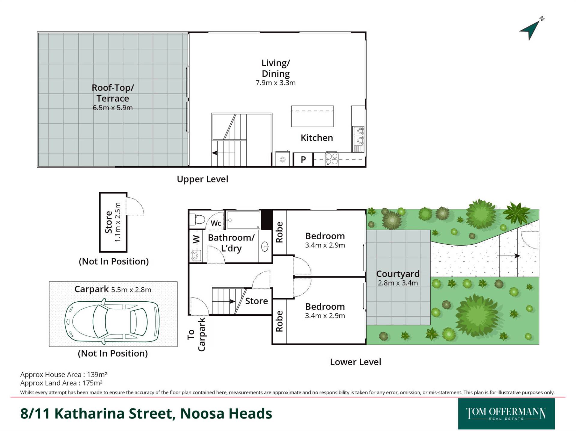 • About: 2-level, end of complex, light filled; newly renovated throughout w rooftop terrace 6.5m x 5.9m off living/dining area; Noosa Hinterland views; bedrooms w built-in robes & fans