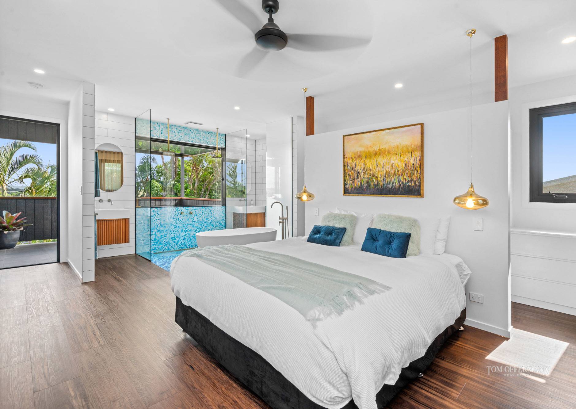 Upstairs is the piece de resistance, the king-of-kings master suite. With its gas-lift window opening to an undercover terrace so expansive Hinterland views and magical sunsets over Mt Cooroy can be admired from bed, the free-standing bathtub or the shower, perhaps it really is a retreat.