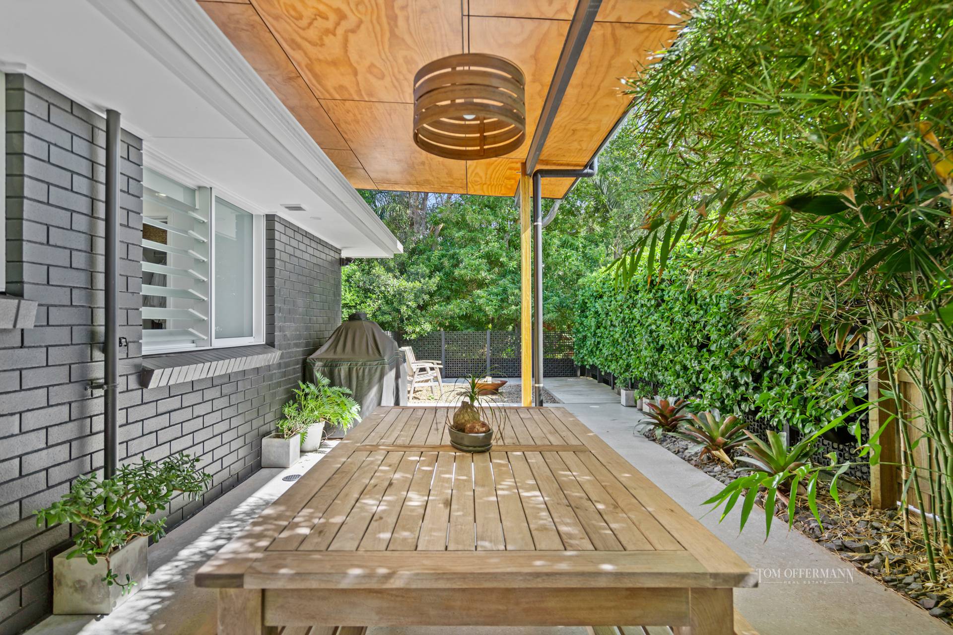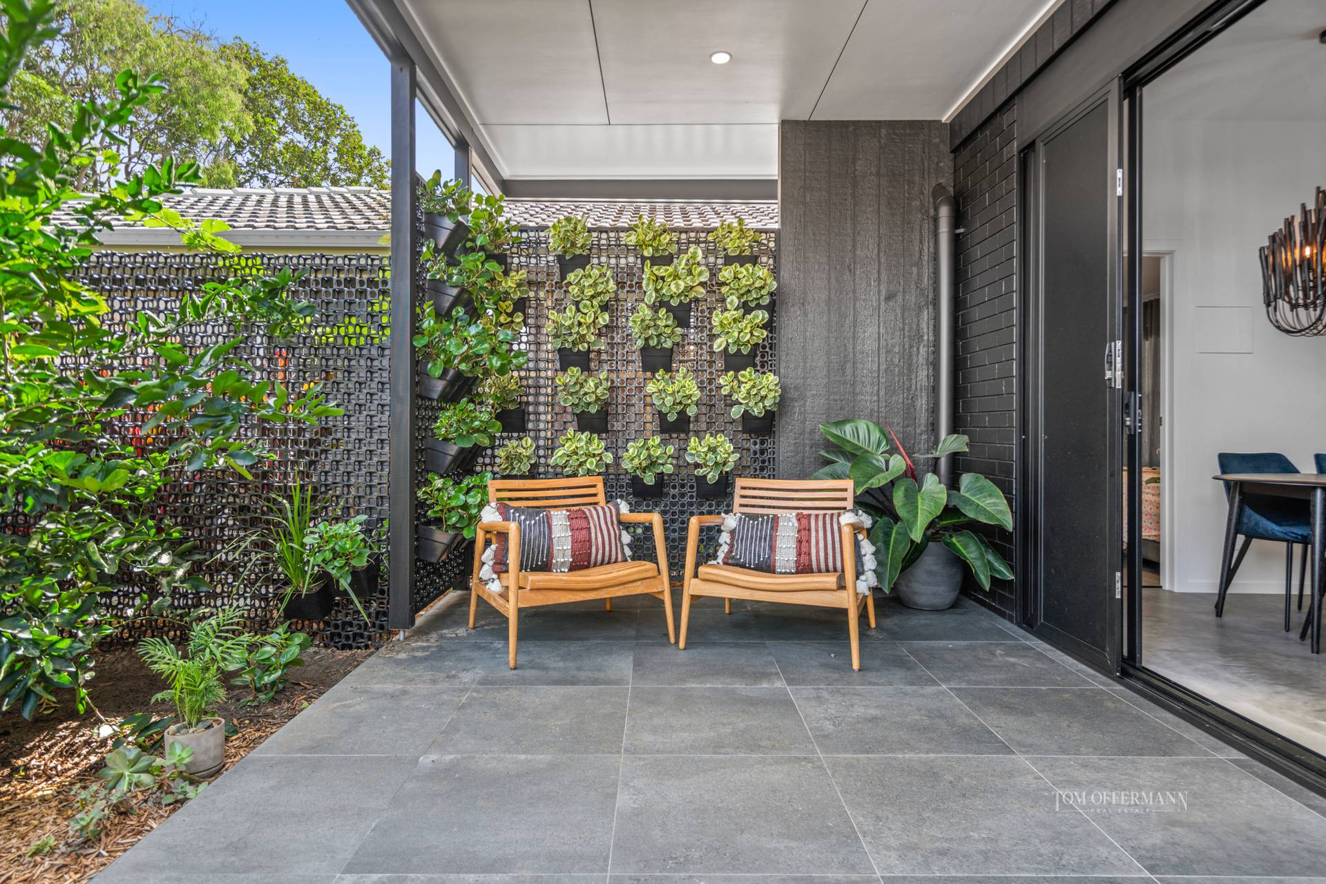 Accessed by 'disappearing' bi-folds on the north-side is another perfect-for-entertaining terrace. It is covered, has a 'green' wall of potted plants, and the garden at the rear has citrus trees, raised vegetable garden beds and fire pit, for the colder evenings.