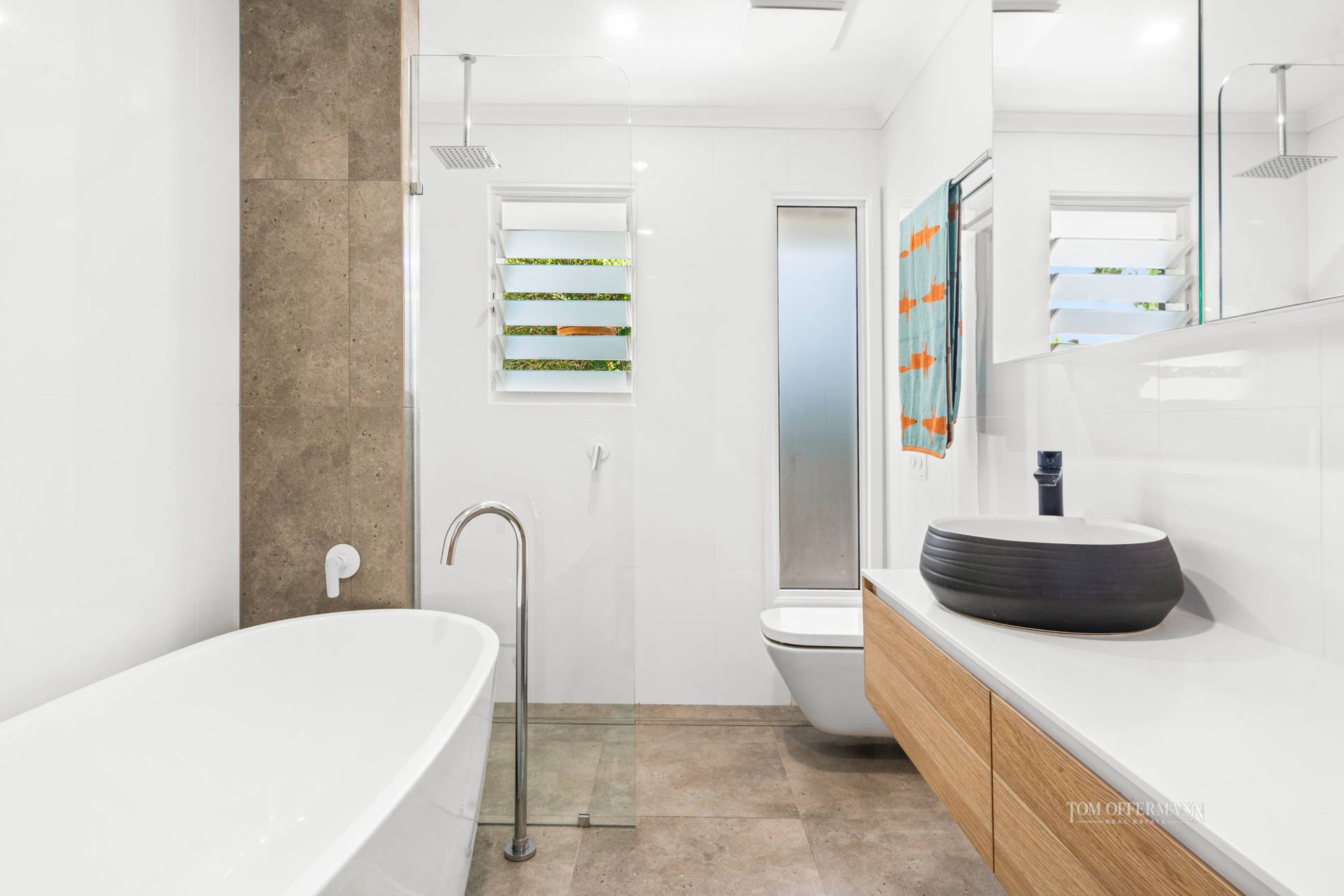The residence boasts two king master suites. Downstairs it has an ensuite and walk-in robe, while also on the southside are two queen-size bedrooms with built-in robes/desk plus a bathroom with bathtub.