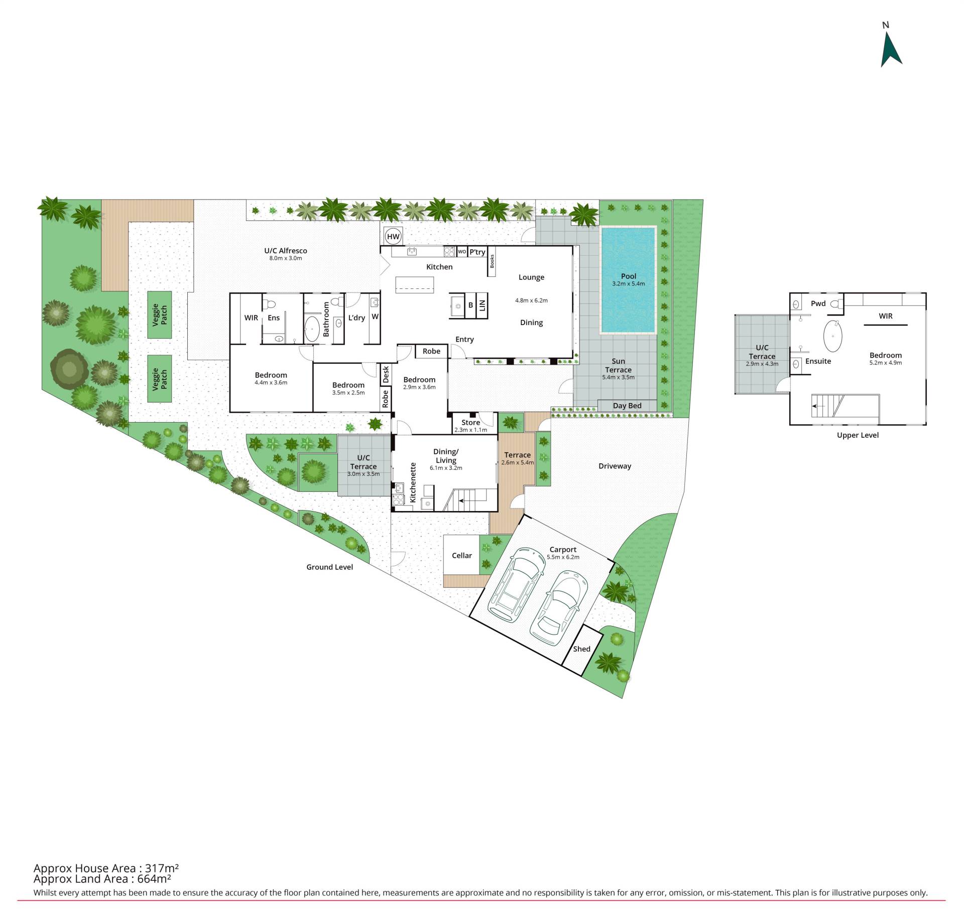 • About: Versatile floor plan - The design offers a fully self-contained one-bedroom living, with its own entrance and outdoor living spaces. Excellent for guests or rent/income.