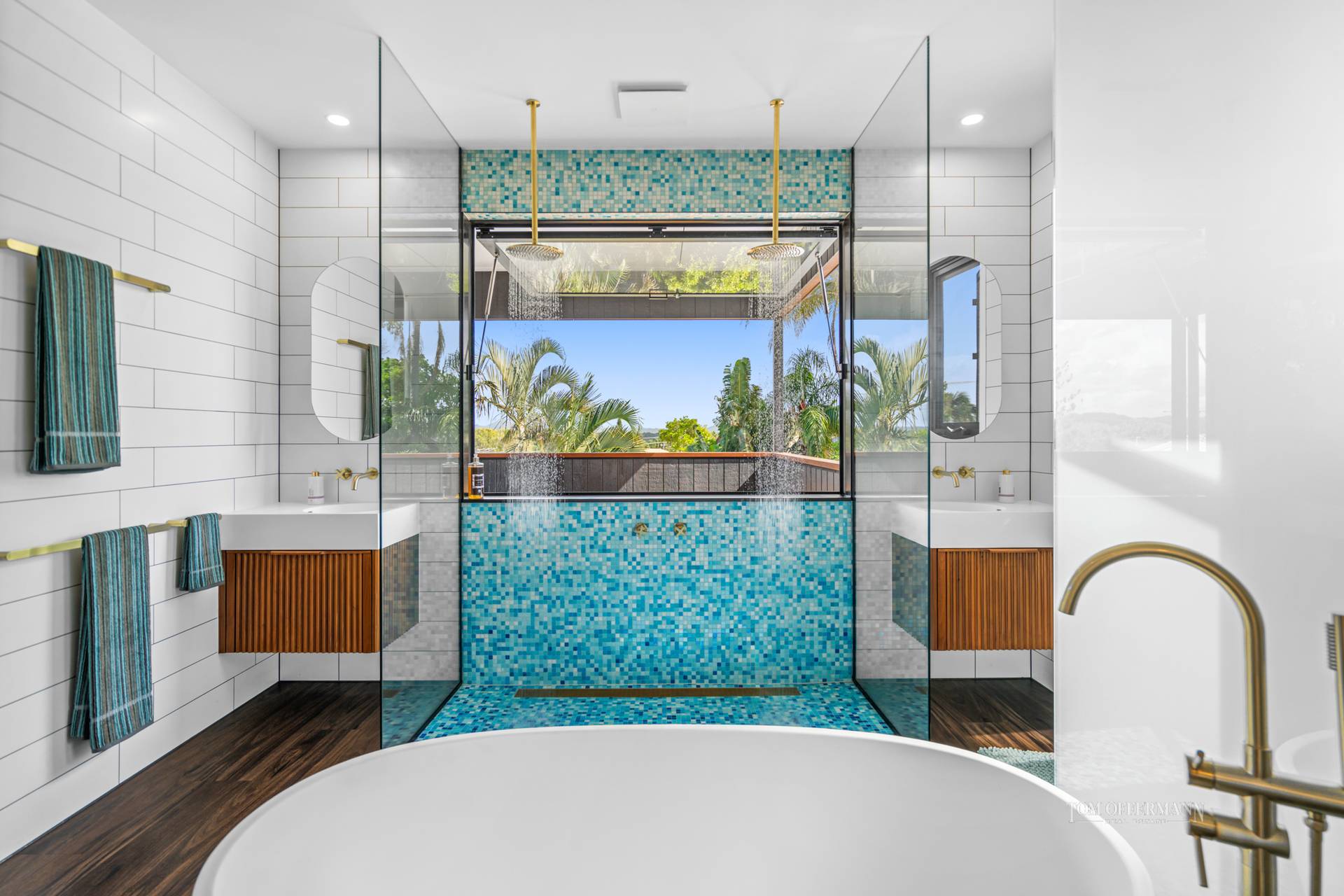 • 2 king master suites – upstairs retreat-style w walnut-toned floors, high ceiling, feature free-standing oval bathtub, double shower, Italian tiles, powder room, walk-in robe, gas-lift window to undercover terrace & hinterland views; downstairs master w ensuite, walk-through robe; 2 queen-size bedrooms w built-in robes/desk + bathroom w bathtub