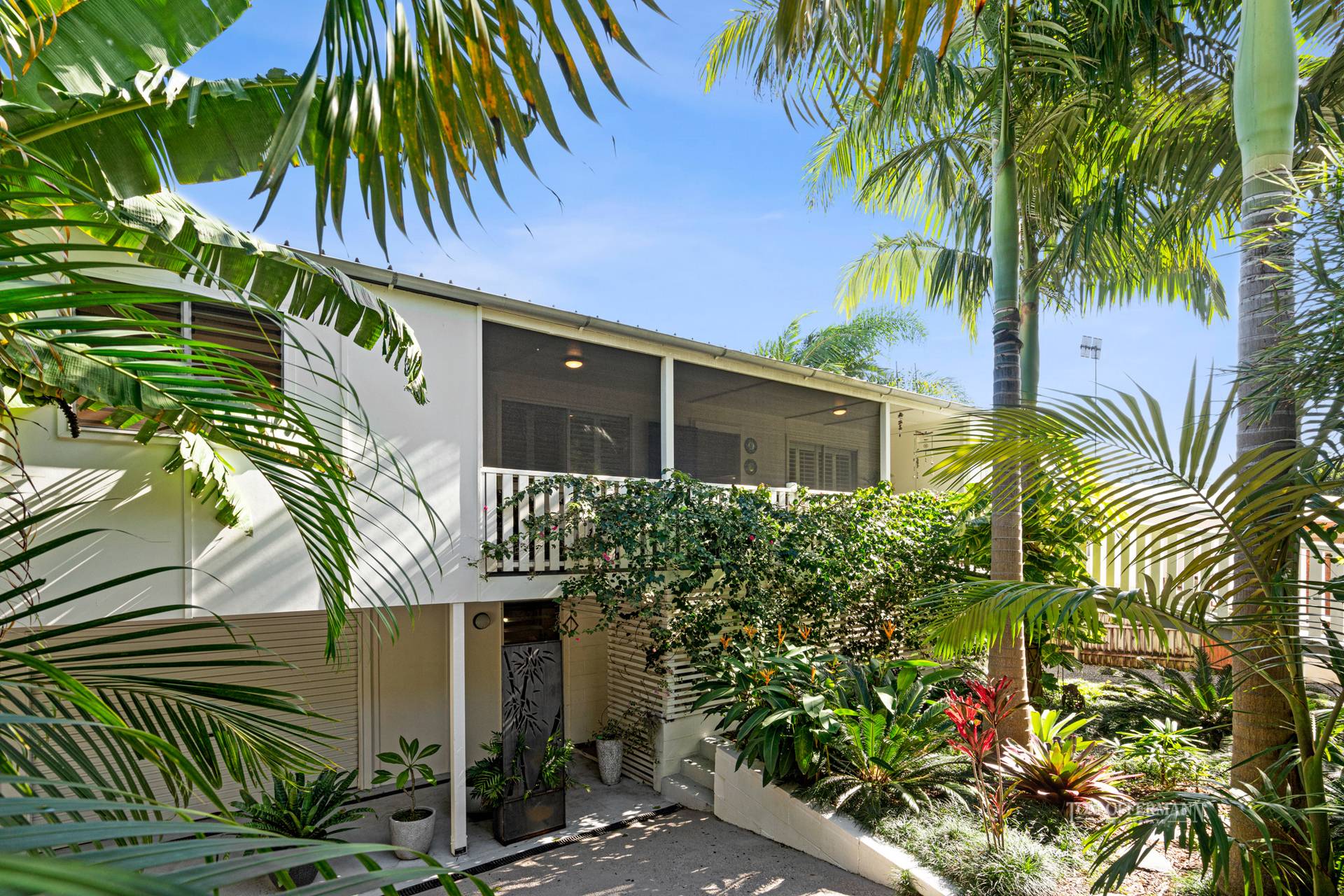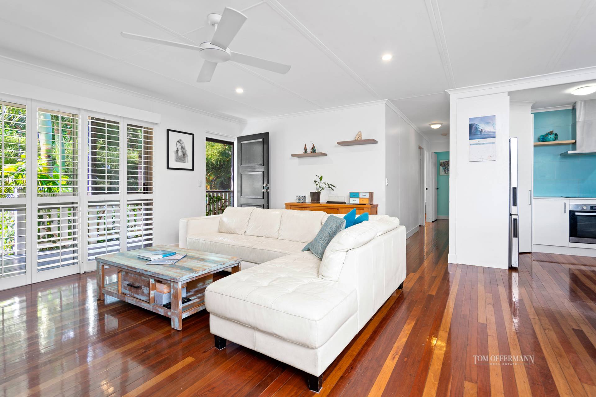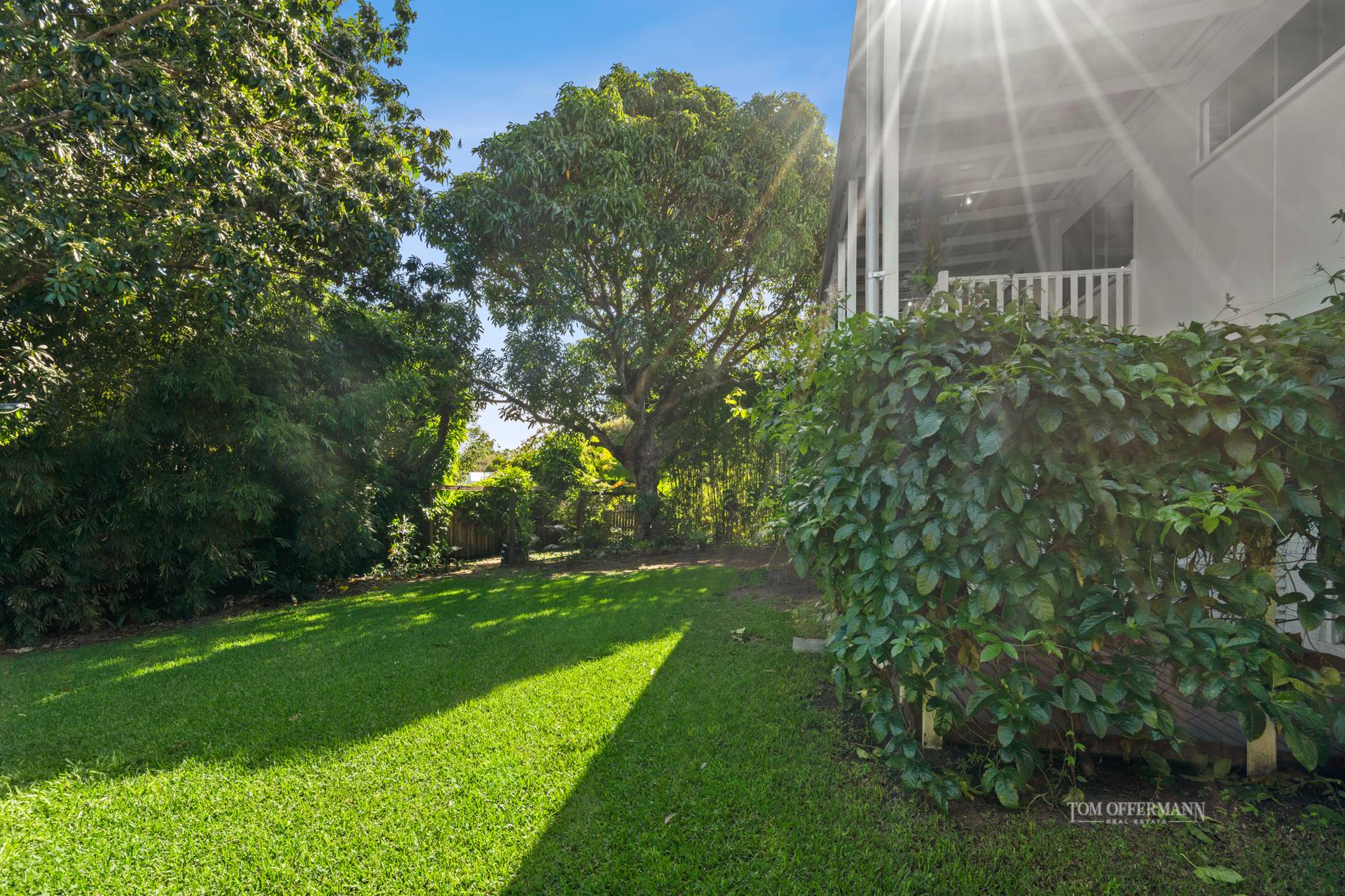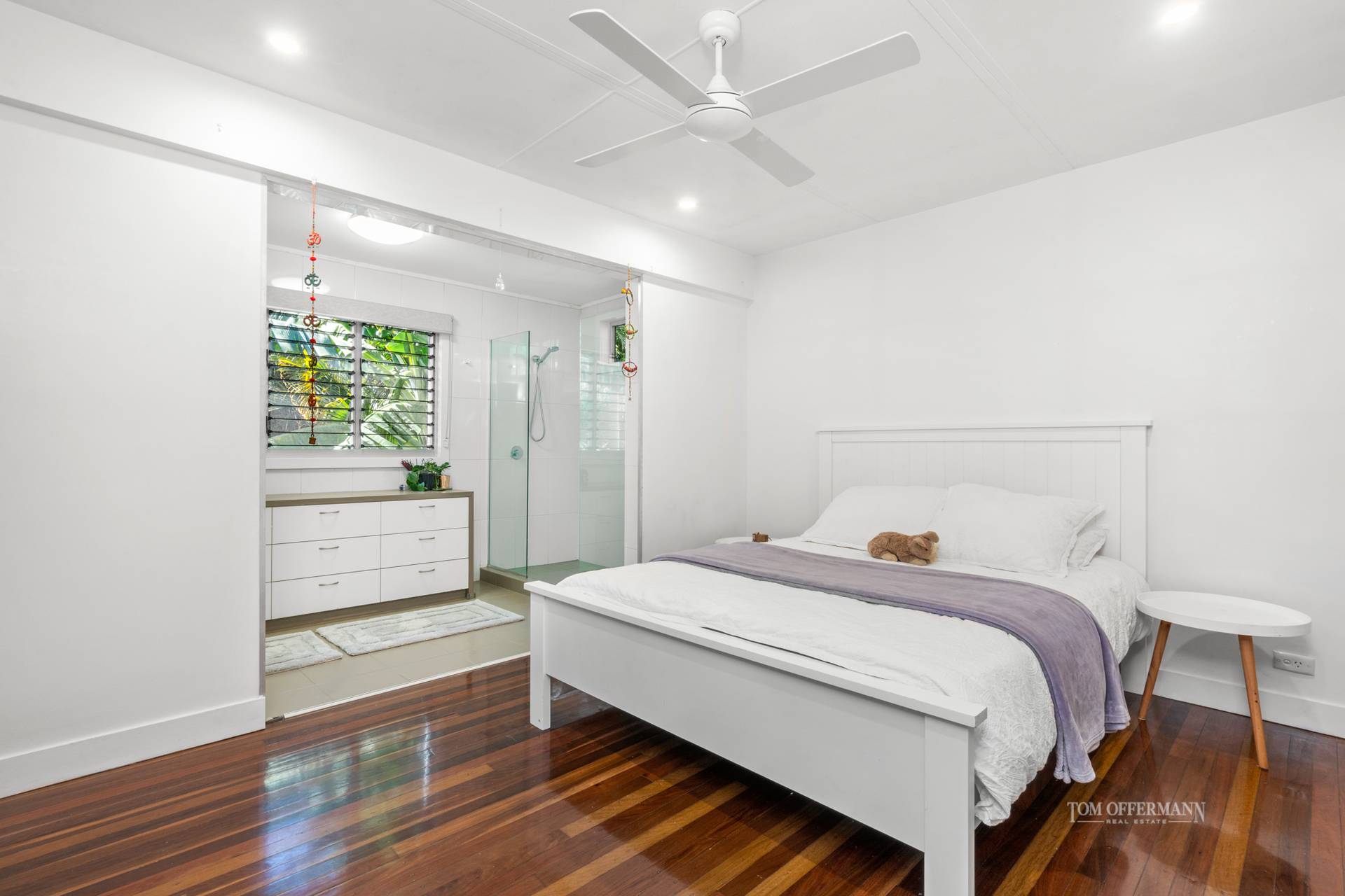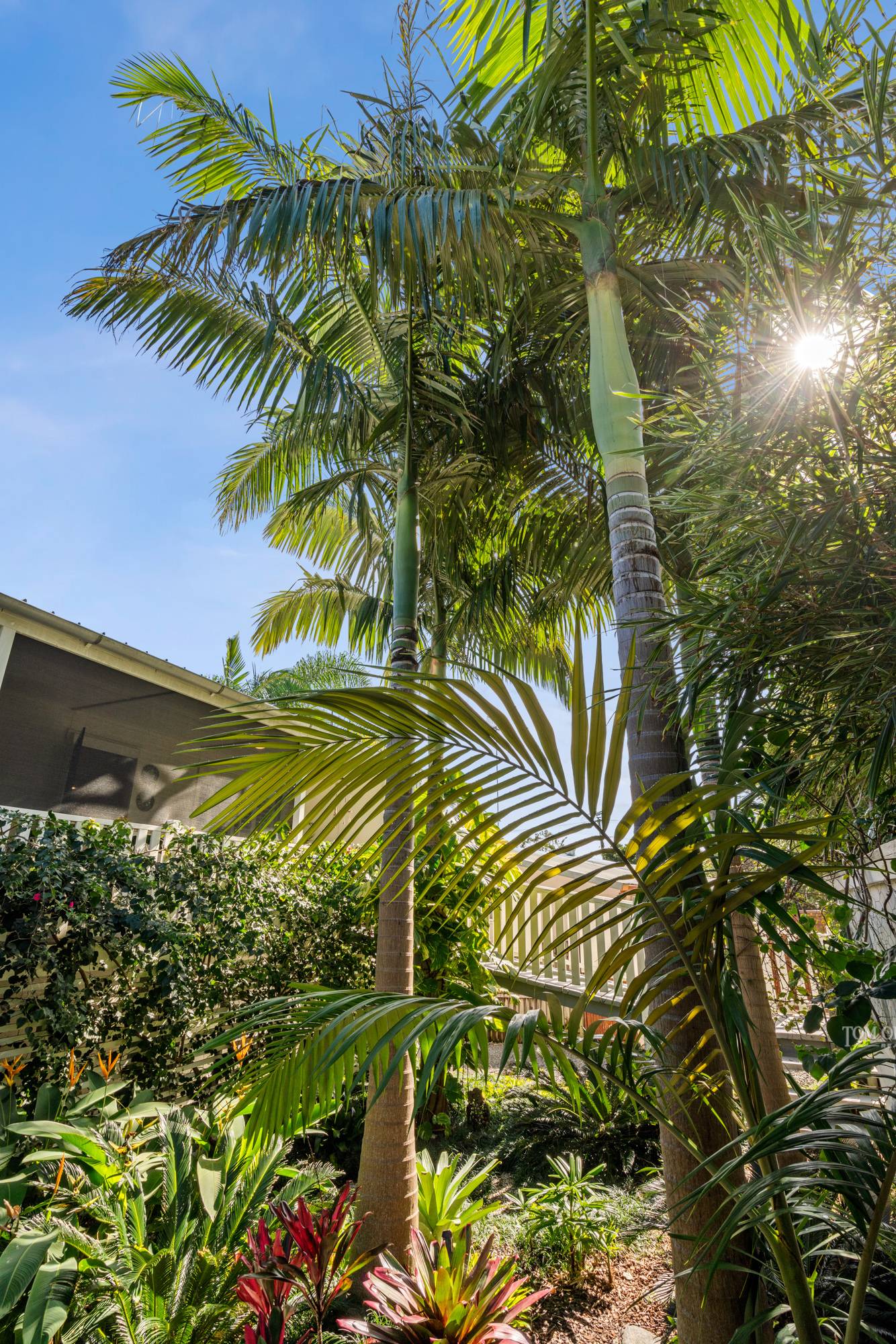 Open plan living with high ceilings, an emphasis on the on-trend monochromatic palette of muted tones, while bright natural light bouncing across exquisite, polished timber floors, shares the limelight with generous spaces such as the dedicated dining space. It not only has a wall of storage but coalesces with the wide rear verandah. Think alfresco drinks, barbeques, or a safe area for the kids to play, and admire the back garden shrouded in lush tropical greenery such as bird-attracting shrubs and a massive mango tree.