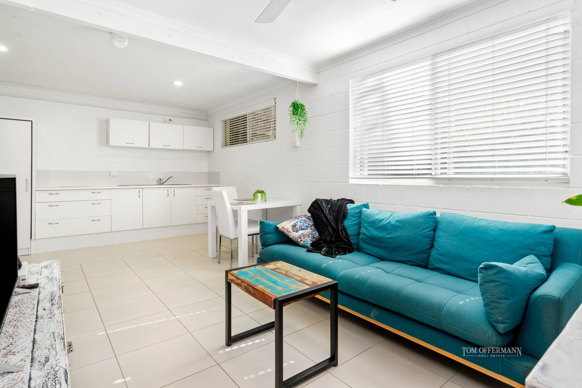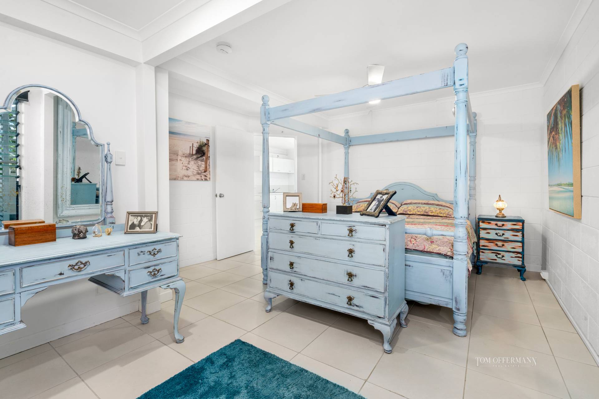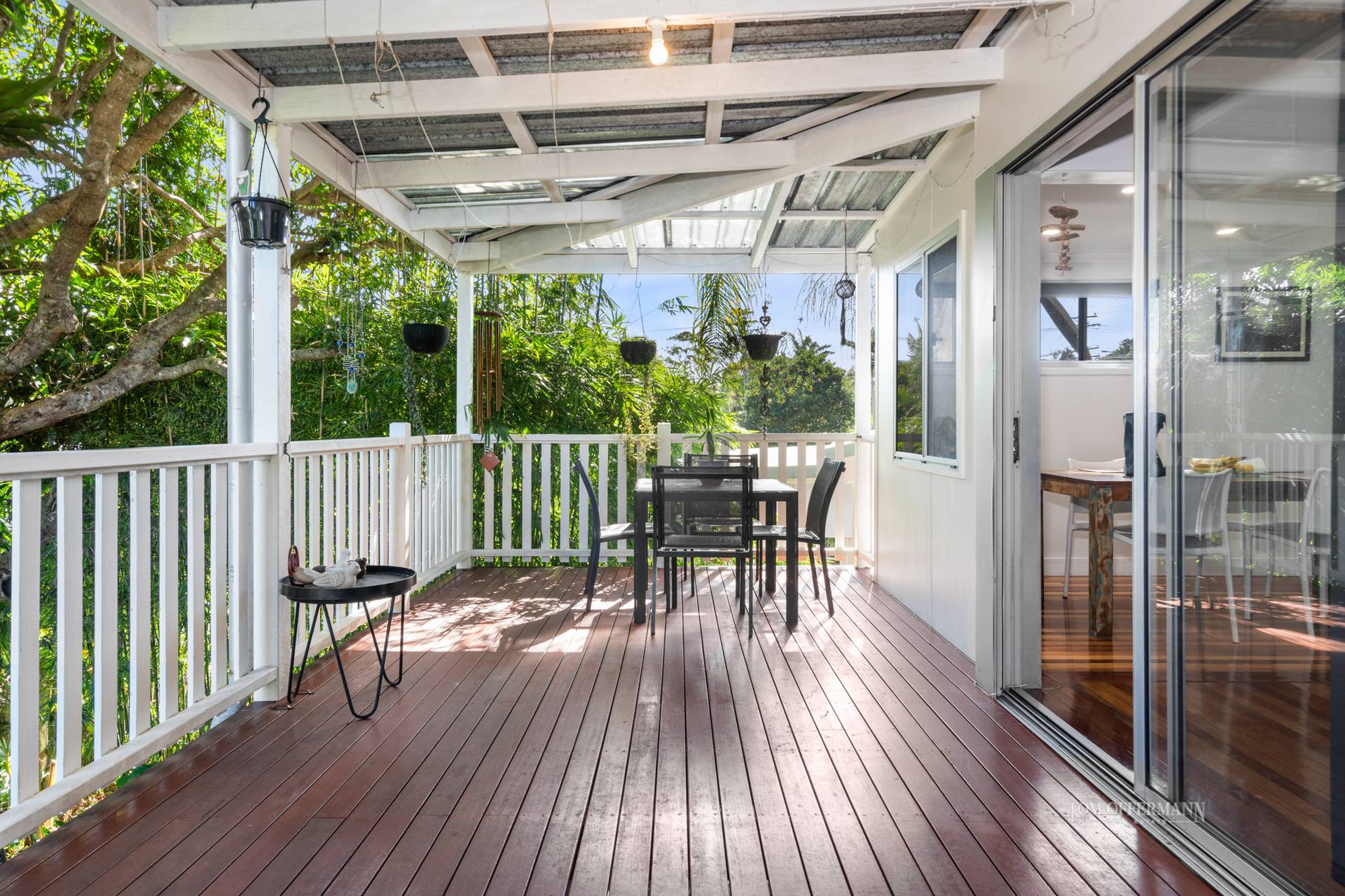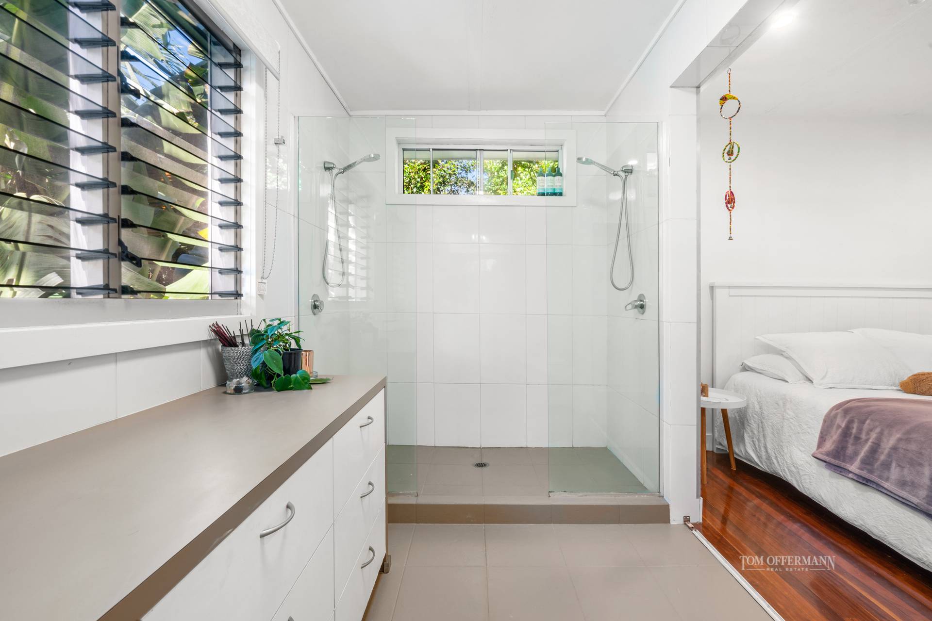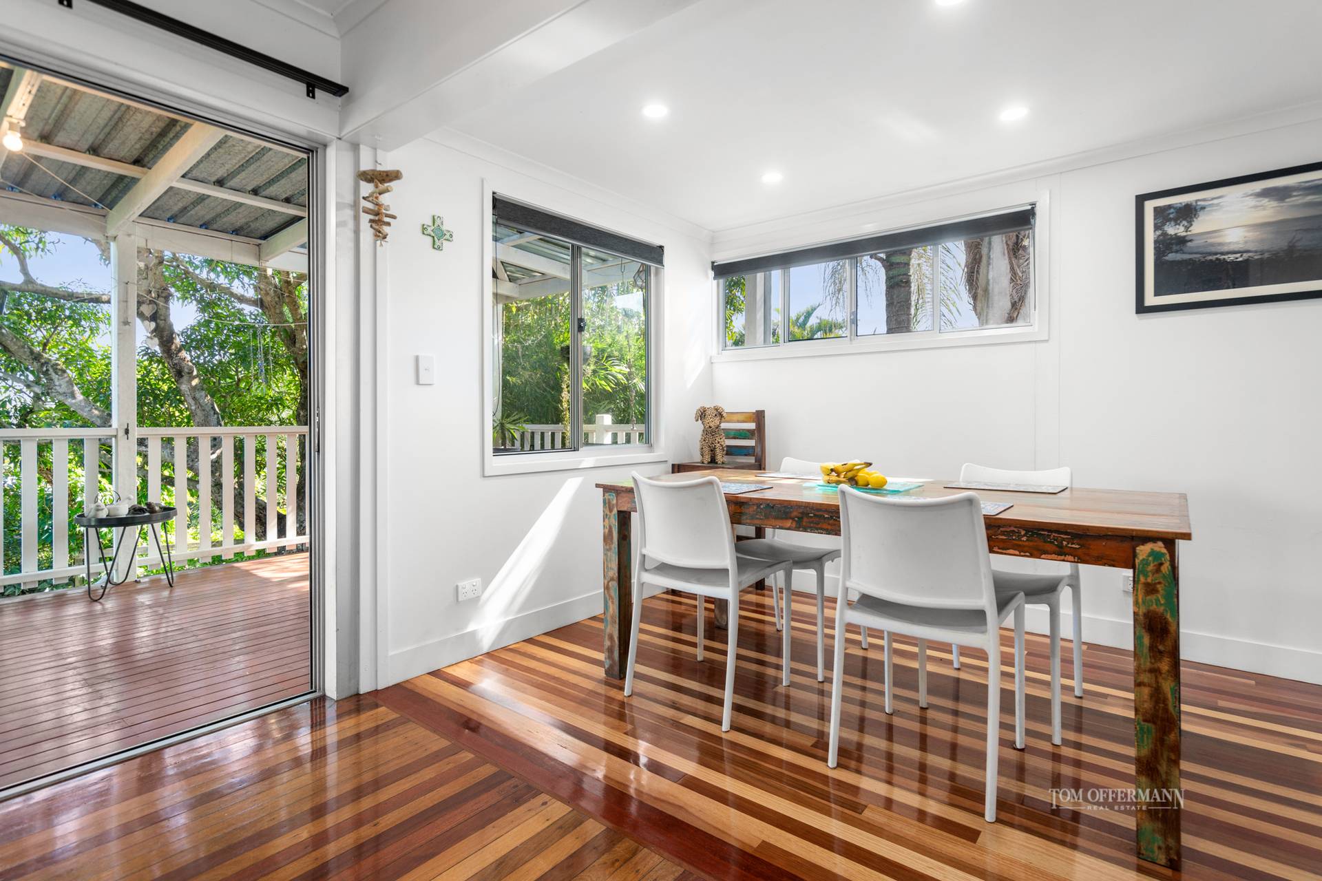 Open plan living with high ceilings, an emphasis on the on-trend monochromatic palette of muted tones, while bright natural light bouncing across exquisite, polished timber floors, shares the limelight with generous spaces such as the dedicated dining space. It not only has a wall of storage but coalesces with the wide rear verandah. Think alfresco drinks, barbeques, or a safe area for the kids to play, and admire the back garden shrouded in lush tropical greenery such as bird-attracting shrubs and a massive mango tree.