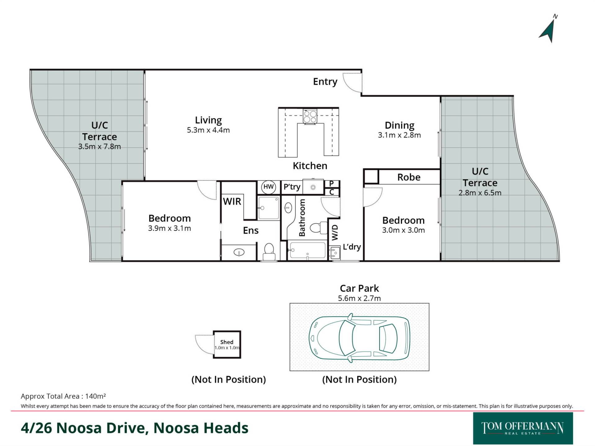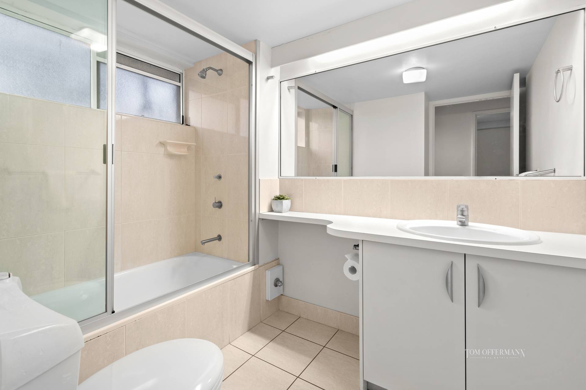 - About: 2 undercover terraces 3.5m x 7.8m & 2.8m x 6.5m; pale terracotta floor tiles; 2 bedrooms both access terrace - master with walk-in robe & ensuite, 2nd with built-in robe; bathroom with bath; laundry with washing machine & dryer; aircon/fans; secure single undercover car parking + lock-up