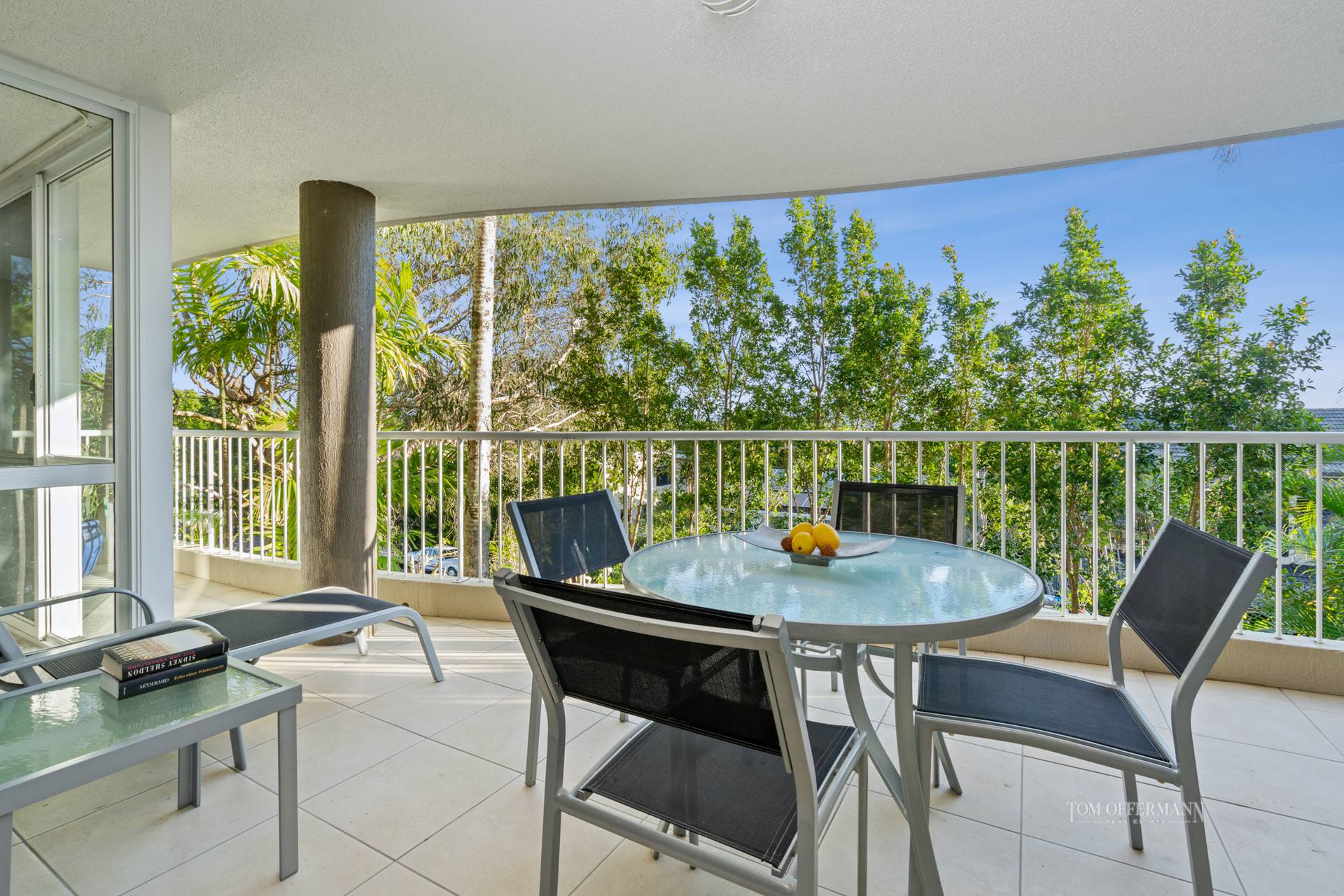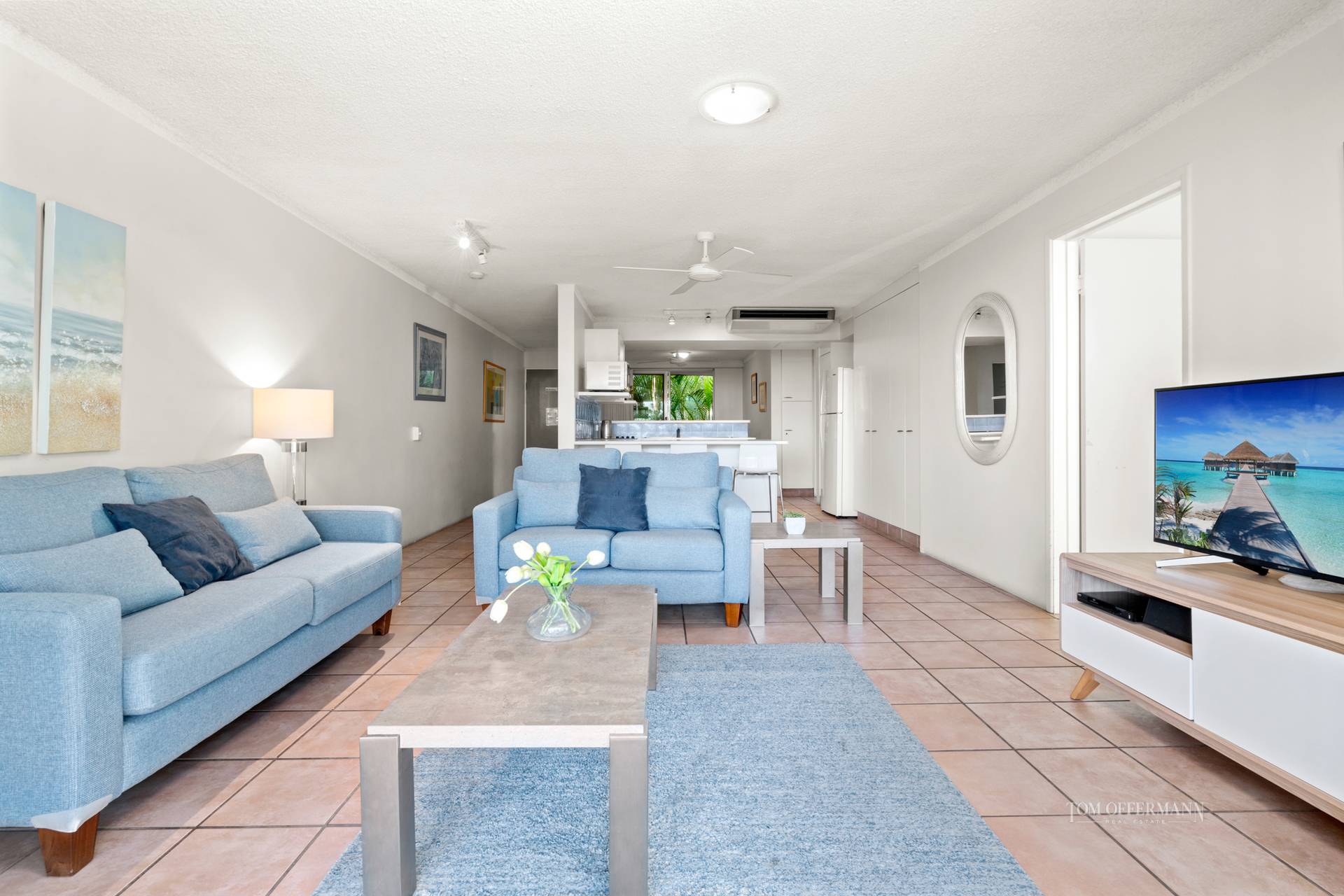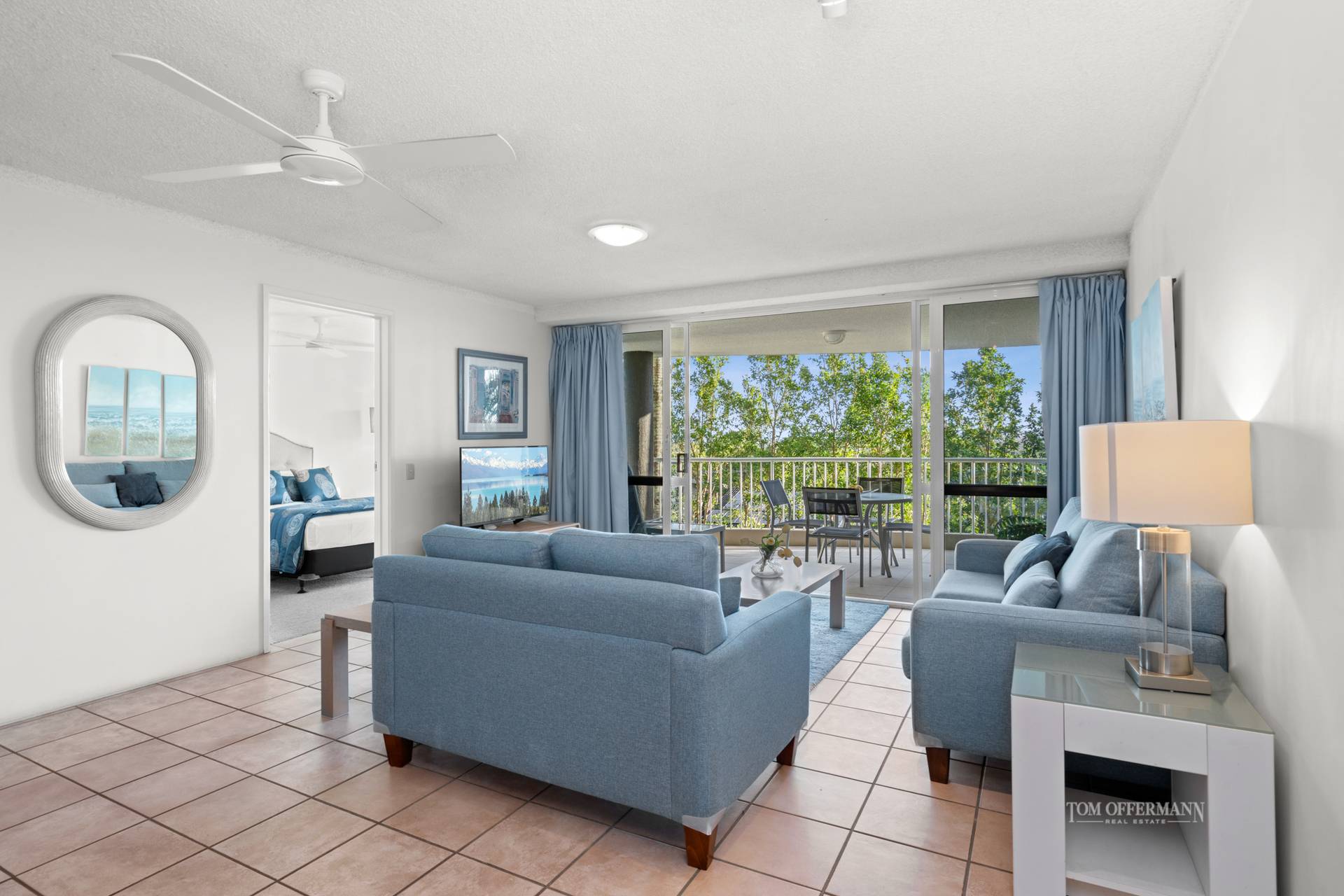 The apartment, at the quiet end of the resort has pale terracotta flooring, and a coastal aesthetic with blue sofas, seaside artworks and cane chairs. Natural light drenches the main living area which opens out to an extra-large covered terrace and stretches the width of the apartment on the north-westerly side. It is also accessed from the carpeted master bedroom with walk-in robe and ensuite.