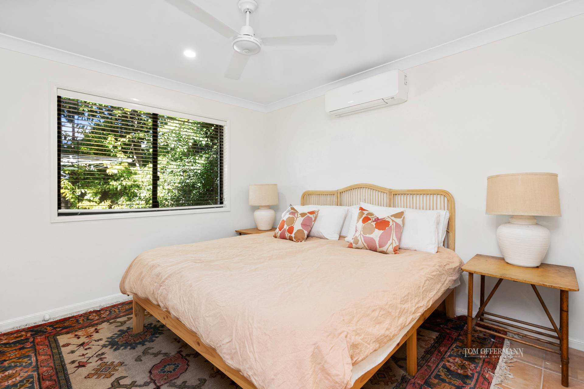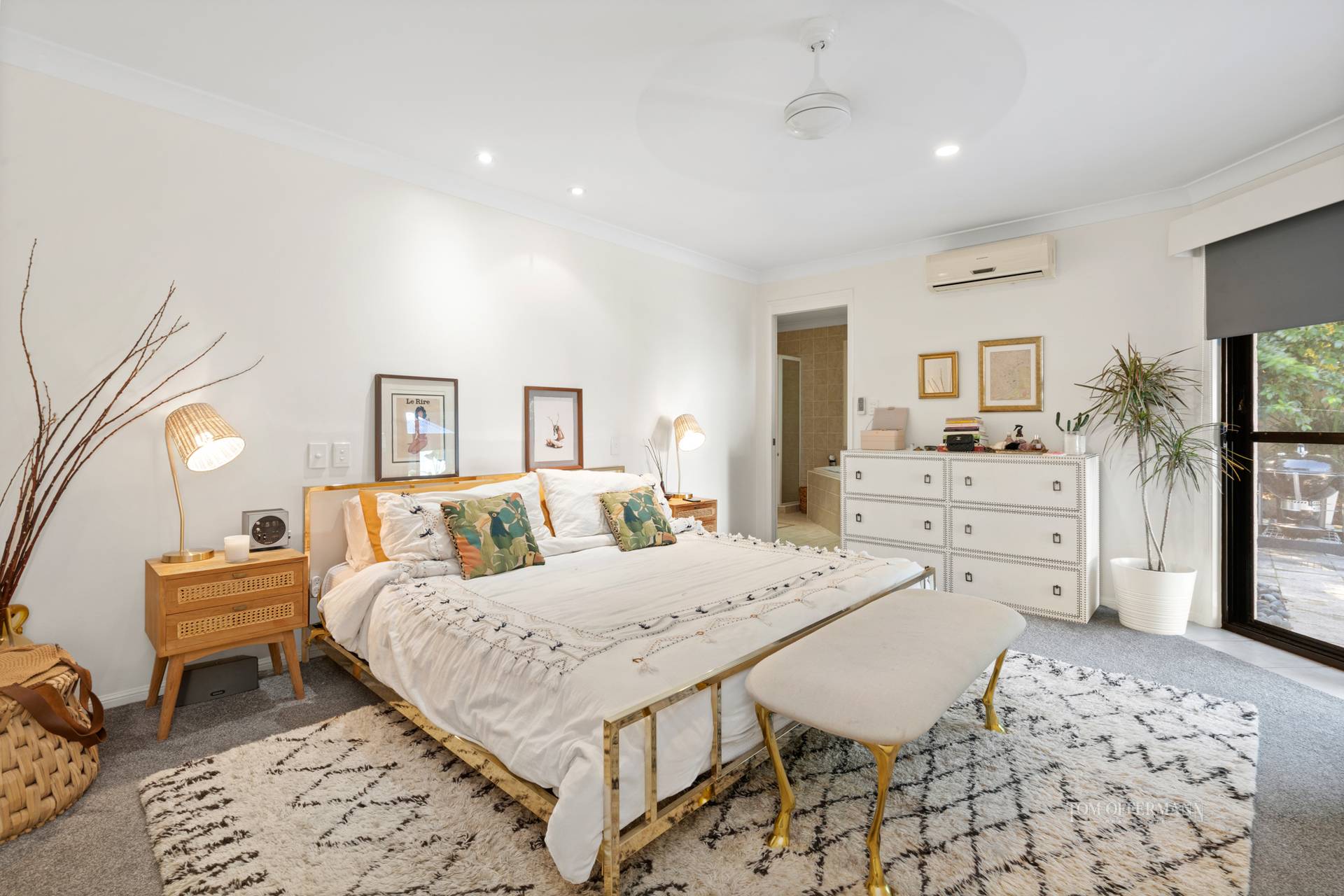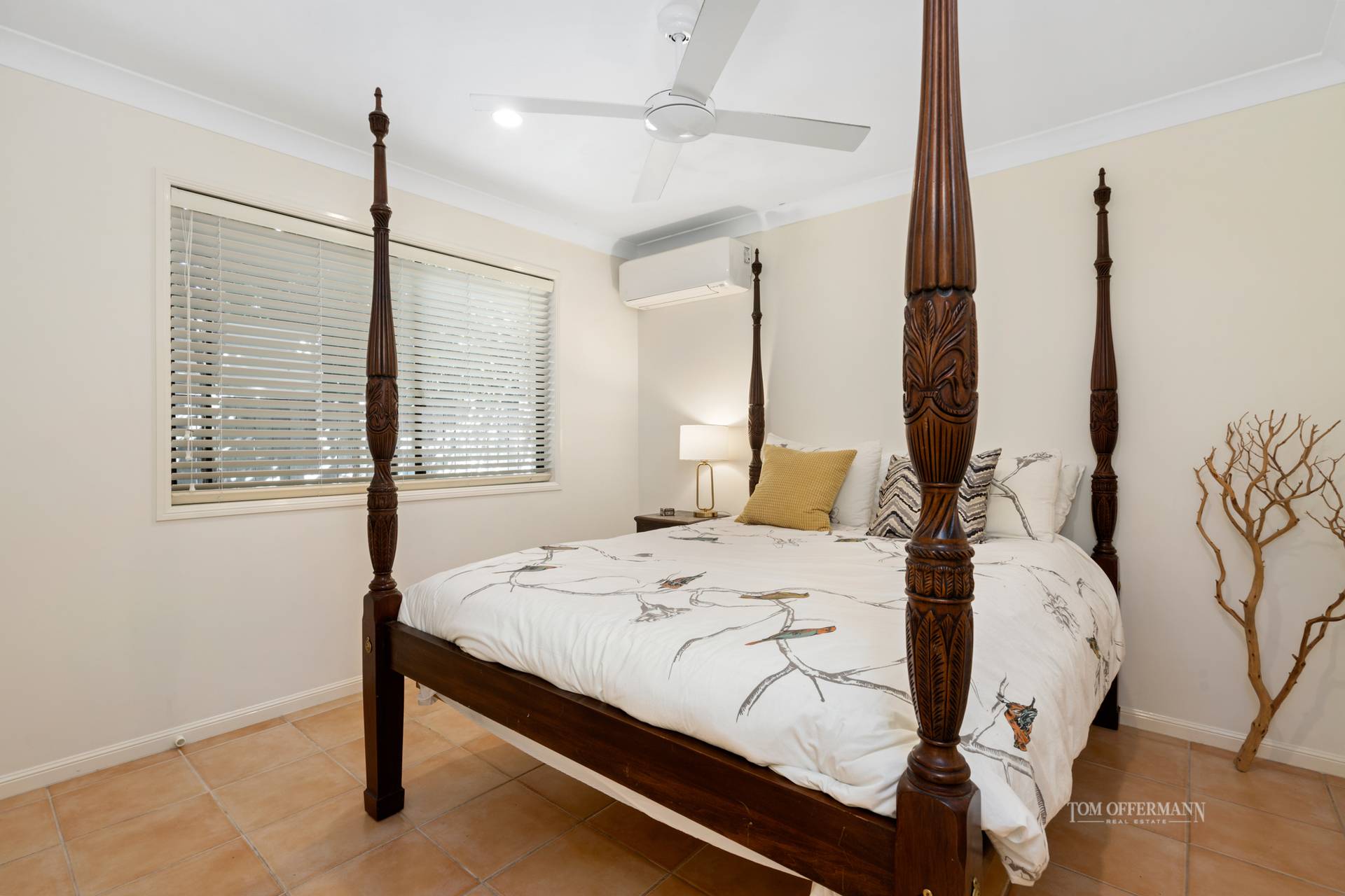 The south wing with three queen-size bedrooms is all about serious dream time. Two have built-in robes, one also has bookcases and looks out to pool. All share the sandy hued and white tiled main bathrooms with bathtub and shower. A separate WC is next to a white-tiled laundry with plenty of storage.
