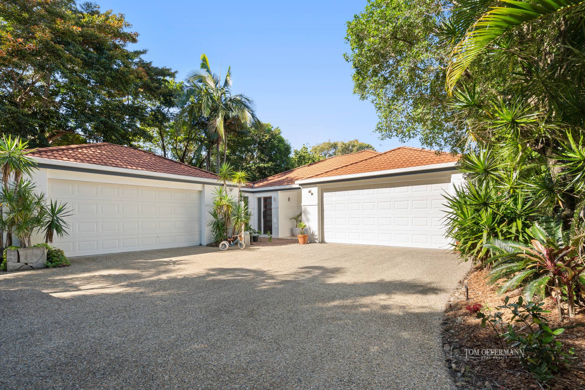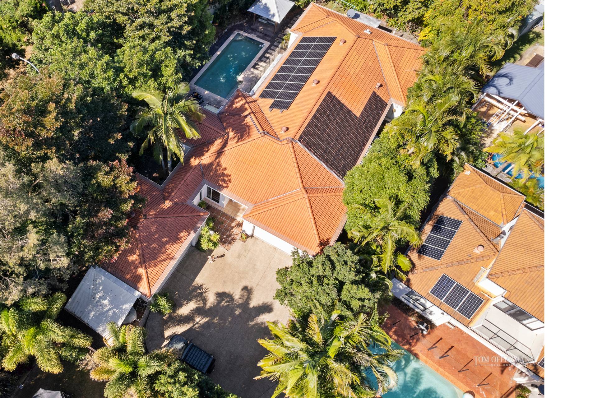 Exterior: solar panels 6.66kW installed 2021; pool solar heating installed 2006; murraya-hedged driveway; irrigation; rear garden w palms, dracaenas, natives