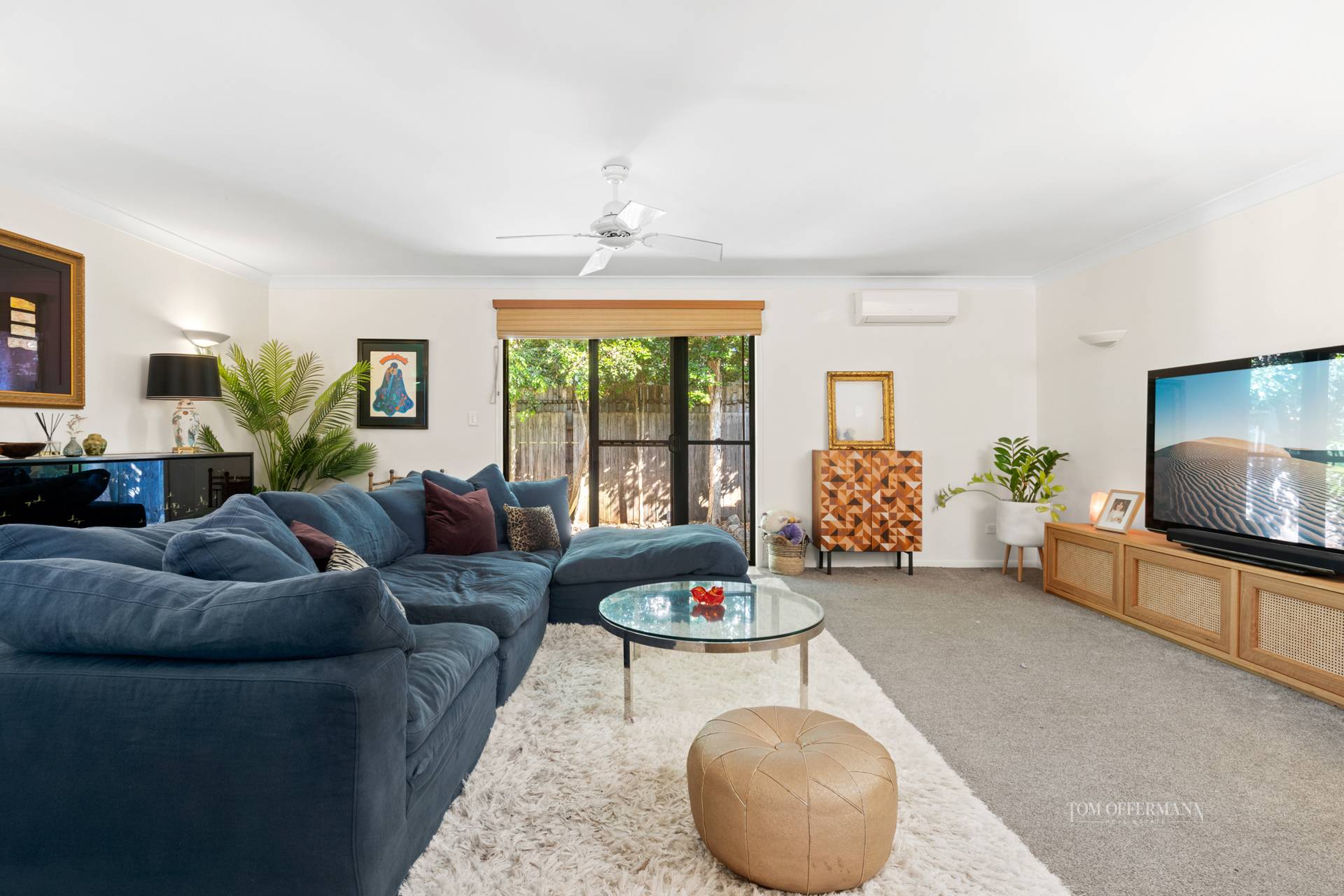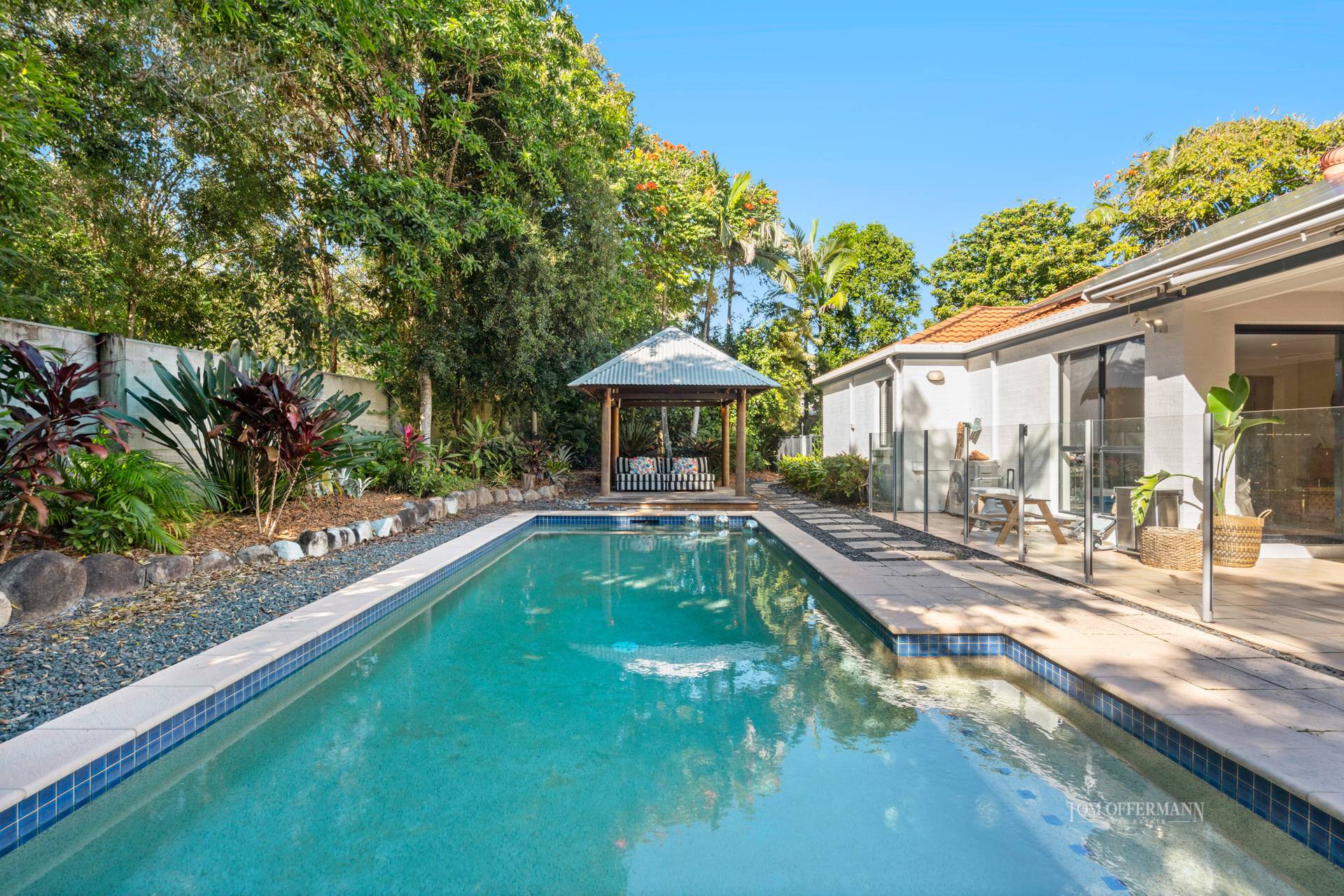 Several steps forward and the residence widens to its full width. Eyes are naturally drawn to the open plan living spaces. They seemingly meld thanks to slide-away doors to a terrace on the eastern side, which for all seasons and all reasons for entertaining, is under-roof. It continues nearly two sides of the pool, with a cabana and pet-friendly garden fringed by established palms, dracaenas and natives, adding the suggestion of fun in the sun or the shade.