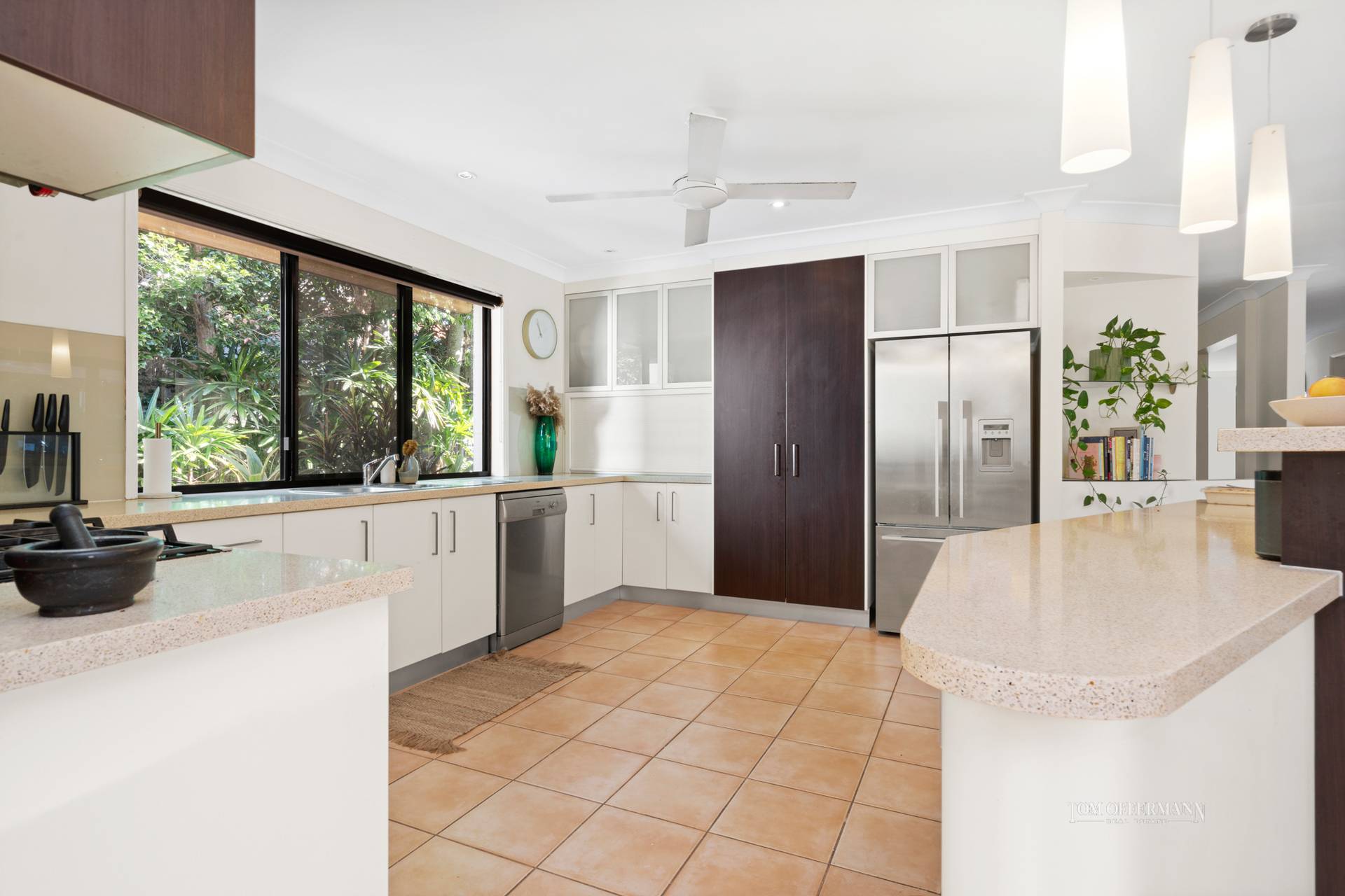 The hub of indoors is the kitchen. With stone-topped cream cabinetry including an ellipse-shaped island with snazzy pendant lights, it is sure to please any culinary whizz.