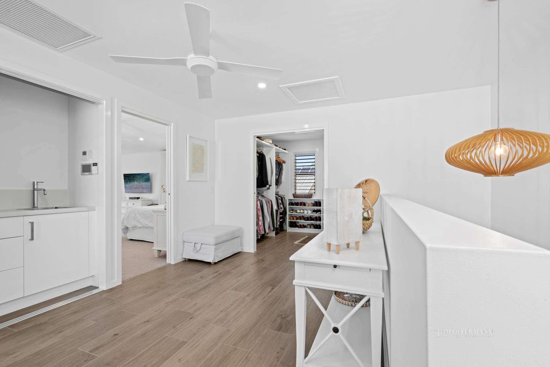 When it comes to lifestyle and design this residence hits the high notes between spectacular and practical including dreamtime. Upstairs the oversize king master suite, gabled ceiling, ensuite with double shower and vanities, sitting room and of-so-wide terrace, with those magical northerly river views, visible whether in bed or bubbling away the blues in the free-standing bathtub. Fashionistas will adore the big walk-in wardrobe, and to save popping downstairs for a tea, coffee or sunset bubbles, arguments are settled forever, as there's a very thoughtful addition of a hideaway kitchenette in a dedicated leisure/office area.