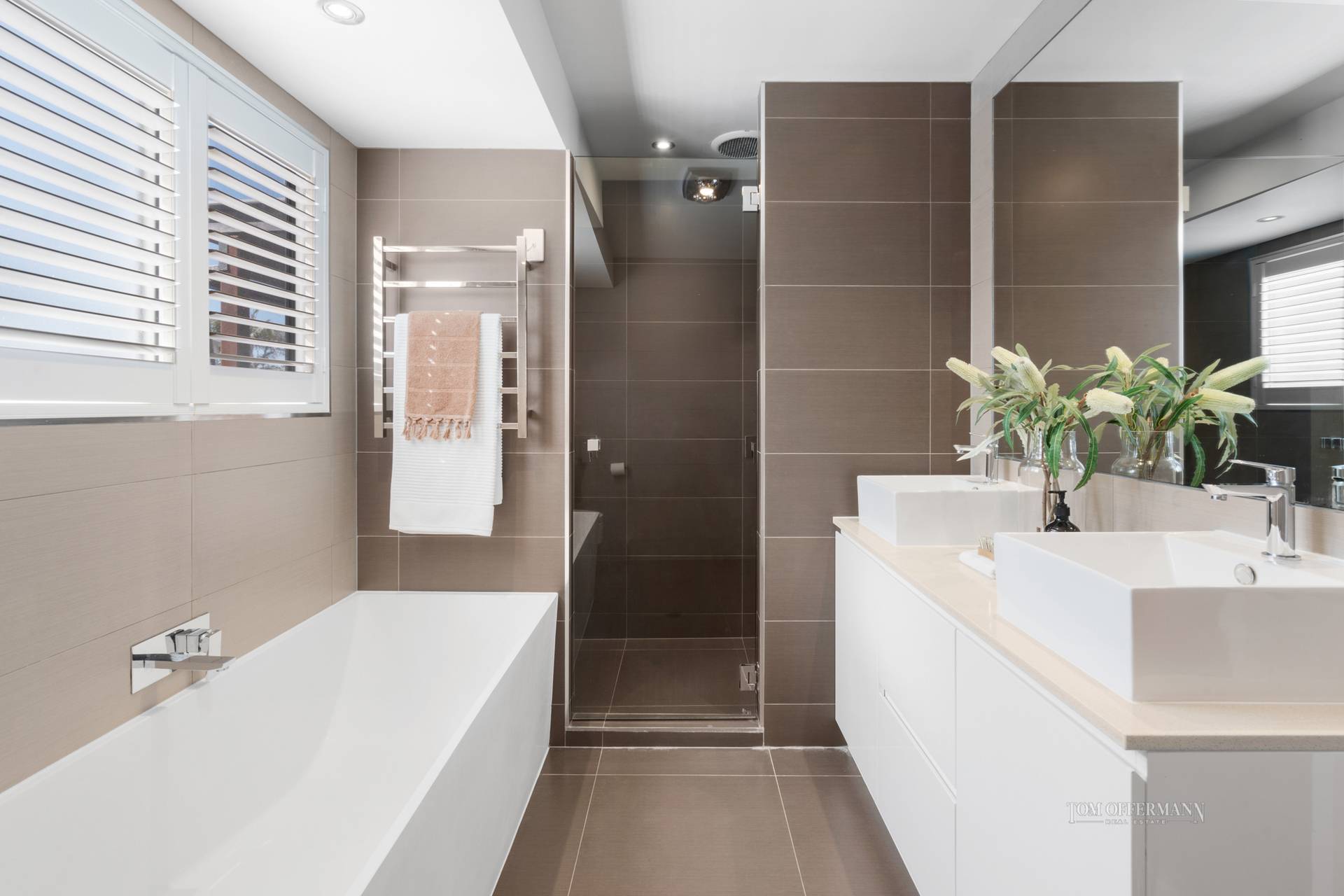 Three large bedrooms on this level have sheer window treatments and share a family bathroom with two-tones of grey tiles, a square stone bath, complemented by two square vanity basins, plus there is a walk-in shower.