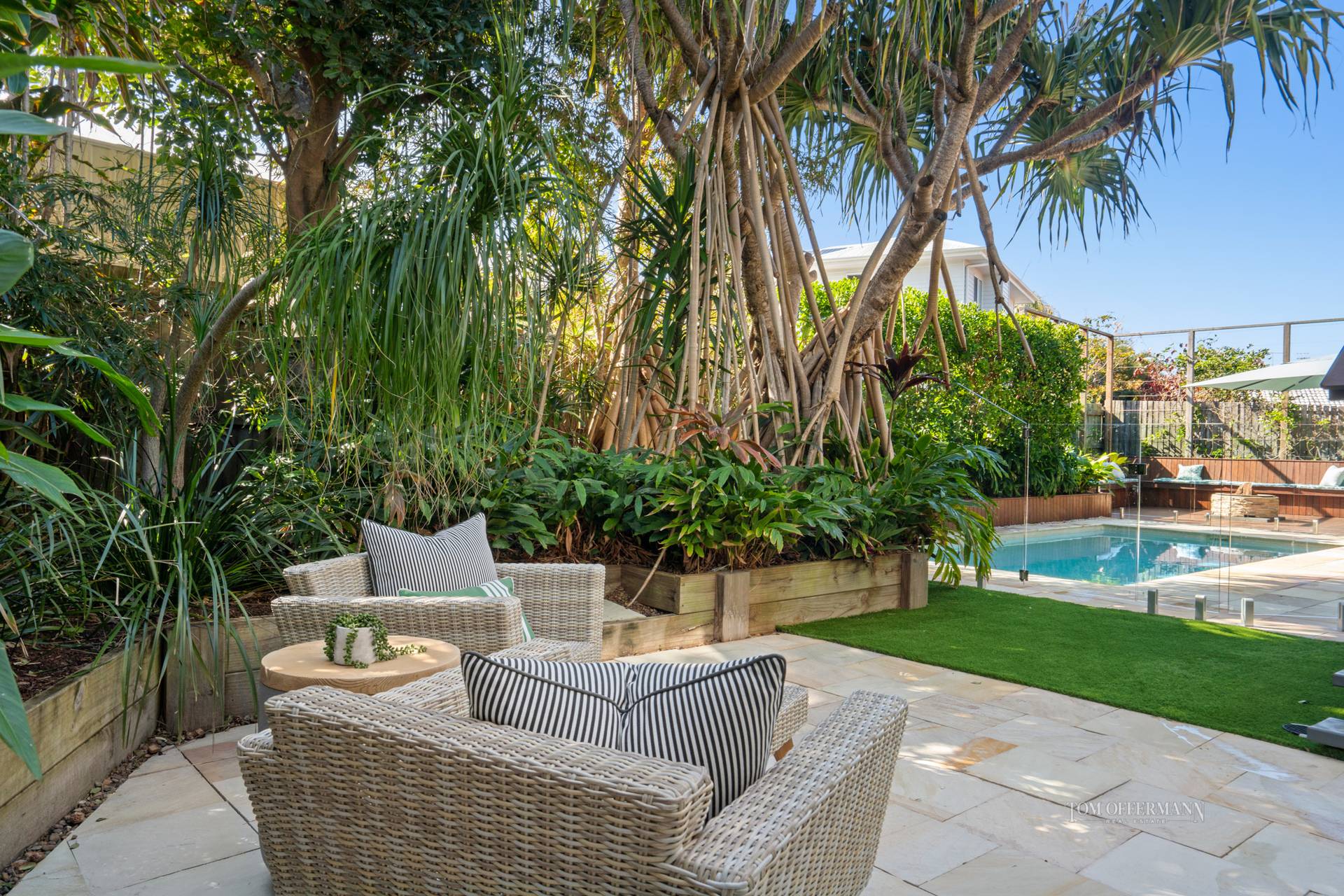 The kid-friendly rear garden, with tropical plants, shimmering pool and sandstone coping, maintenance-free 'grass', a trampoline, custom deck with seating around the fire pit or top with stone for a summer table, is totally dedicated to the good times. Just in case, in a shady corner is yet another entertaining option.