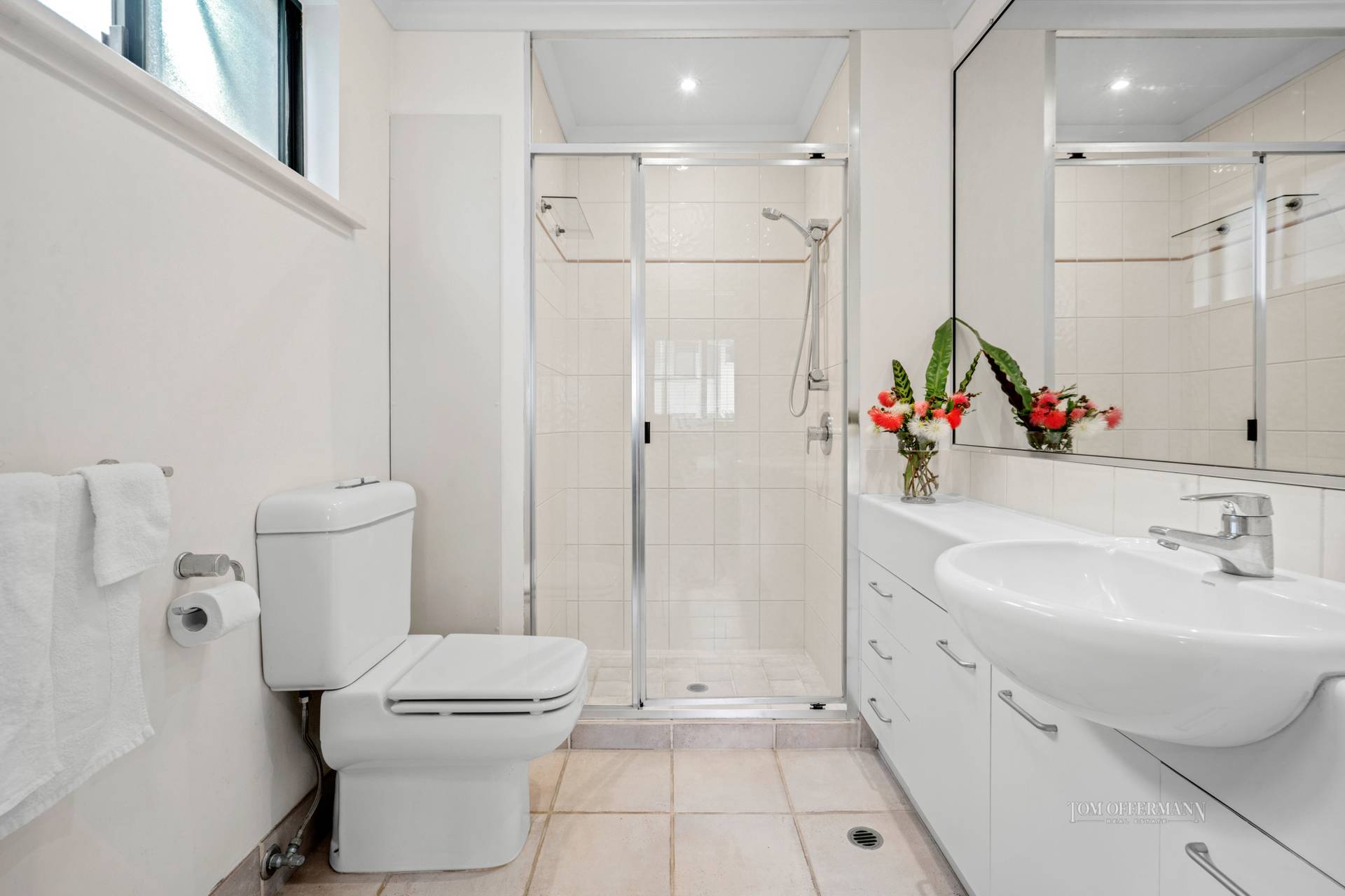 - About: level 1, sandy-hued tiled open plan living/dining; coffered ceilings; w 58" latest smart TV + entertainment unit; venetian blinds; suede modular lounge; glass-topped dining table w 4 white chairs; oak-toned timber flooring in bedrooms; king size master bedroom w walk-in robe & ensuite; twin bedroom w robe; main bathroom cream-tiled with bath, sep toilet; laundry Indesit washer + Fisher & Paykel dryer; aircon/fans; single dedicated car parking with large lock-up store